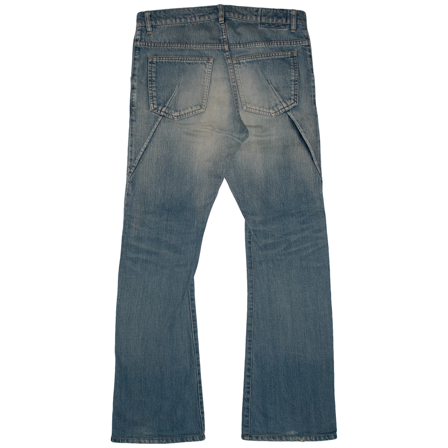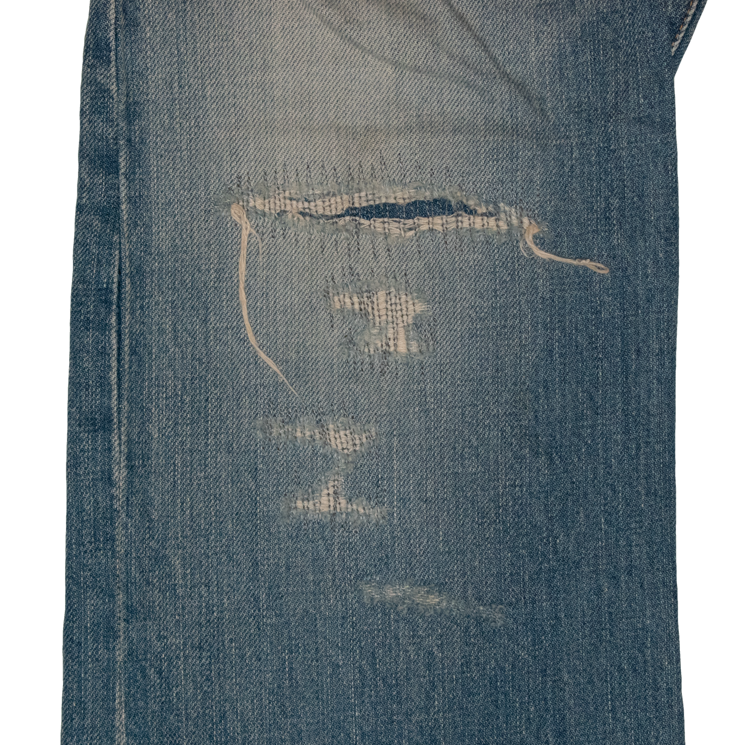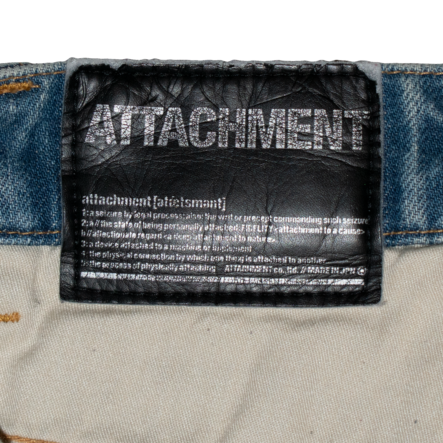 Here we have an incredible pair of denim from the Japanese brand ATTACHMENT. This pair of 4-pocket denim features an elegantly faded mid-wash, darted detailing along the back pockets, a slightly flared silhouette, and instances of quality distressing repairs throughout. Based on the brand's mission, you can’t go wrong with this high-quality pair of denim from the Japanese brand ATTACHMENT.