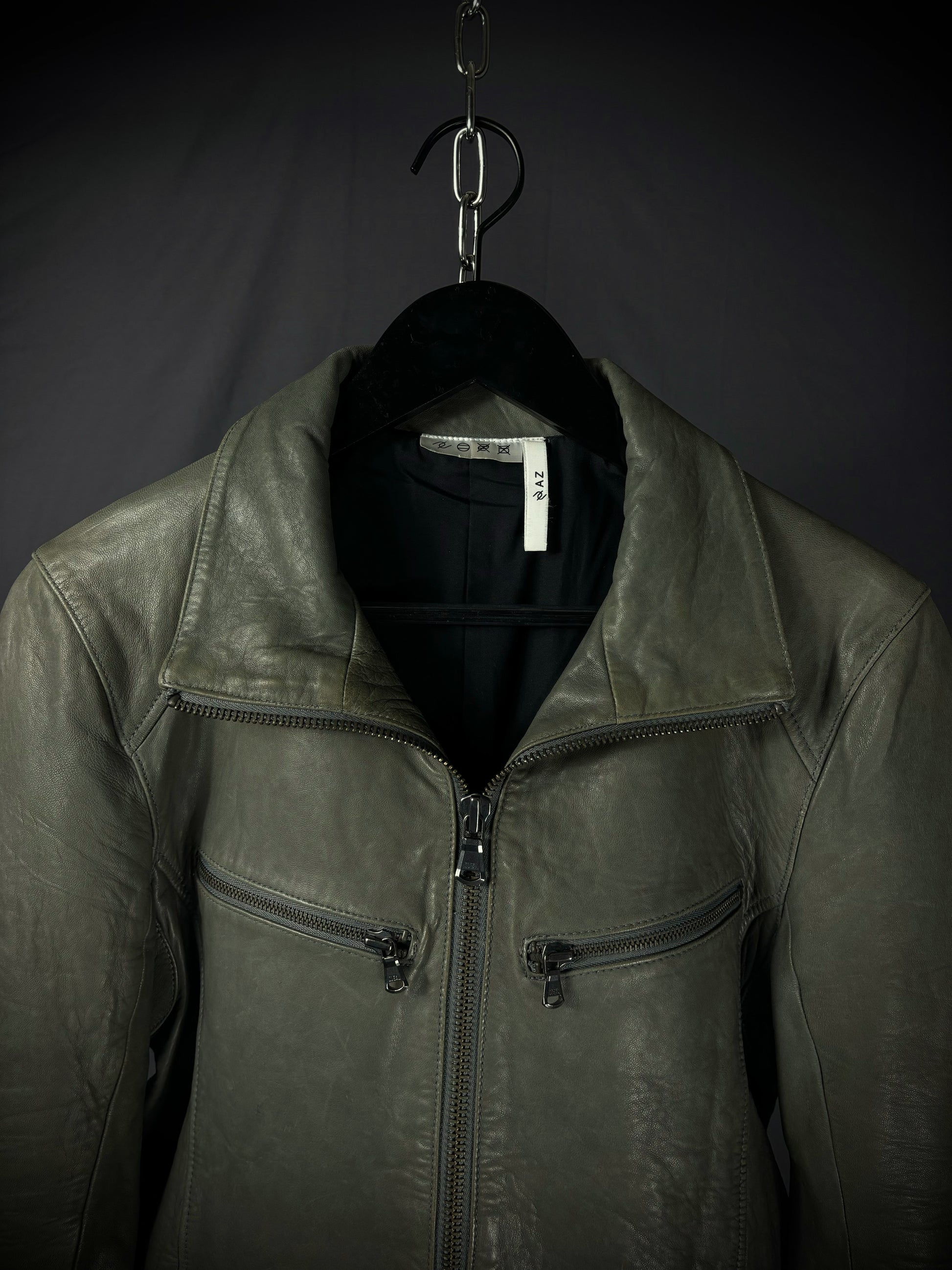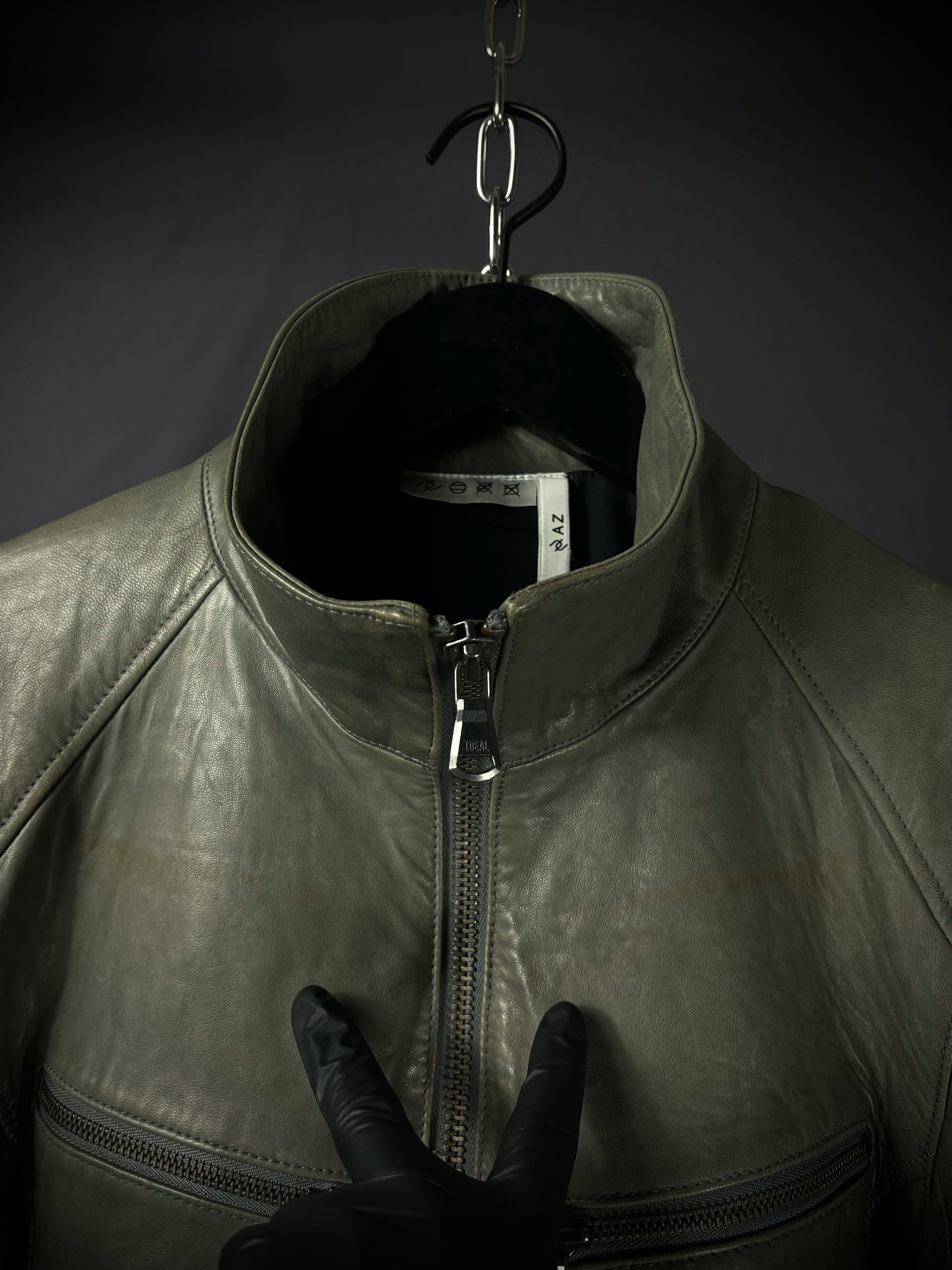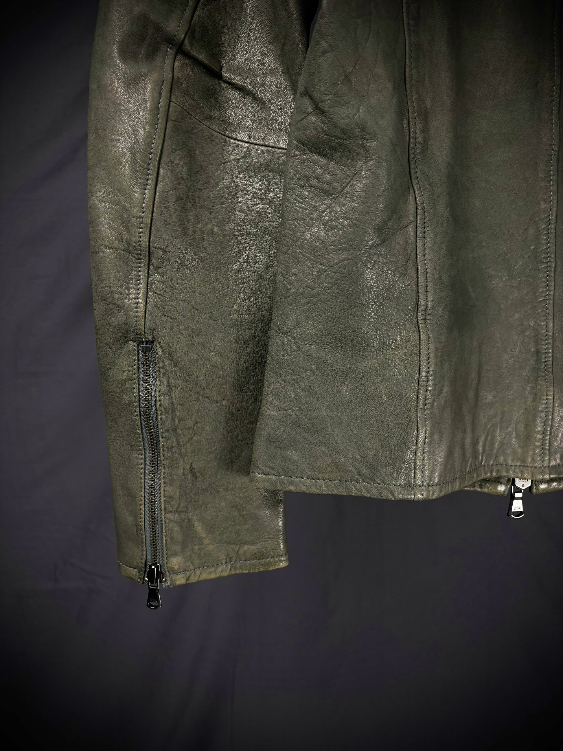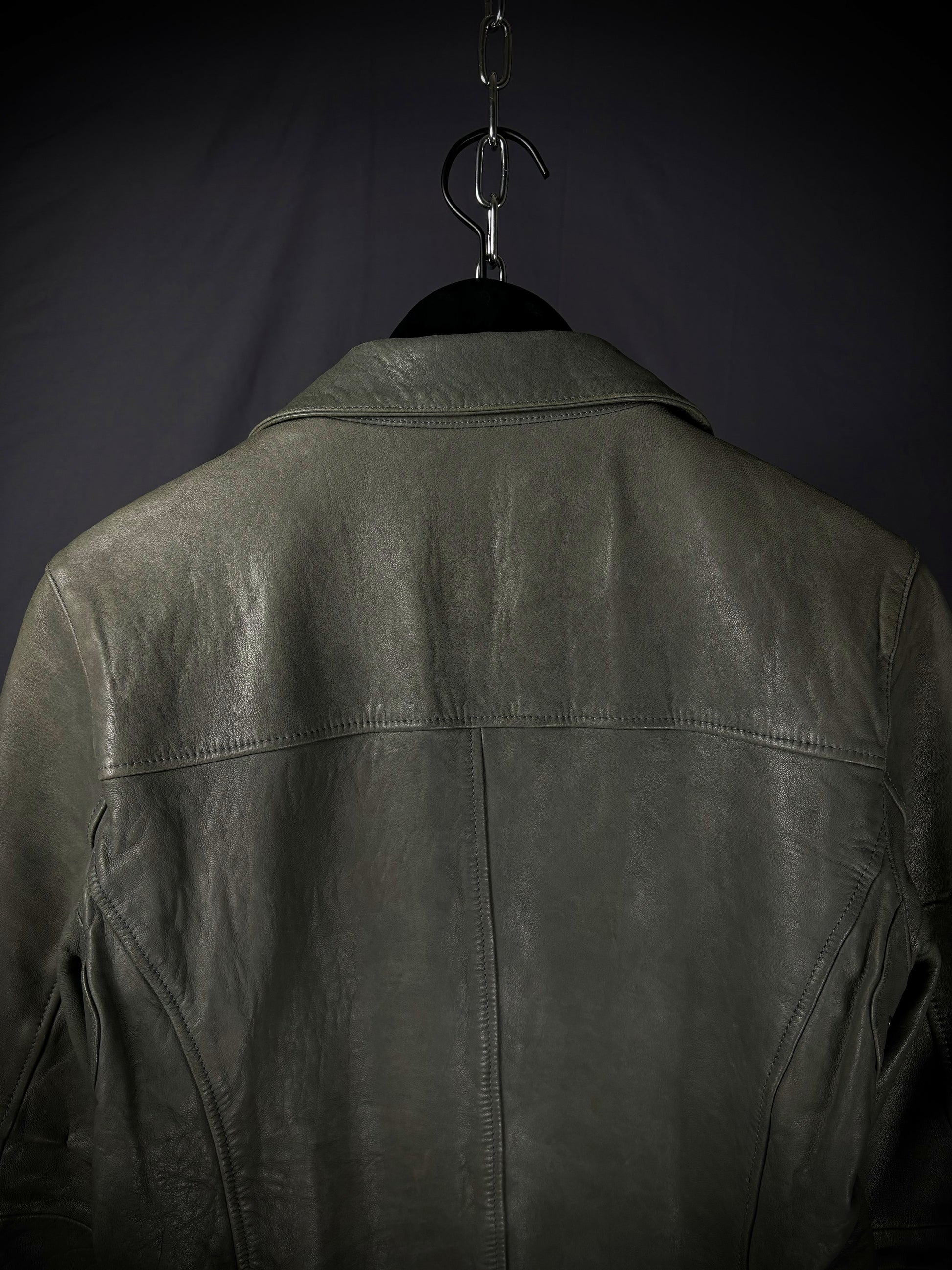 This rider’s jacket by the Japanese brand AZ by junhashimoto is crafted from supple sheepskin in a muted gray with a distinct earthy green hue. It features traditional seam detailing along the back and sleeves, providing a structured yet flexible fit. The garment is equipped with four front zippered pockets and matching zippered cuffs for a classic look. Its natural leather grain and subtle wear add depth to the color, making it a refined take on a timeless silhouette.
