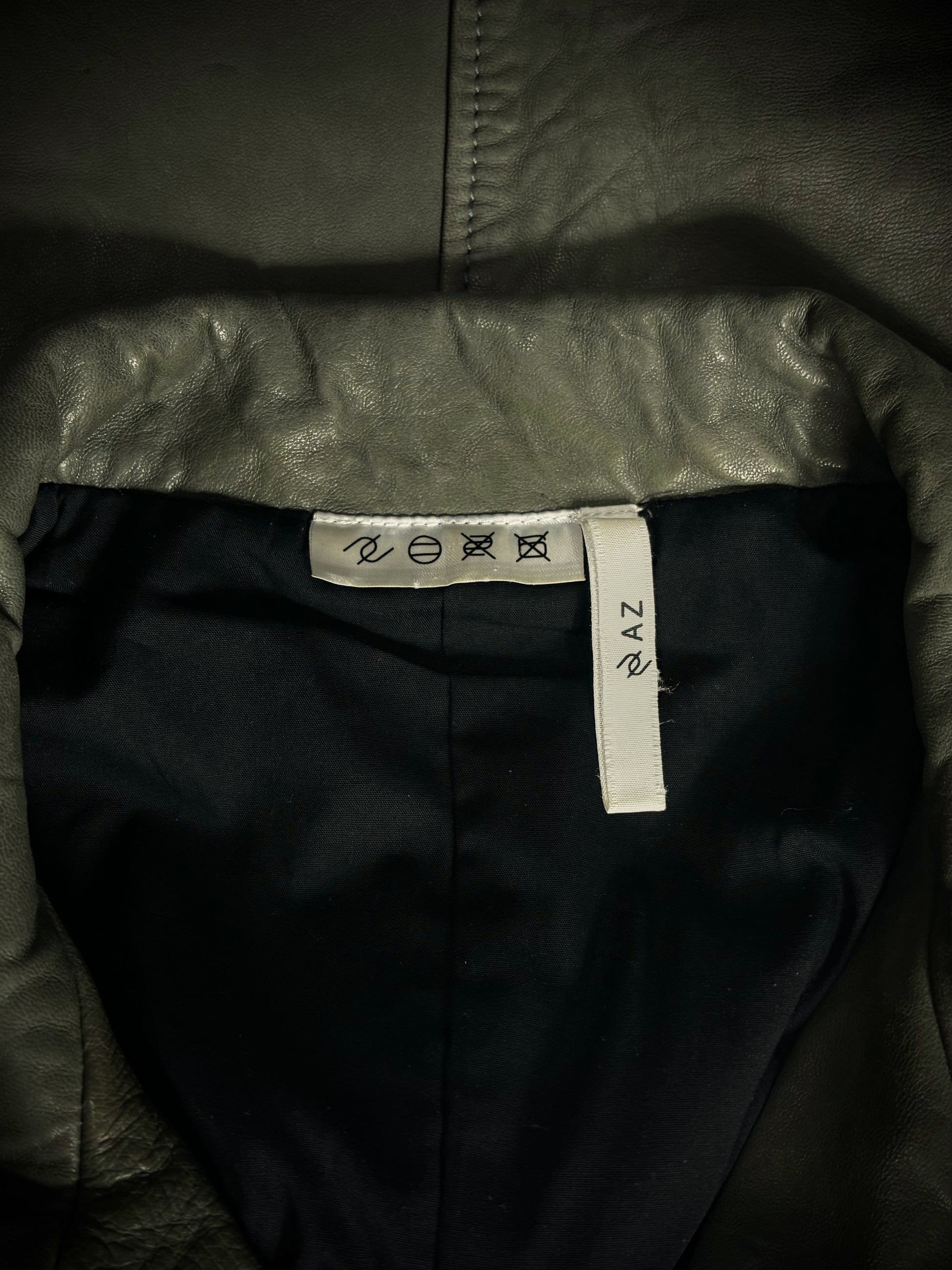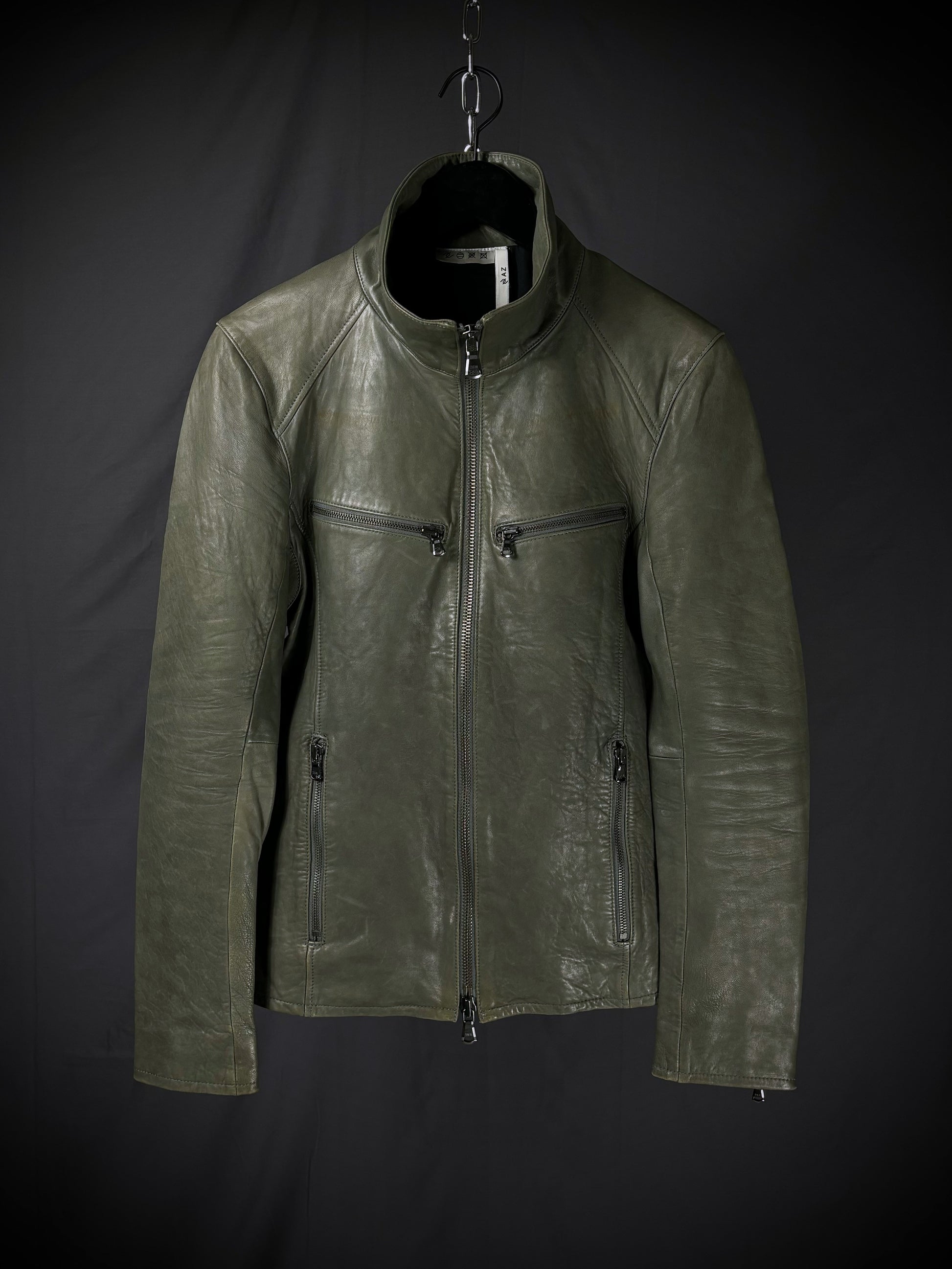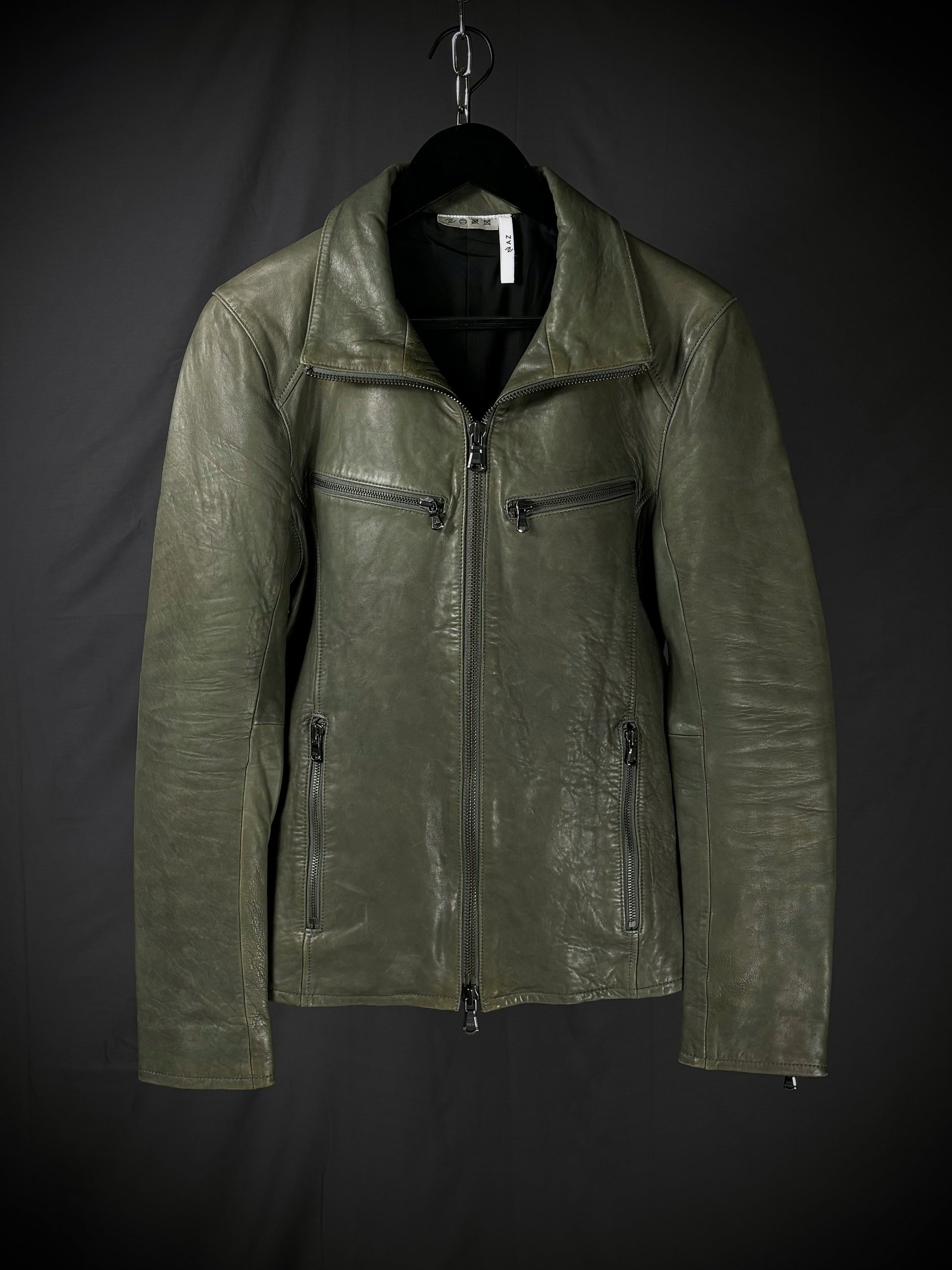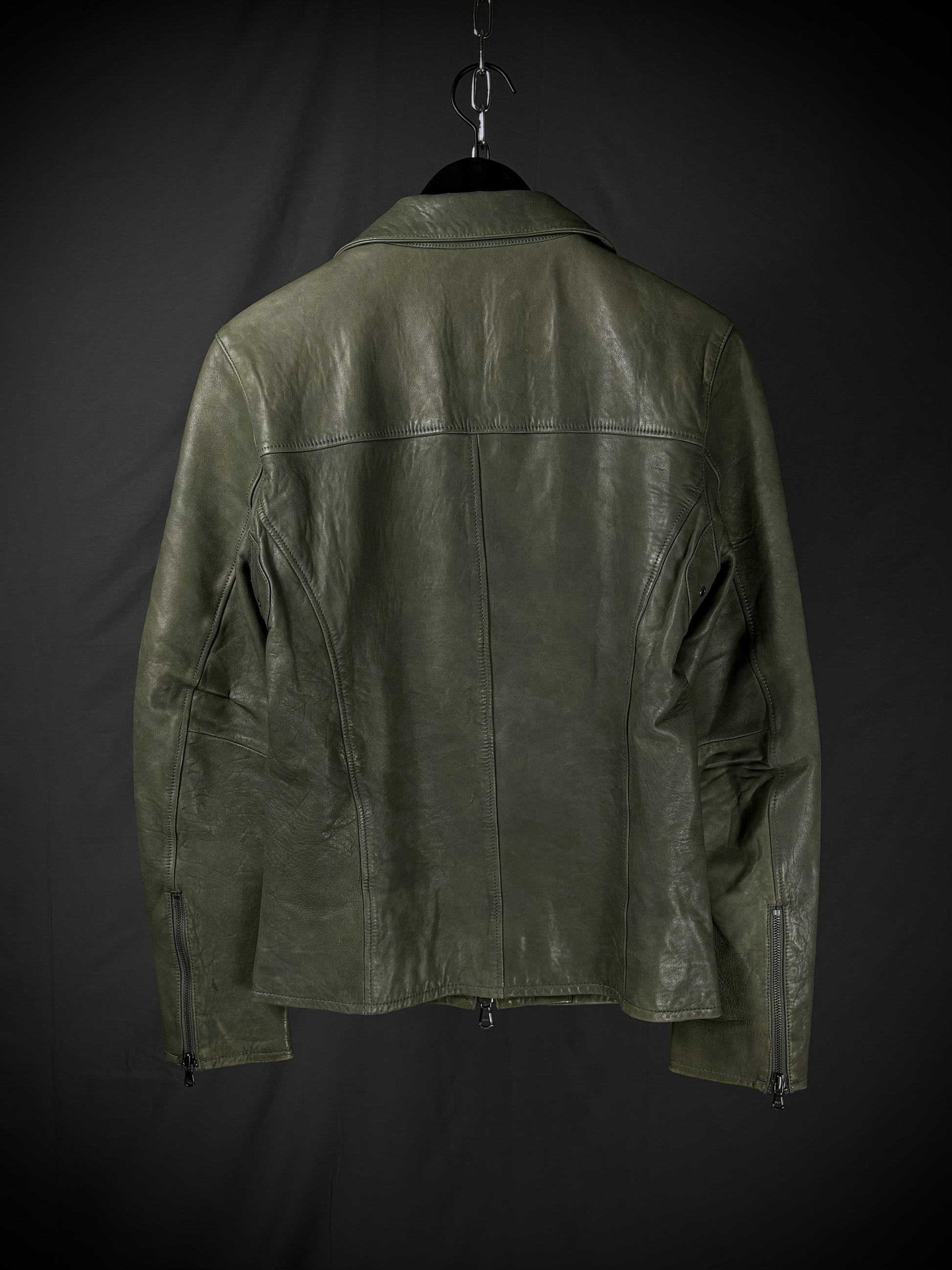 This rider’s jacket by the Japanese brand AZ by junhashimoto is crafted from supple sheepskin in a muted gray with a distinct earthy green hue. It features traditional seam detailing along the back and sleeves, providing a structured yet flexible fit. The garment is equipped with four front zippered pockets and matching zippered cuffs for a classic look. Its natural leather grain and subtle wear add depth to the color, making it a refined take on a timeless silhouette.