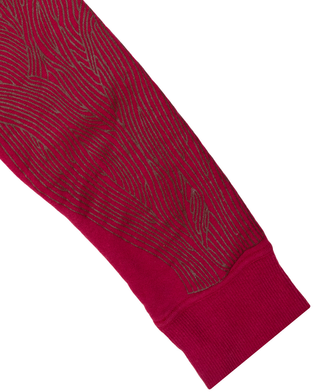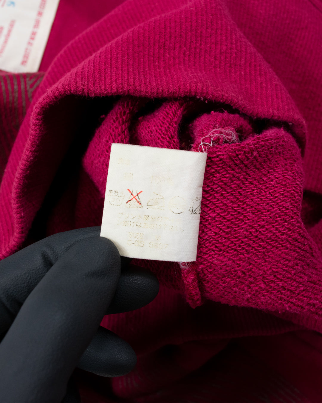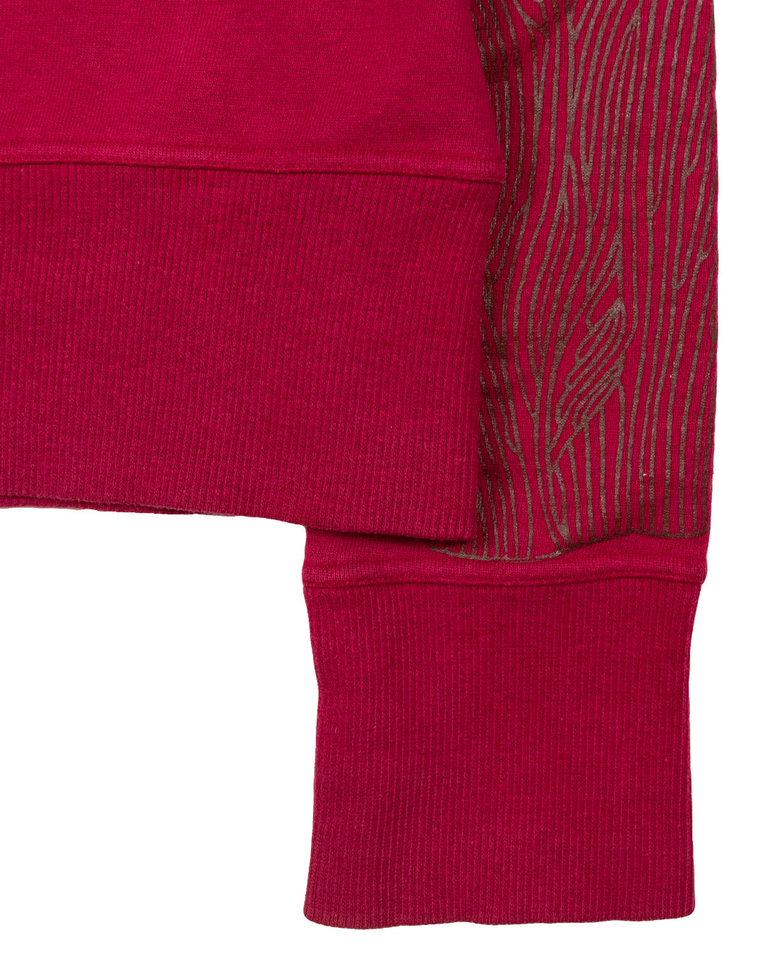 Here we have a unique crewneck sweatshirt from the Japanese brand Beauty:Beast. This piece features a unique insect-like wing motif screen-printed along both arms in a glossy gold color that contrasts exceptionally well with the dark red French Terry garment. This piece also includes an inverted branded label placed atop the back of the garment just below the neckline.