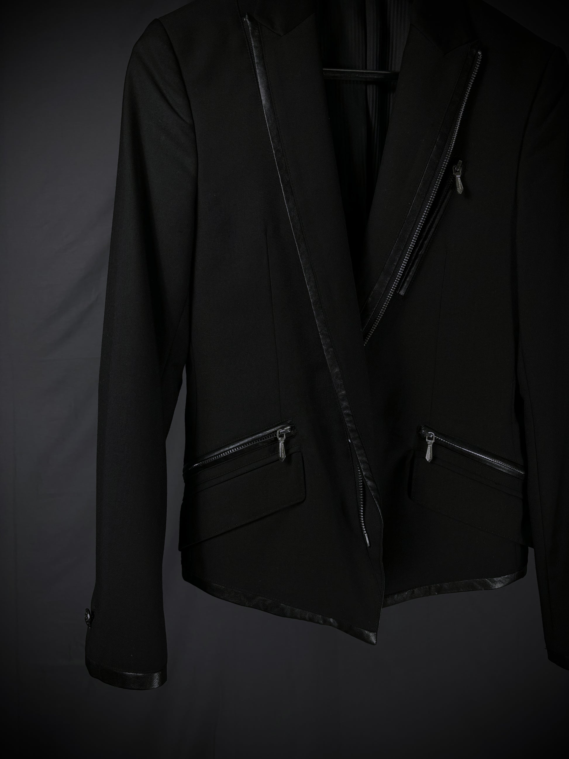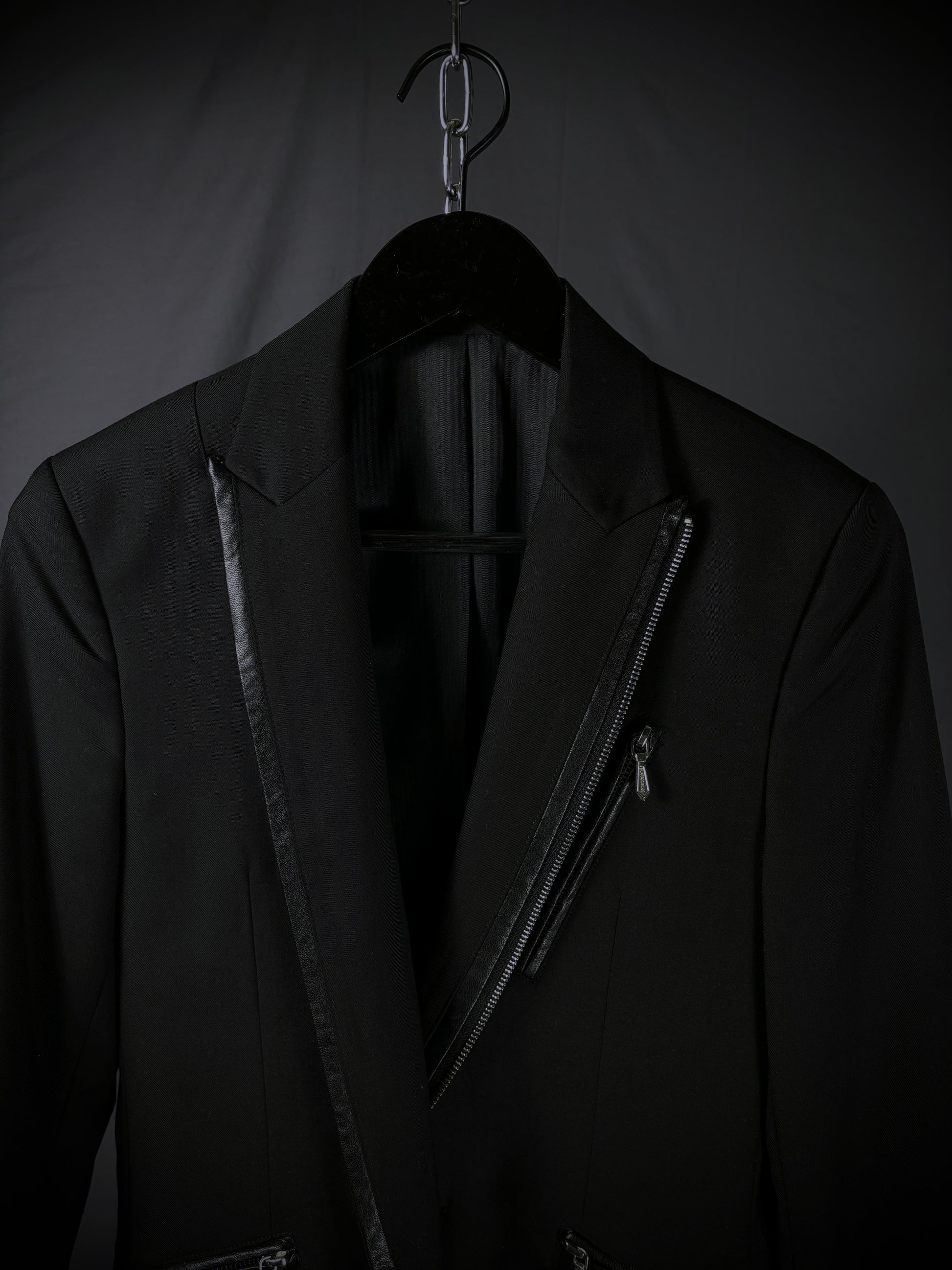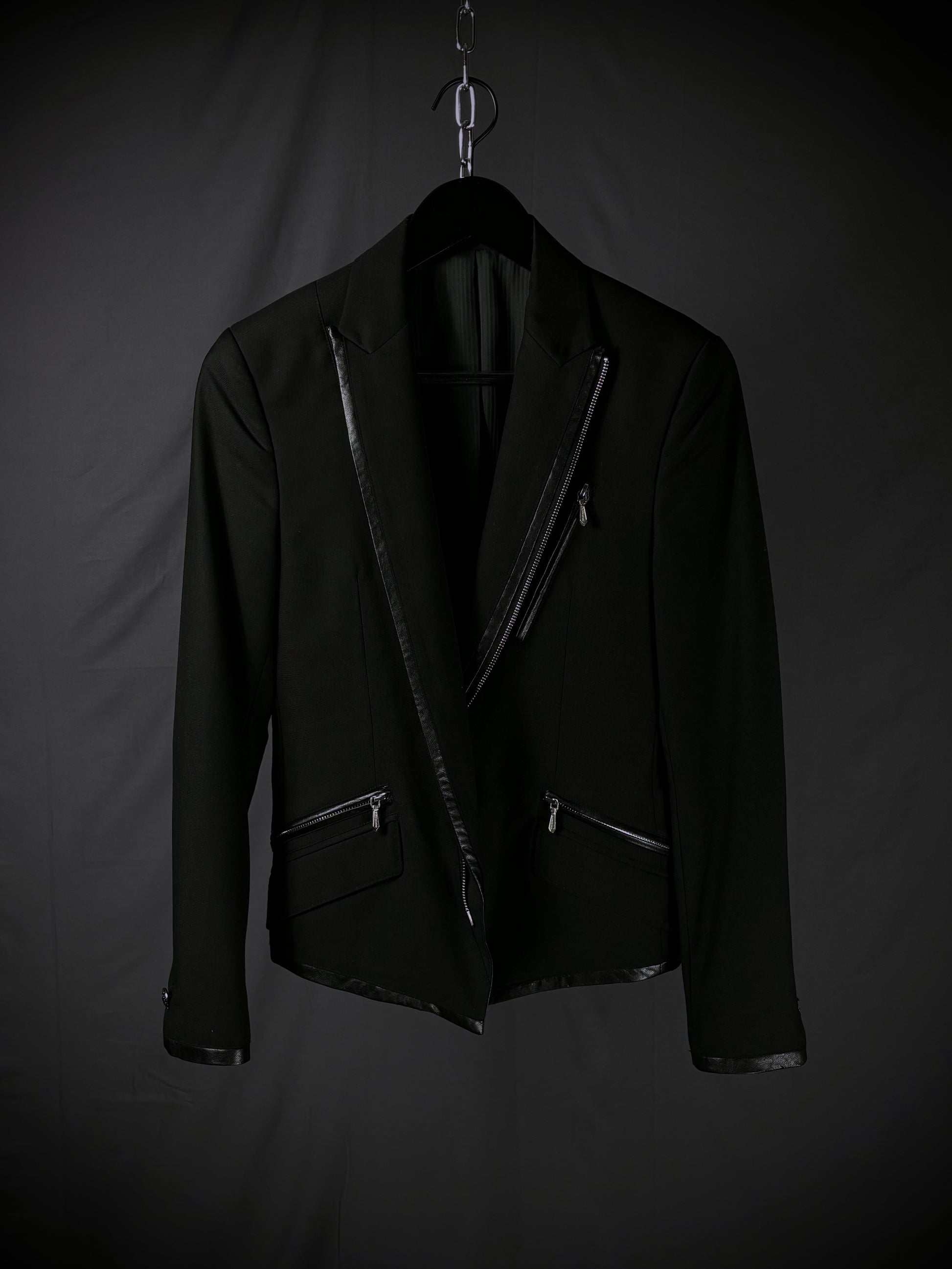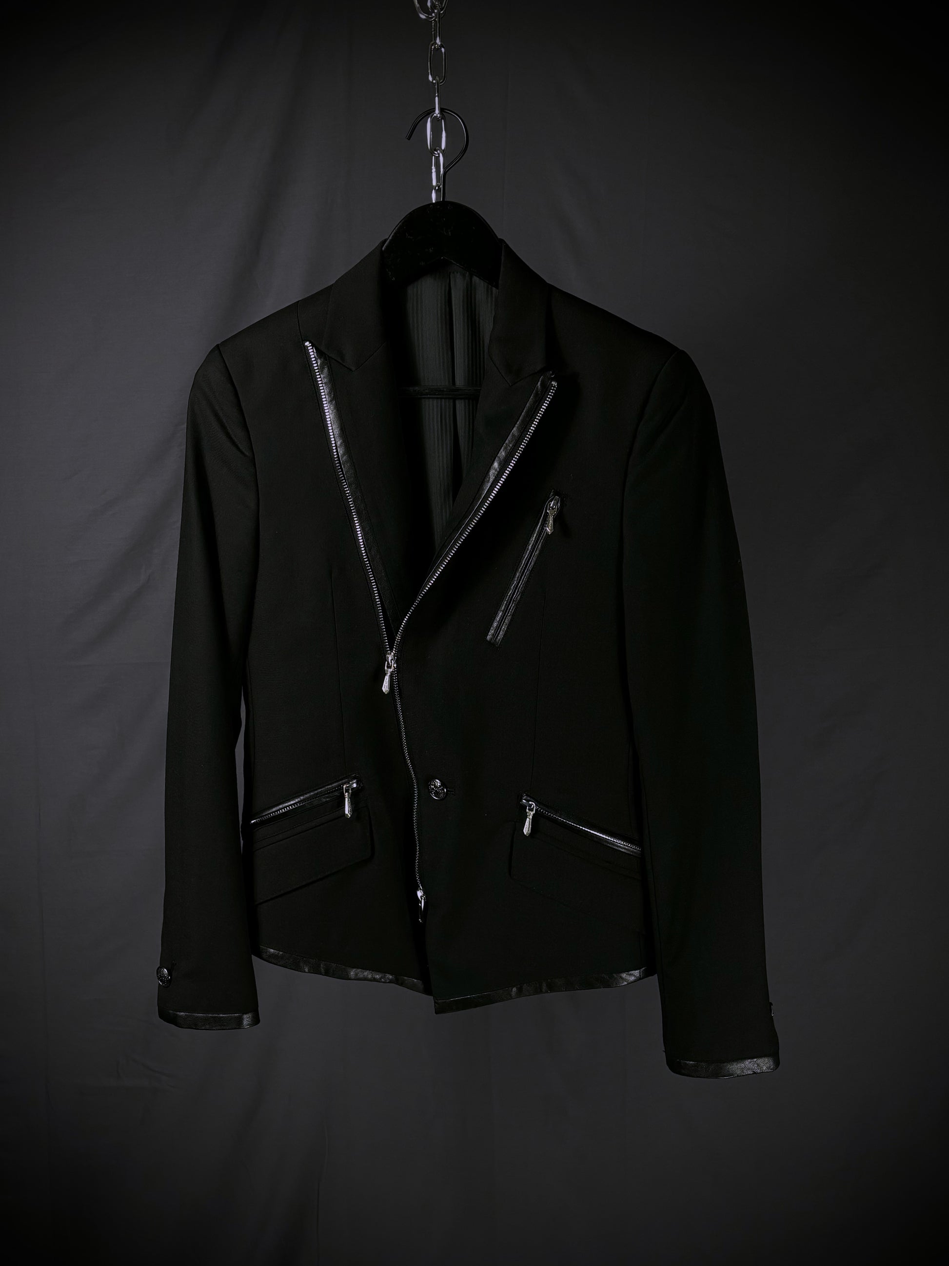 This blazer from the Japanese brand Buffalo Bobs reinterprets classic tailoring through a rider-jacket lens. It features notched lapels and a fitted silhouette, contrasted by a bold asymmetrical front zipper reminiscent of vintage motorcycle jackets. Branded zippered chest and mock waist pockets with metal hardware further emphasize the moto influence, while subtle faux leather trim along the lapels, pocket edges, cuffs, and hem adds texture and reinforces the biker-inspired aesthetic.