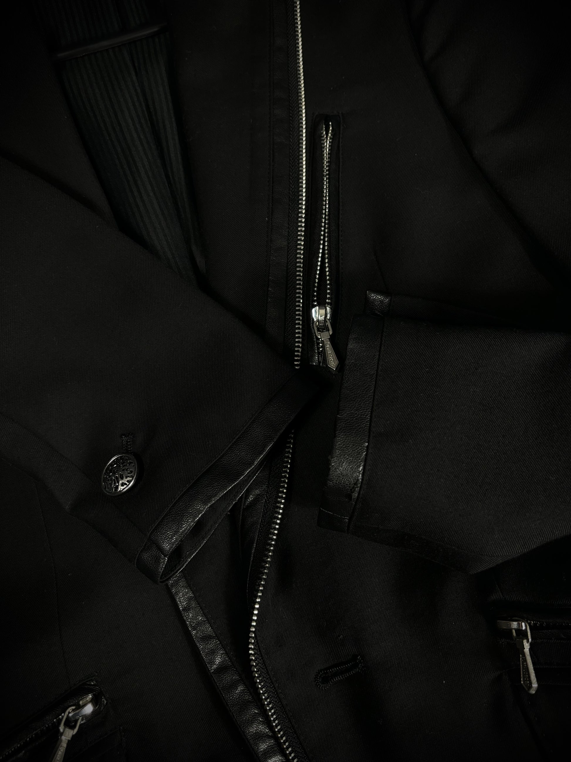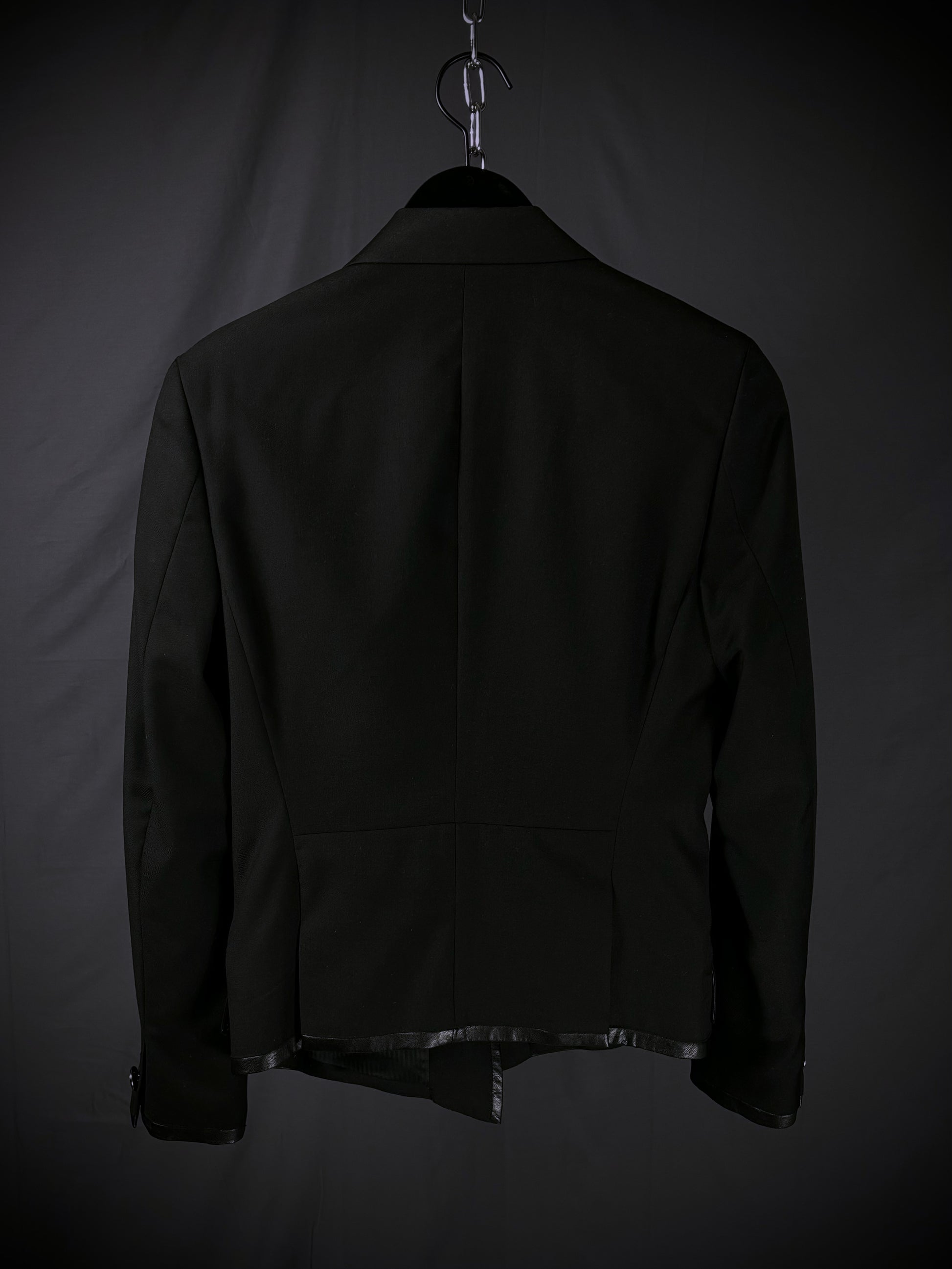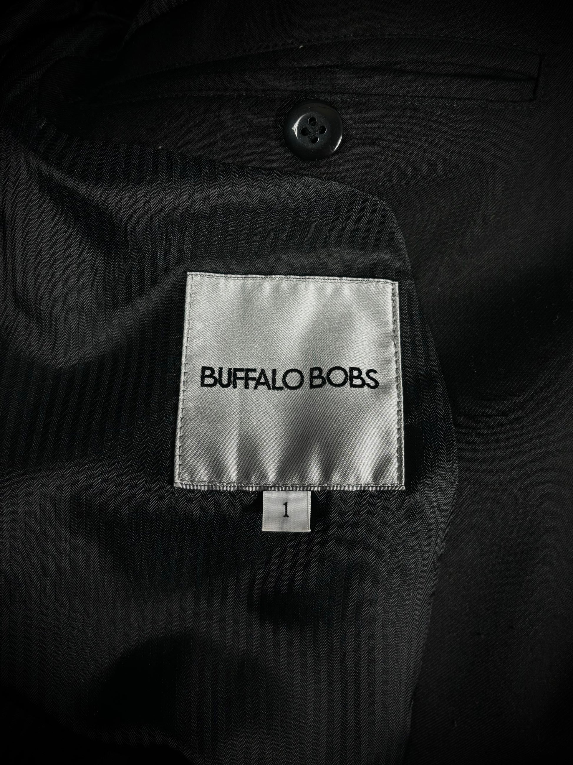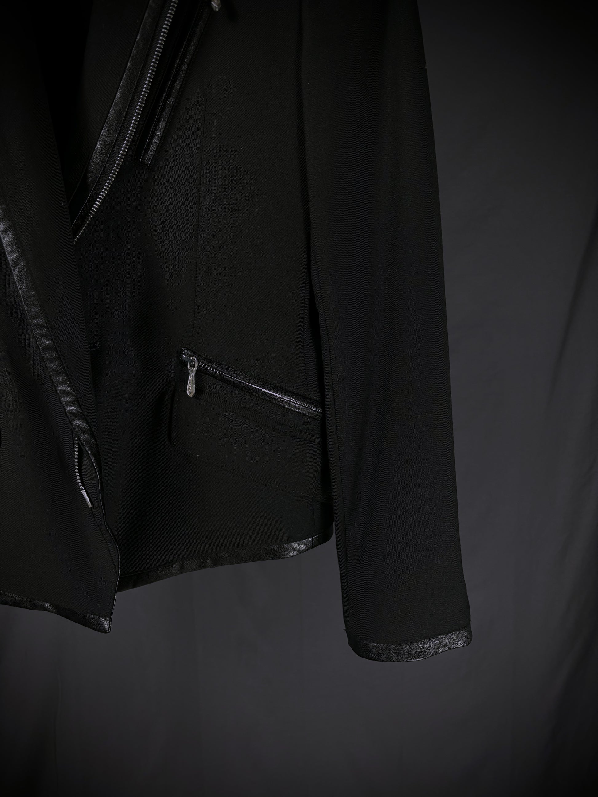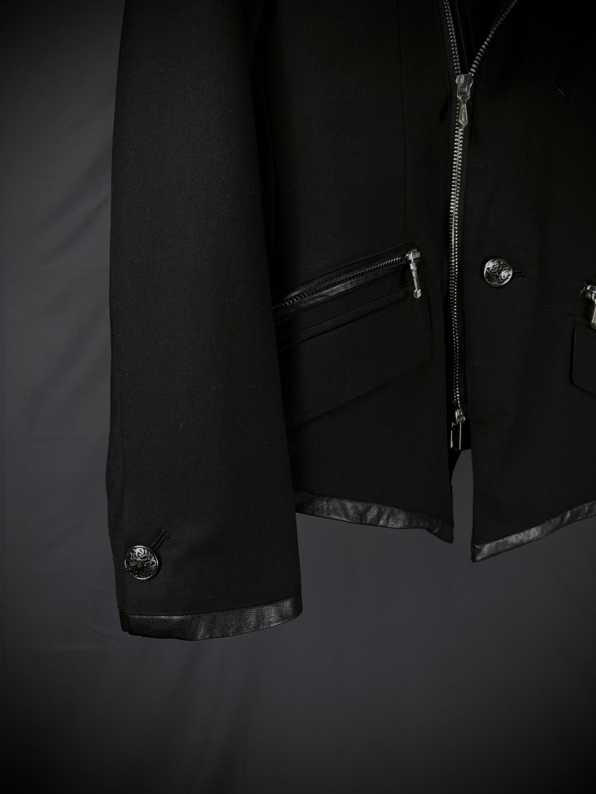 This blazer from the Japanese brand Buffalo Bobs reinterprets classic tailoring through a rider-jacket lens. It features notched lapels and a fitted silhouette, contrasted by a bold asymmetrical front zipper reminiscent of vintage motorcycle jackets. Branded zippered chest and mock waist pockets with metal hardware further emphasize the moto influence, while subtle faux leather trim along the lapels, pocket edges, cuffs, and hem adds texture and reinforces the biker-inspired aesthetic.