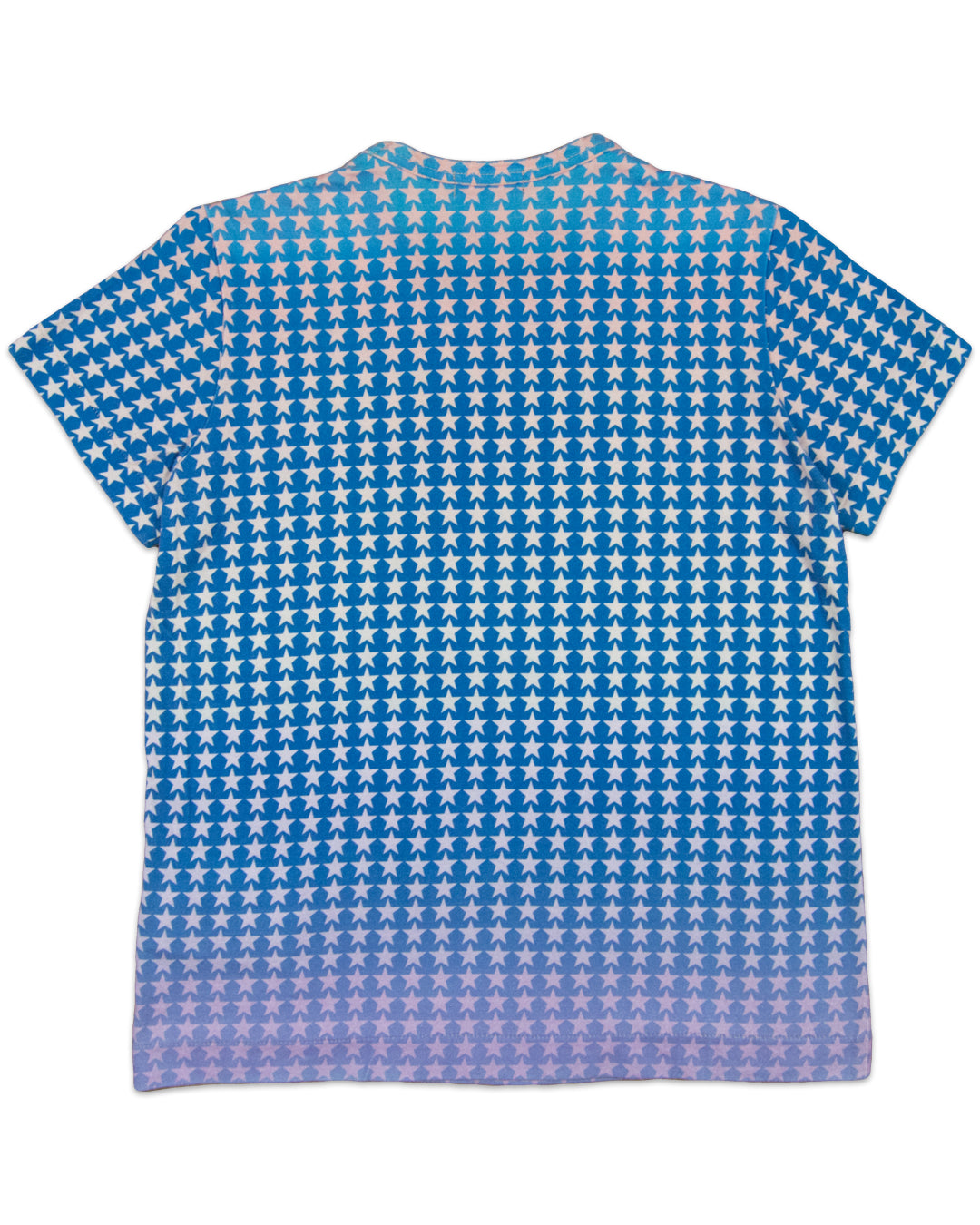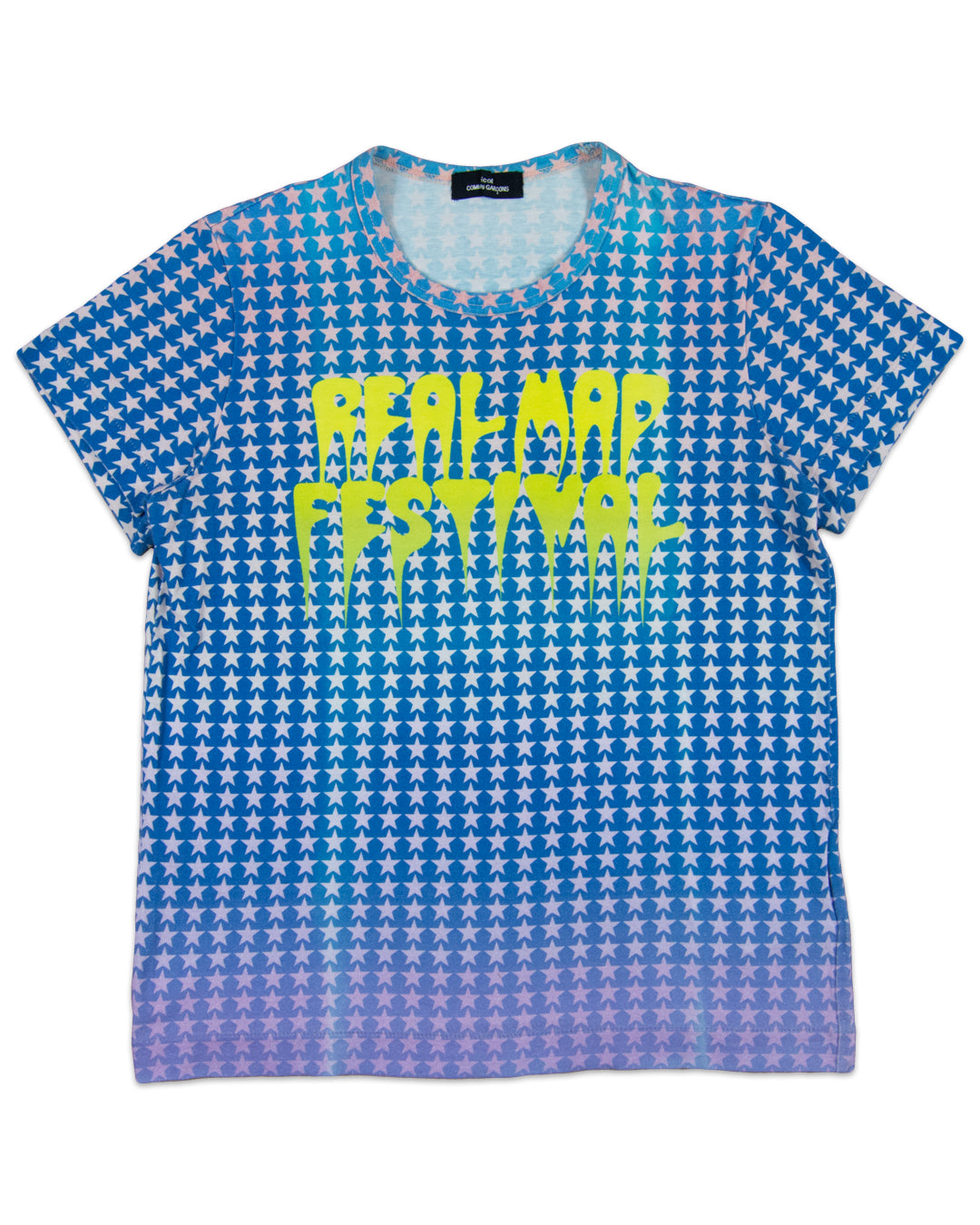 This t-shirt by Comme des Garçons Tricot from 2004 features a mesmerizing star graphic in an all-over print fashion. Encapsulated by a gradient array of lightly-hued colors paired with a vibrant neon green ‘Real Mad Festival’ typography graphic on the chest, this t-shirt from Comme des Garçons Tricot is the epitome of a statement piece!