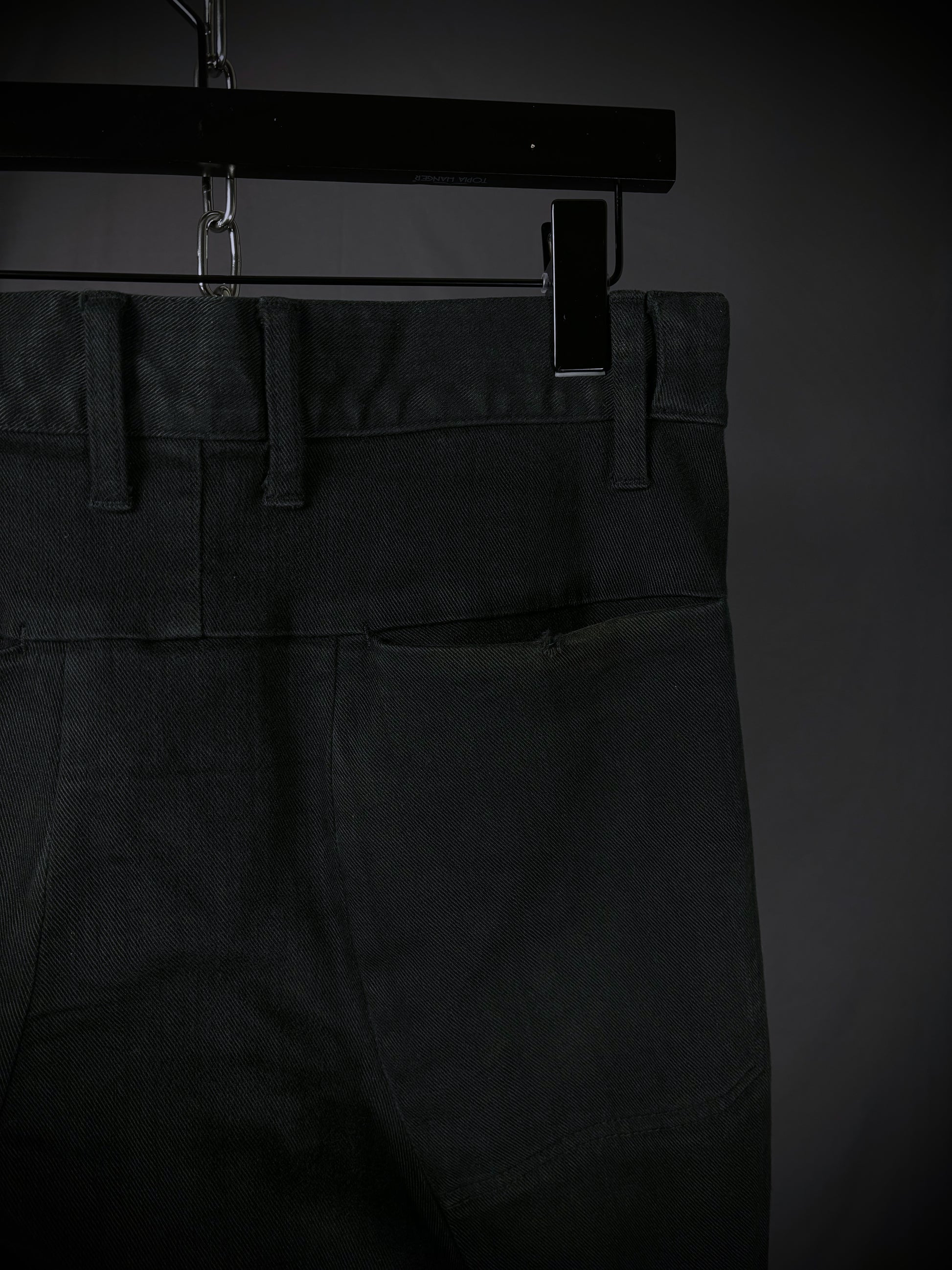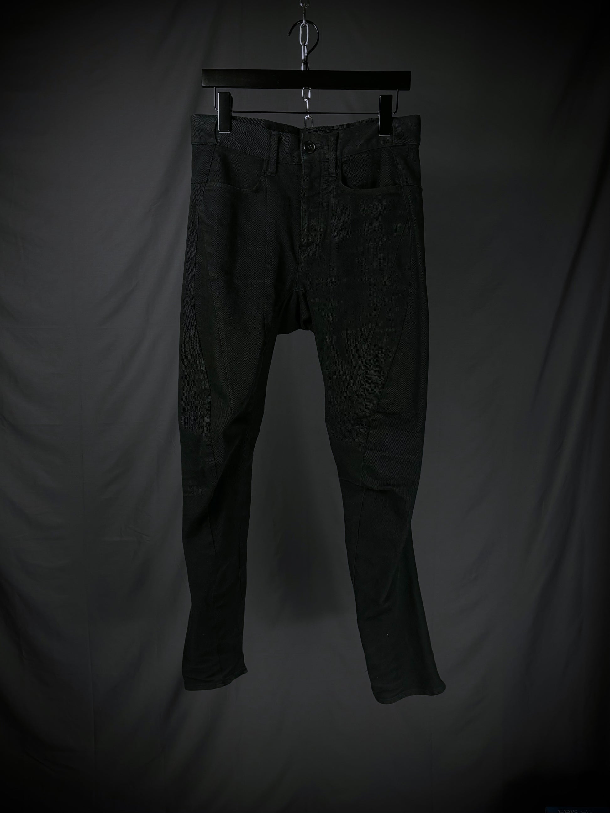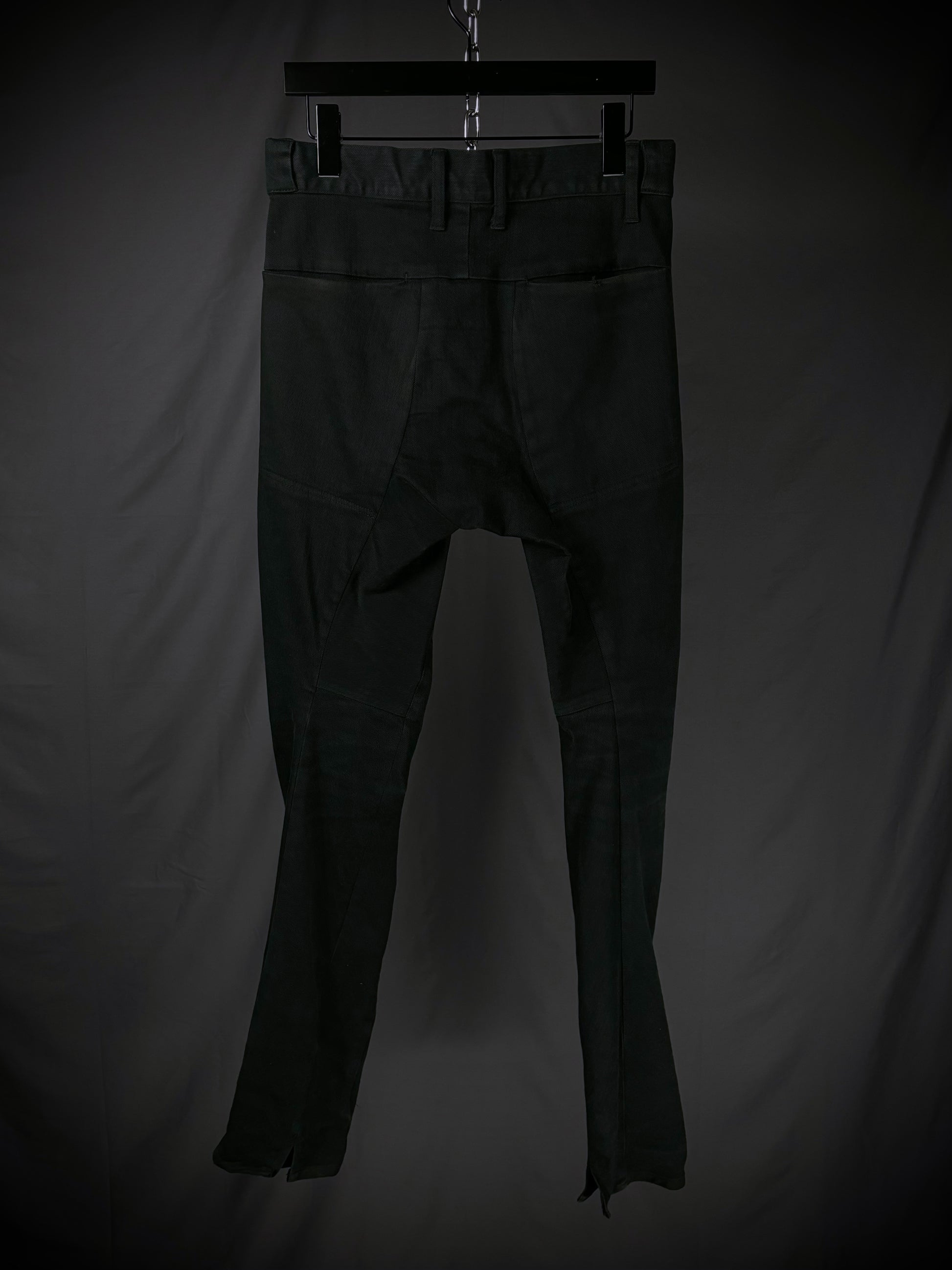 Crafted from a 95/5 cotton–polyurethane blend, this pair of D.Hygen denim features the brand’s signature anatomical twisted silhouette and a slim-to-skinny fit. The pattern incorporates complex seams and darts that spiral backward and sideways, creating a three-dimensional form. This architectural construction allows the fabric to collapse into sharp, sculptural stacks and organic creases when worn.