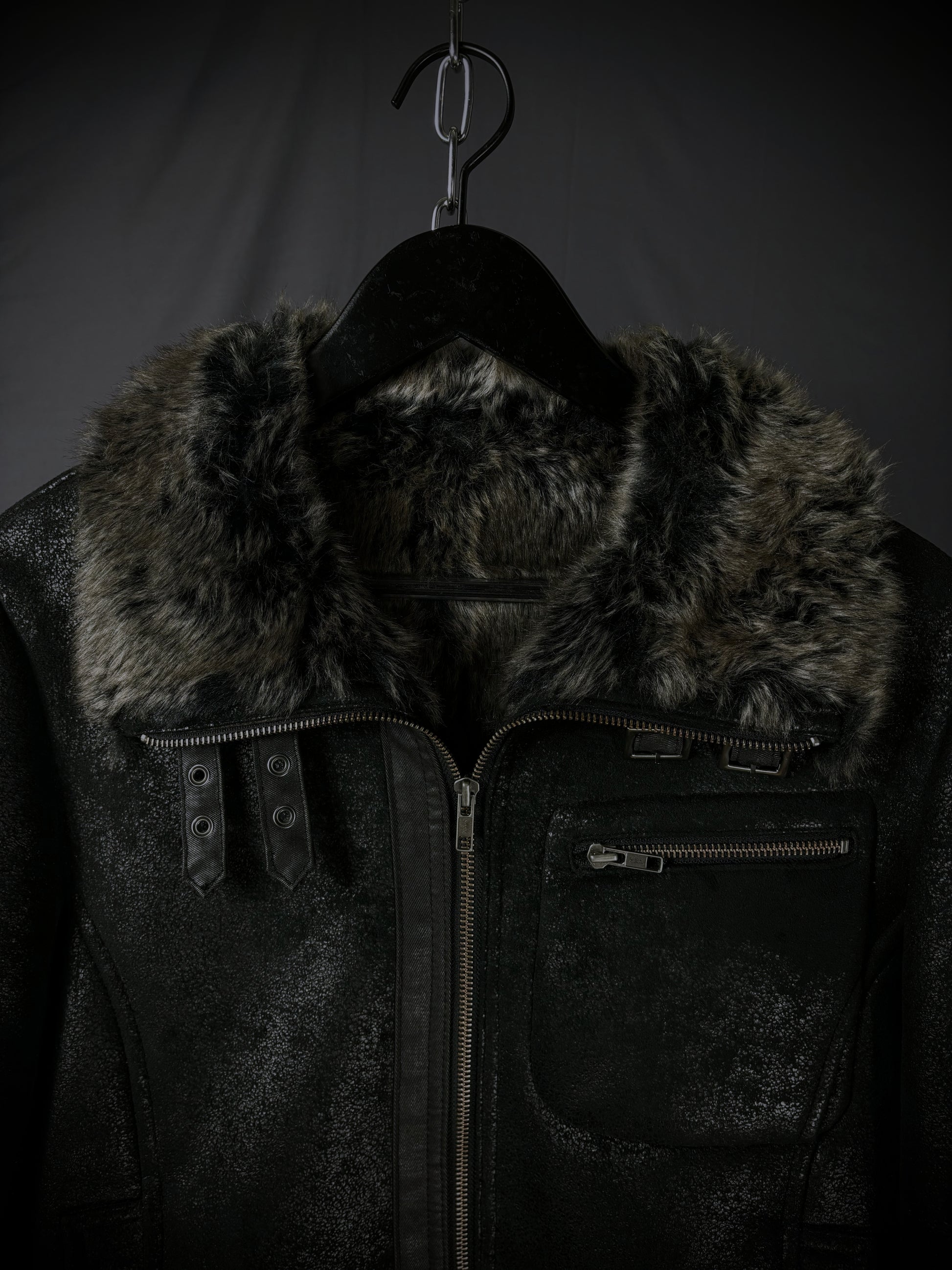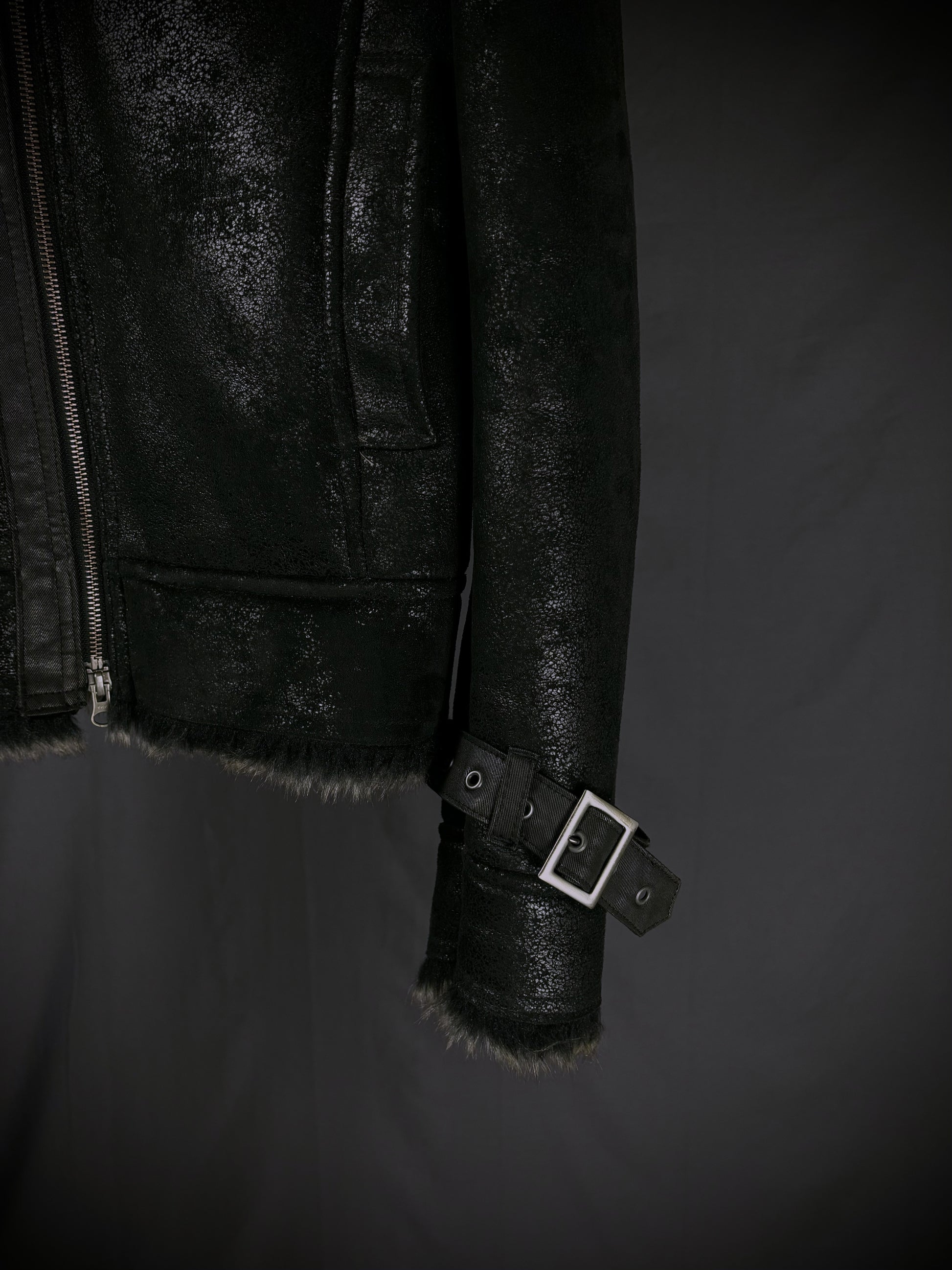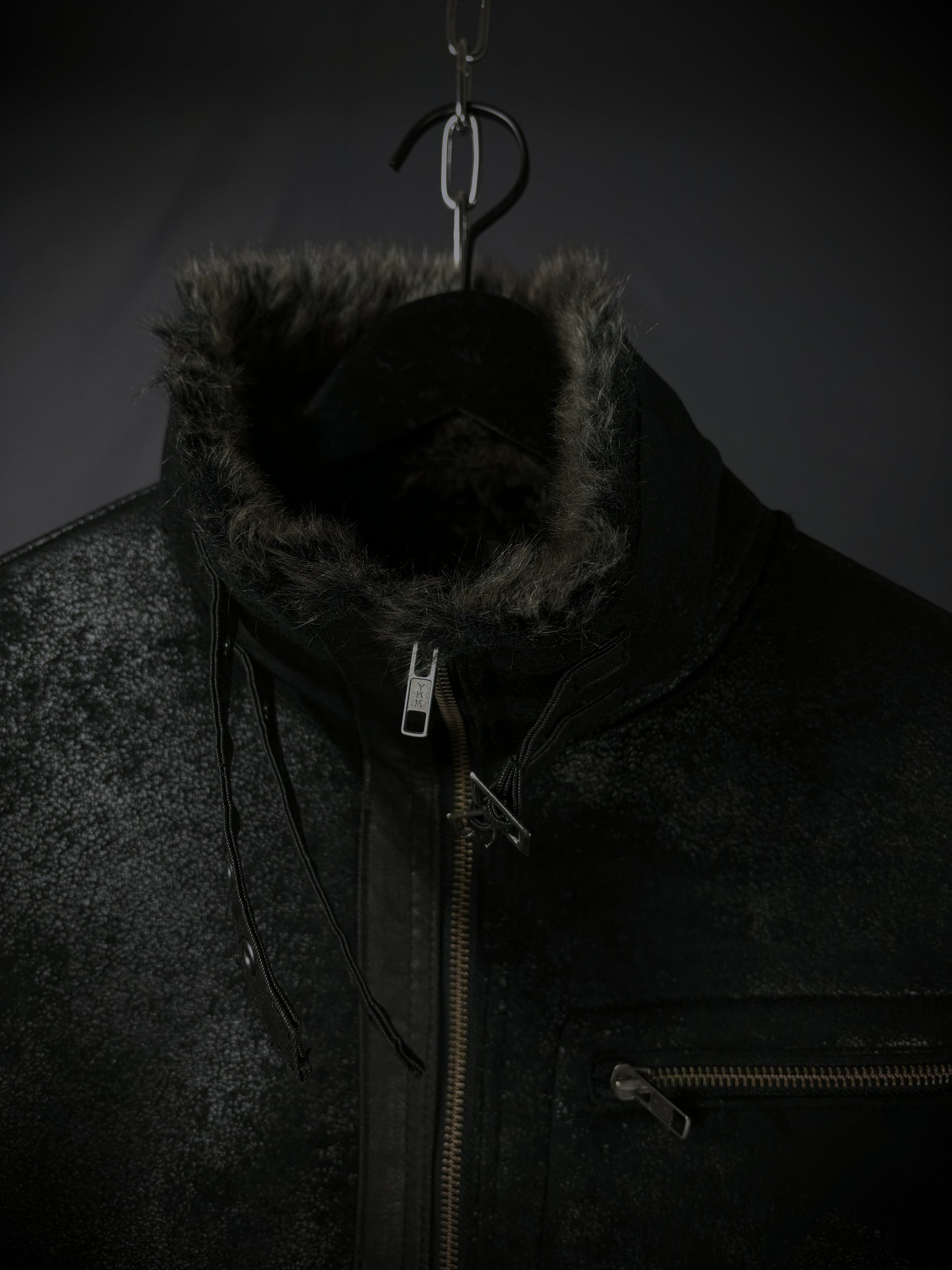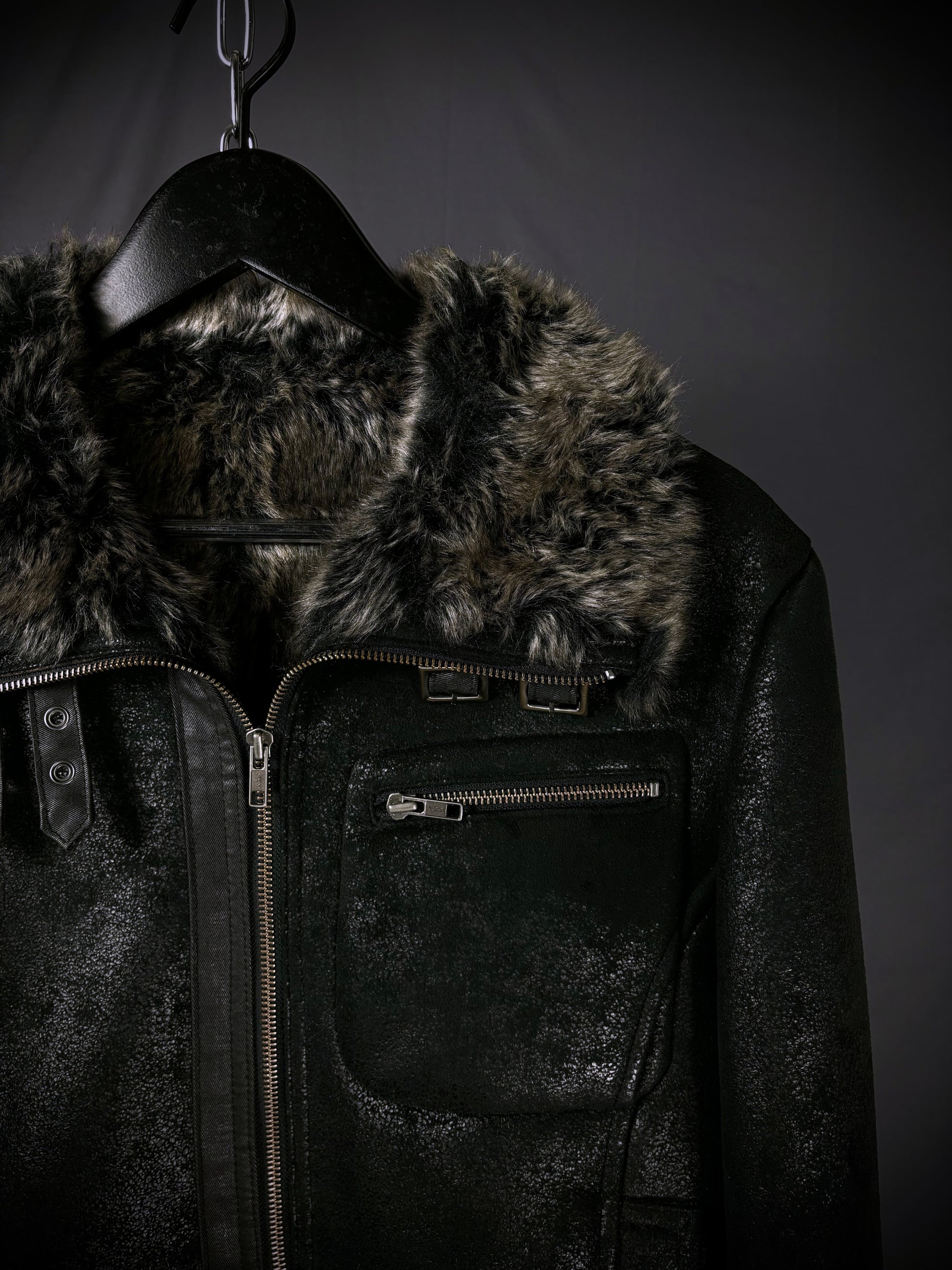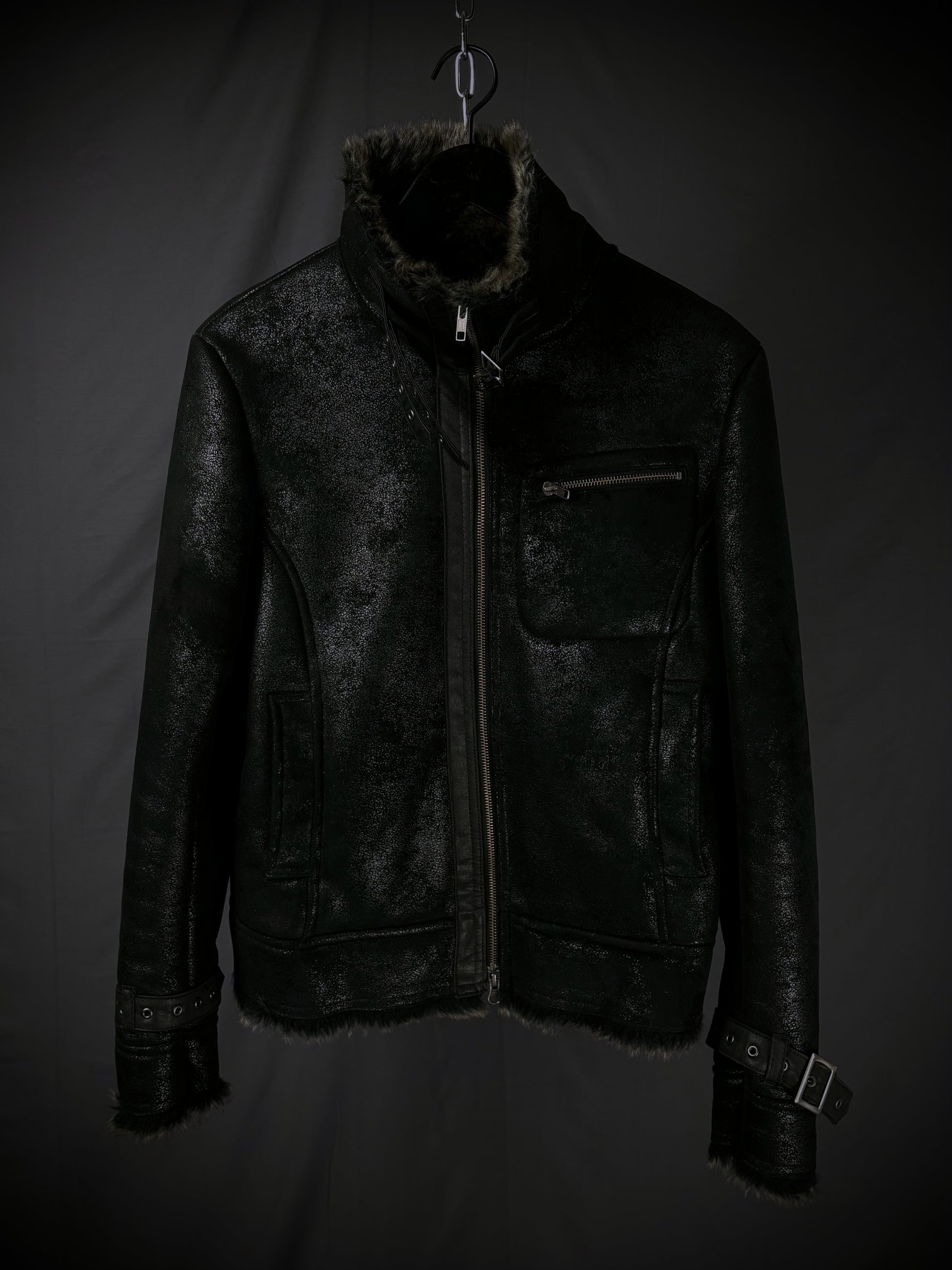 This jacket by the Japanese brand Rupert, from their “Difference” diffusion line, features an extremely soft faux fur lining in a dark charcoal-brown tone that extends throughout the interior and subtly peeks out at the hem and cuffs. The faux suede exterior boasts a textured, slightly distressed finish, giving the surface a worn-in handfeel with a subtle sheen that emerges under the right lighting. Details include YKK hardware on the full front zip closure and chest pocket, reinforced paneling throughout, and adjustable buckle straps at the cuffs and collar.