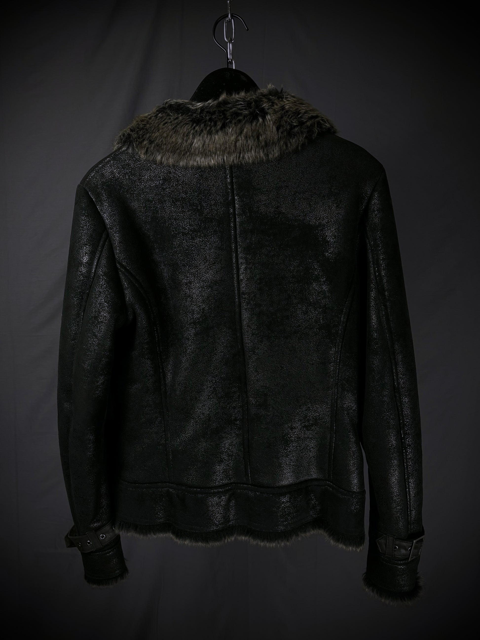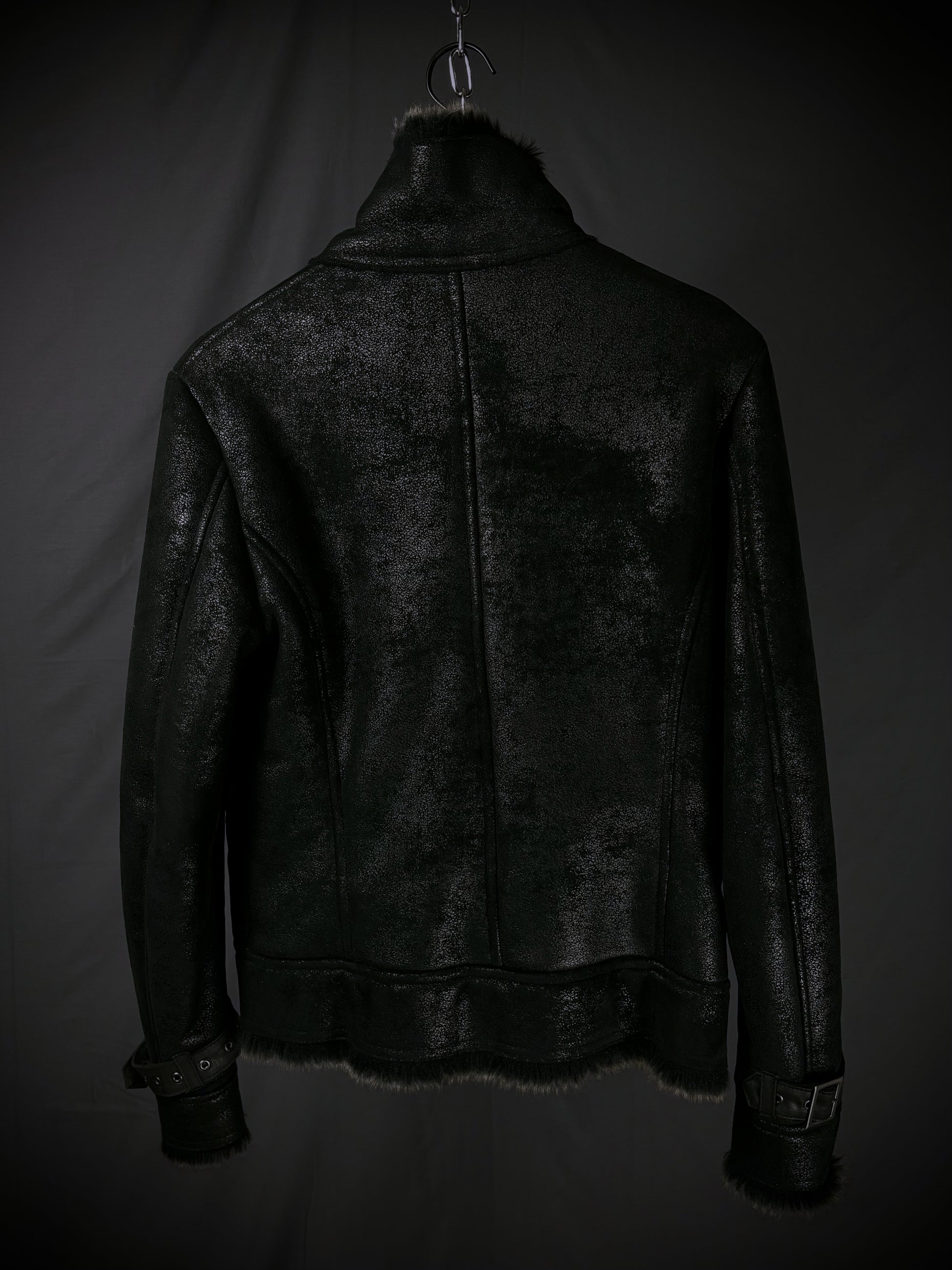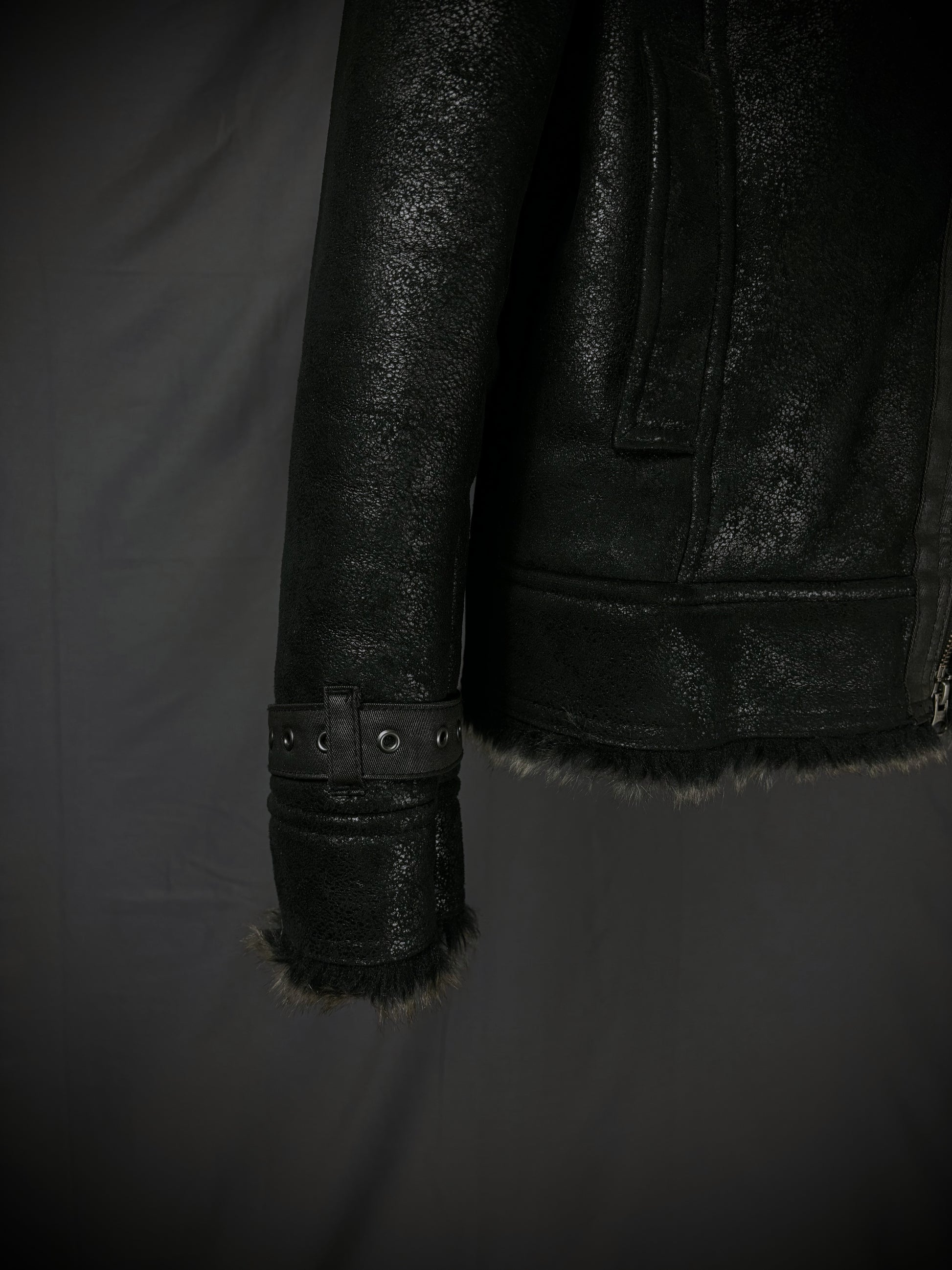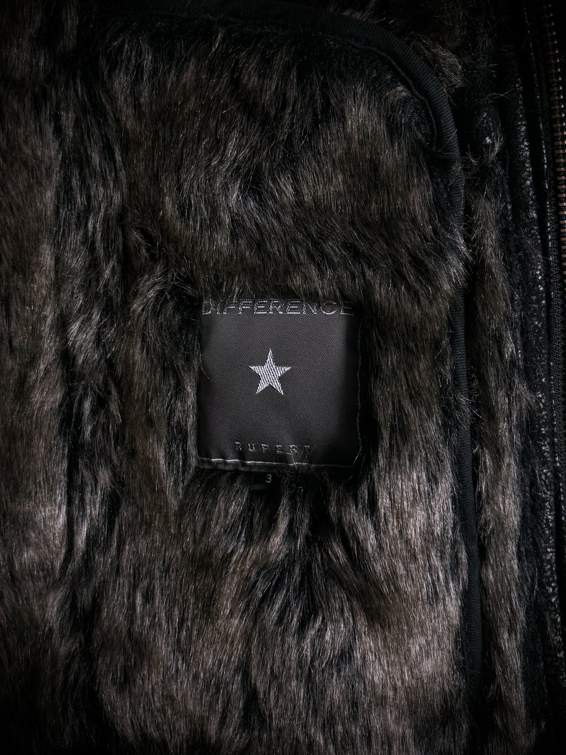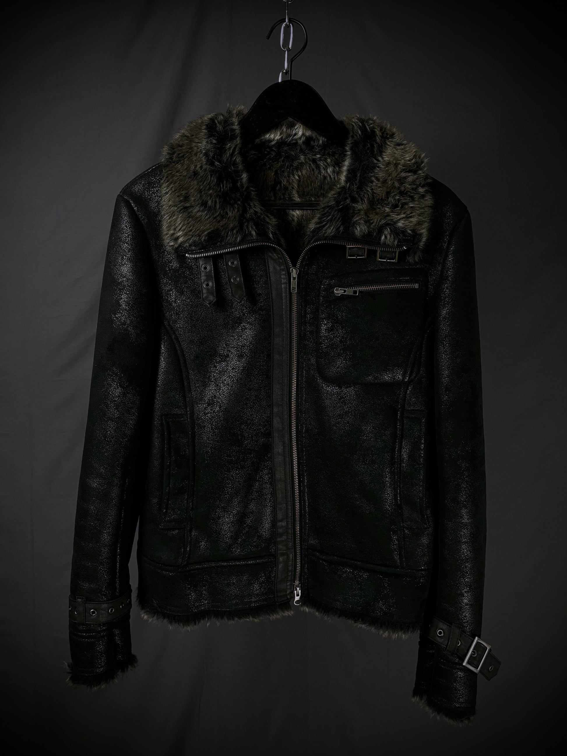 This jacket by the Japanese brand Rupert, from their “Difference” diffusion line, features an extremely soft faux fur lining in a dark charcoal-brown tone that extends throughout the interior and subtly peeks out at the hem and cuffs. The faux suede exterior boasts a textured, slightly distressed finish, giving the surface a worn-in handfeel with a subtle sheen that emerges under the right lighting. Details include YKK hardware on the full front zip closure and chest pocket, reinforced paneling throughout, and adjustable buckle straps at the cuffs and collar.