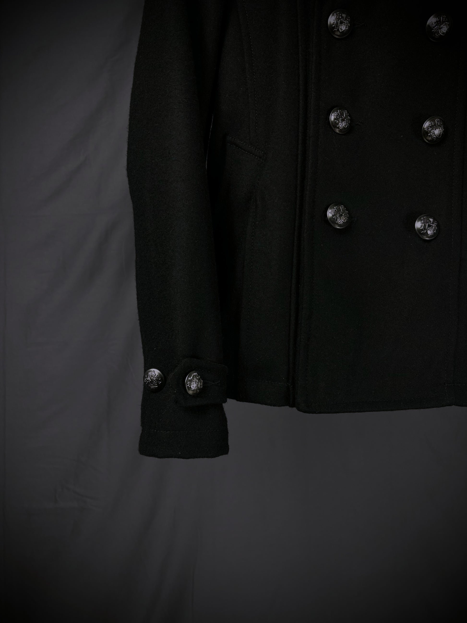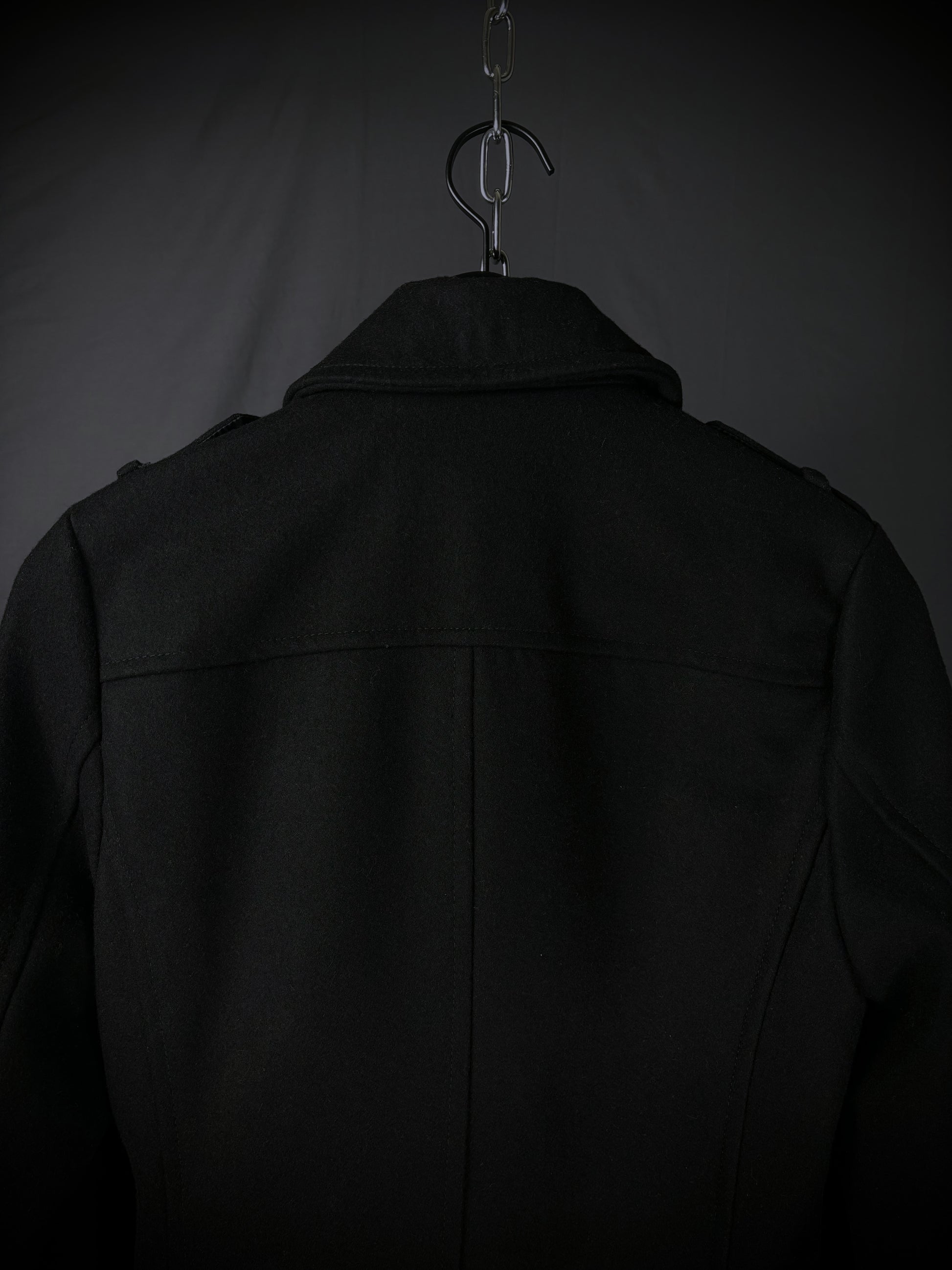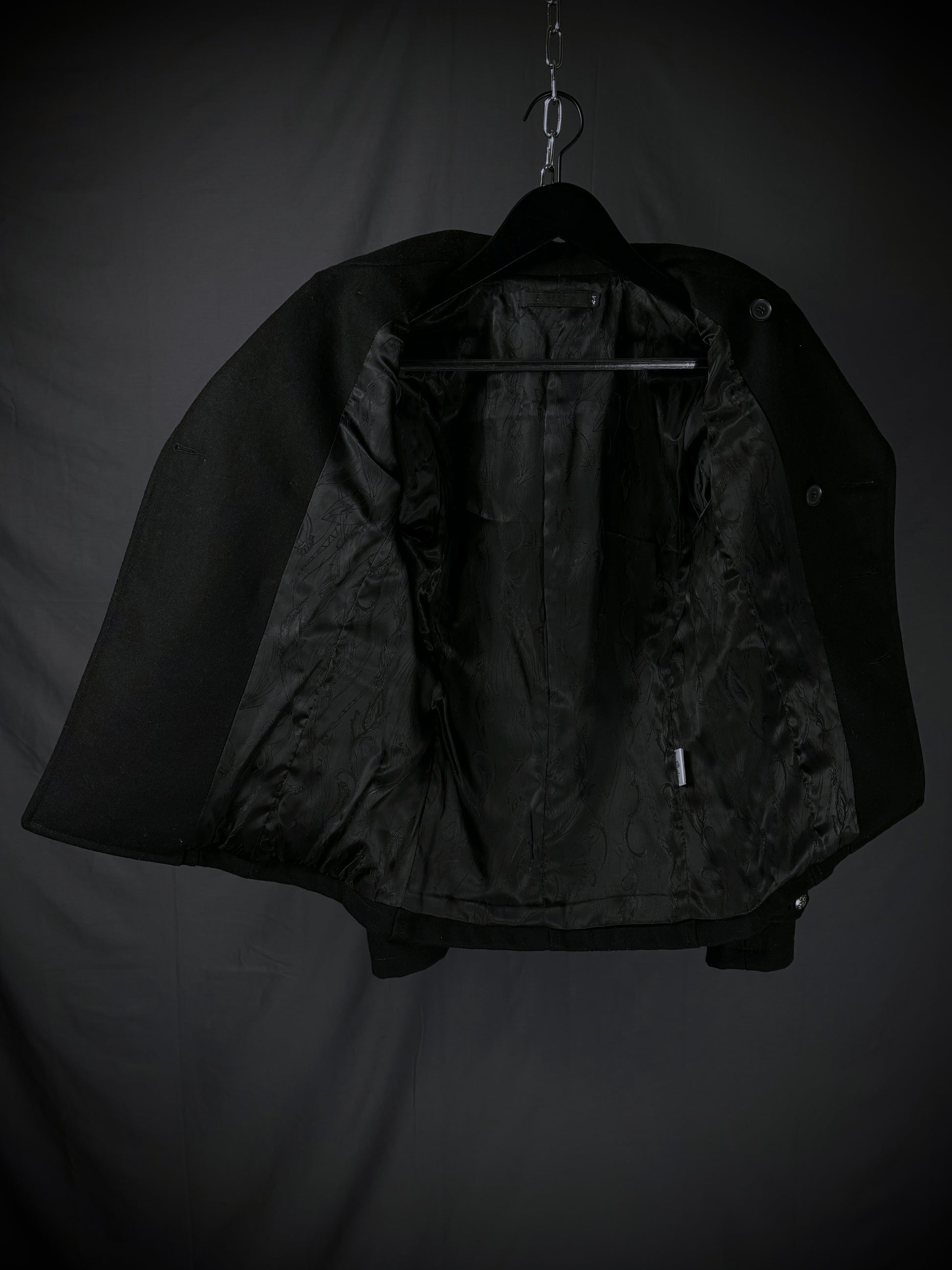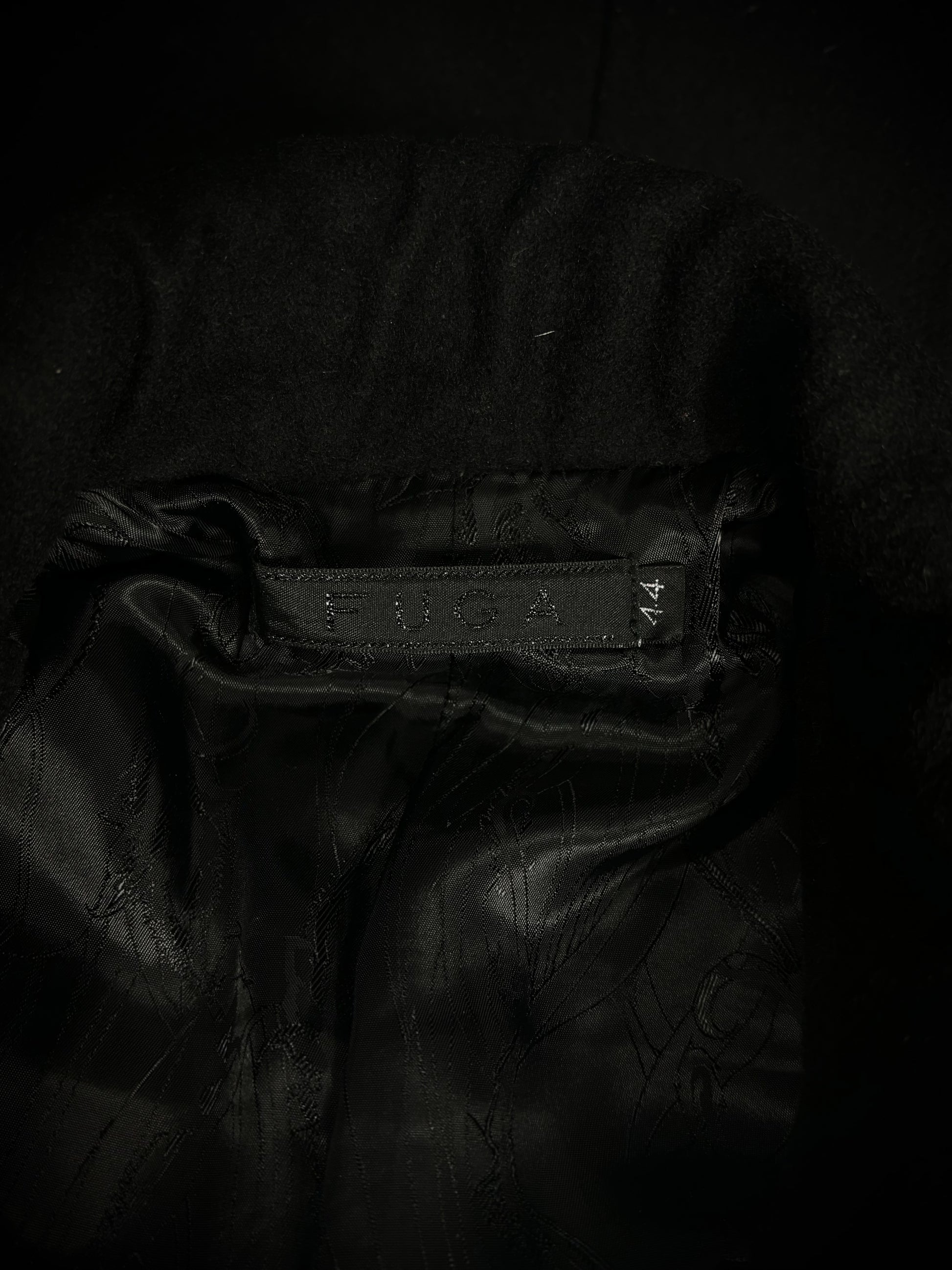 This jacket from the Japanese brand Fuga features a tailored, double-breasted silhouette with a pronounced “Napoleon” military influence. It is finished with custom embossed metal buttons at the front, cuffs, and epaulets. The outer shell is constructed from a wool-based blend of wool, polyester, acrylic, nylon, rayon, and silk, while the interior is fully lined in 100% polyester with an all-over woven pattern. Additional details include structured shoulders, angled front pockets, and a clean, contoured back panel that reinforces the jacket’s tailored shape.