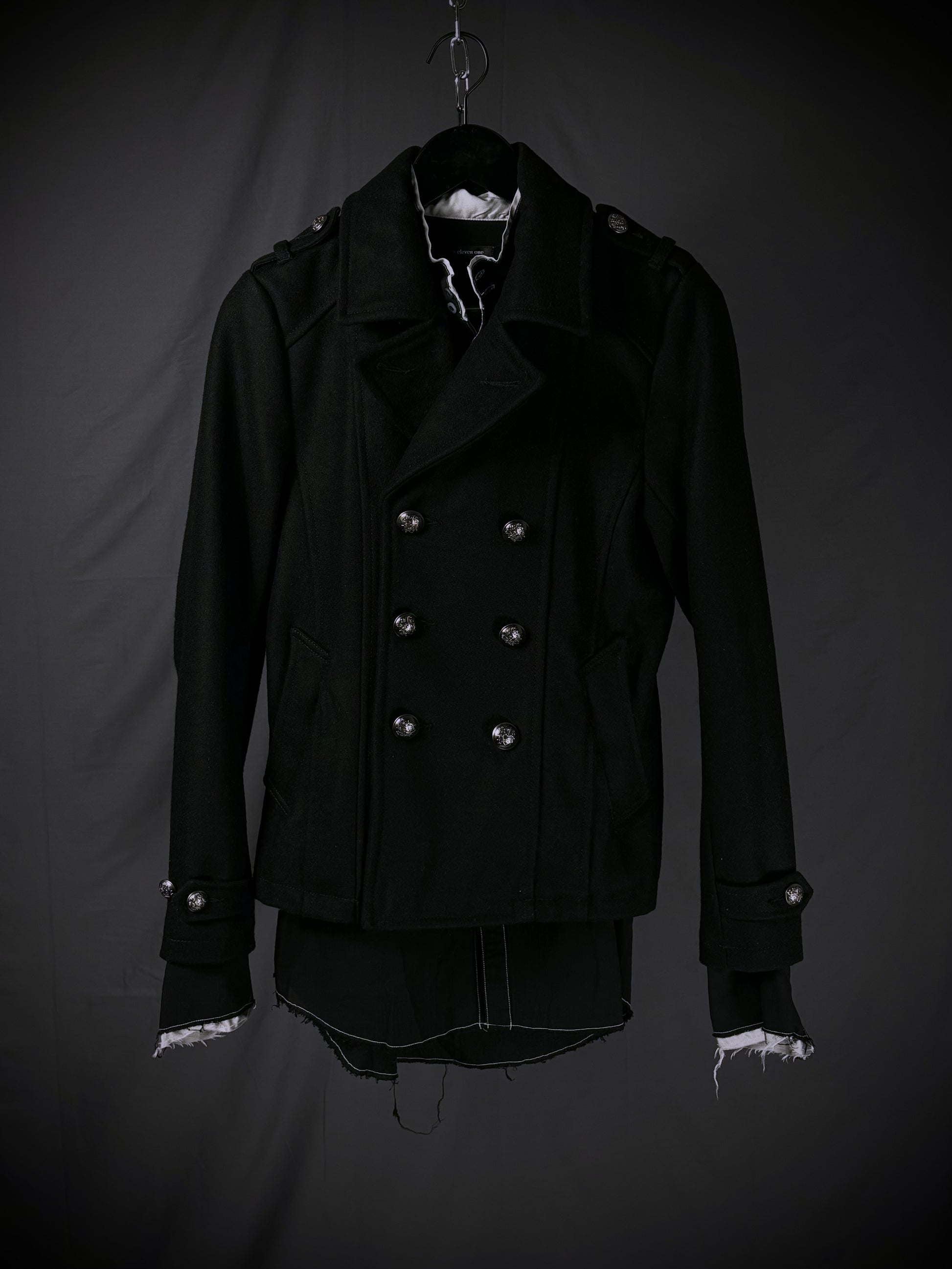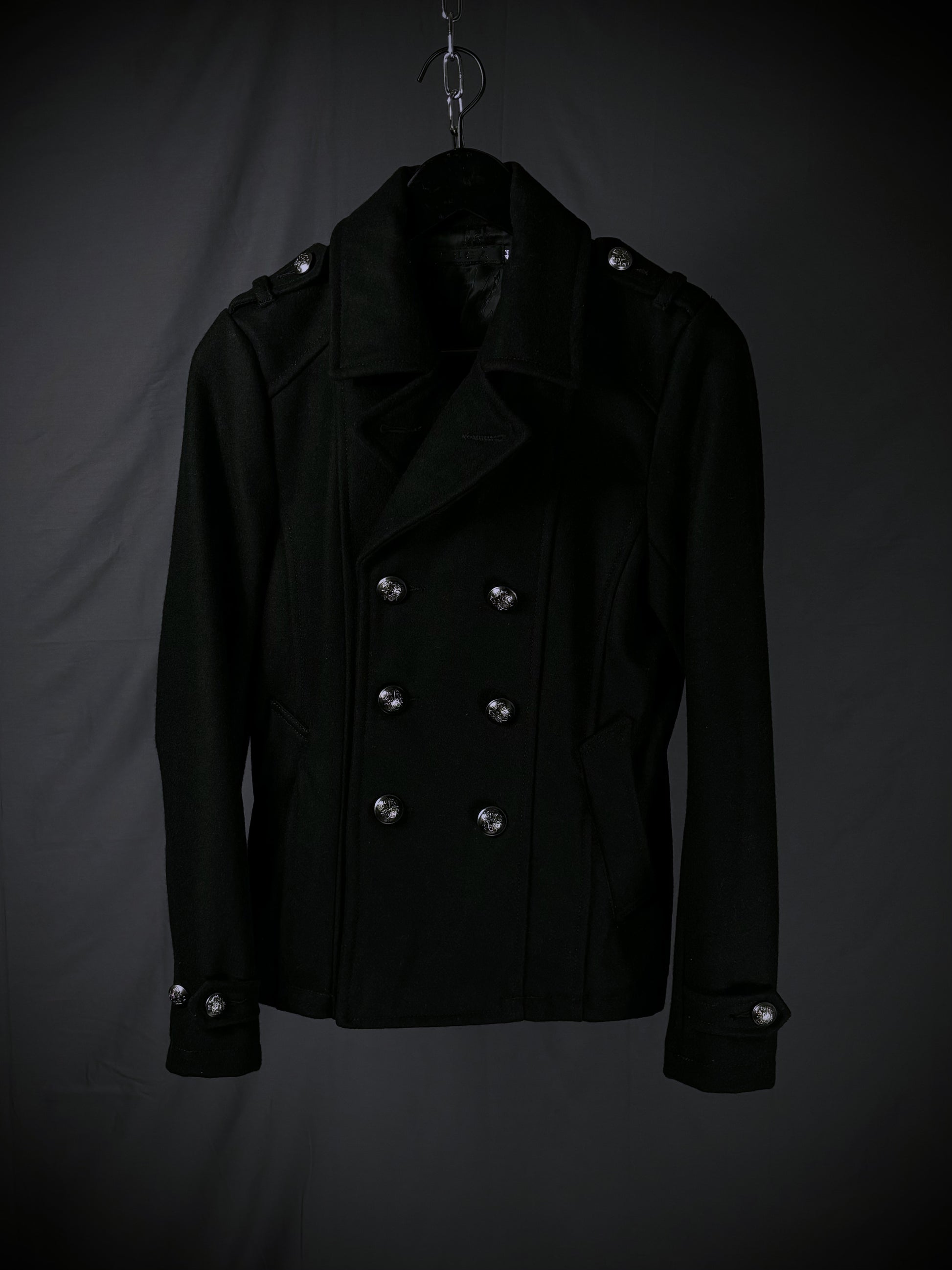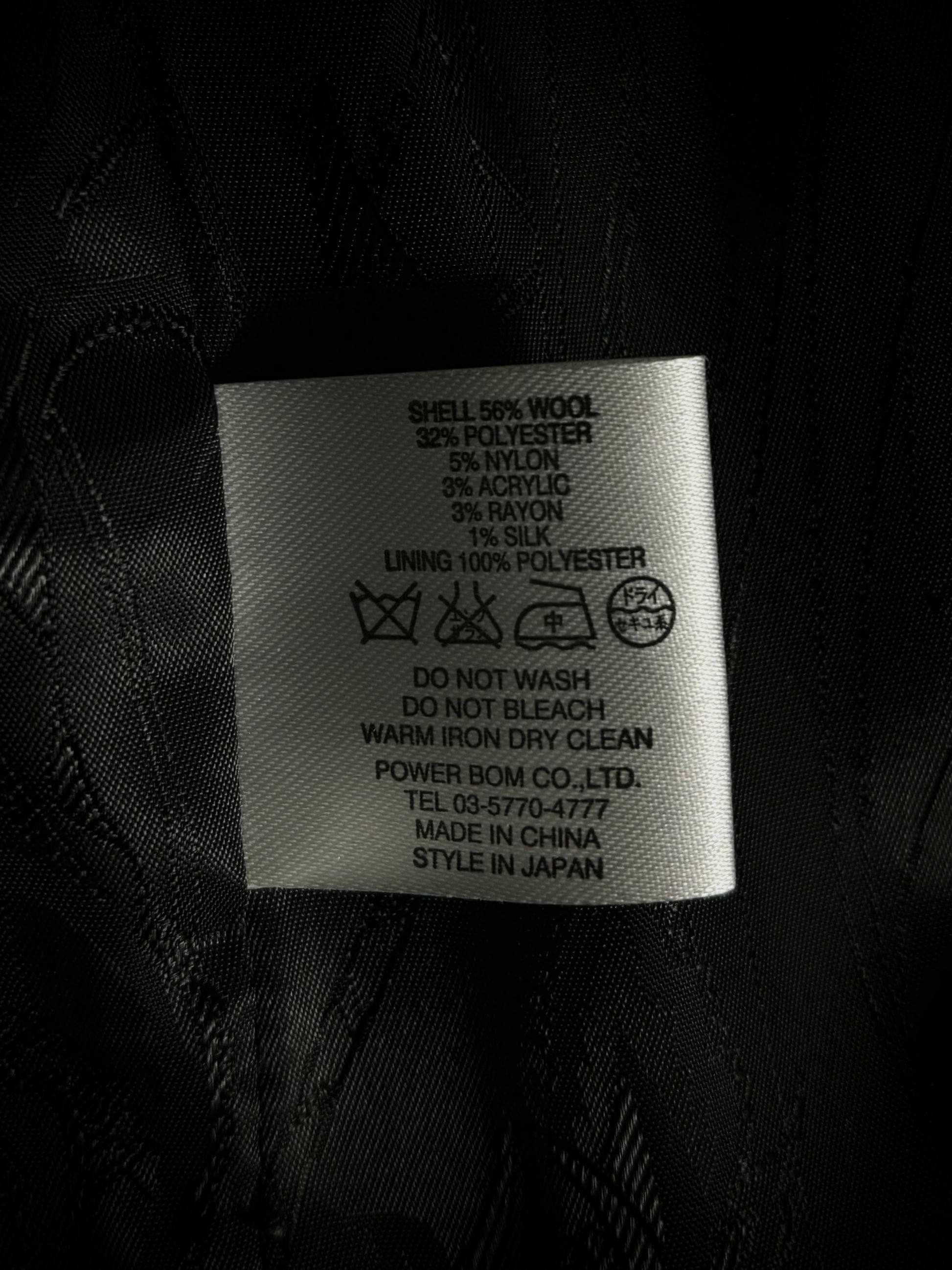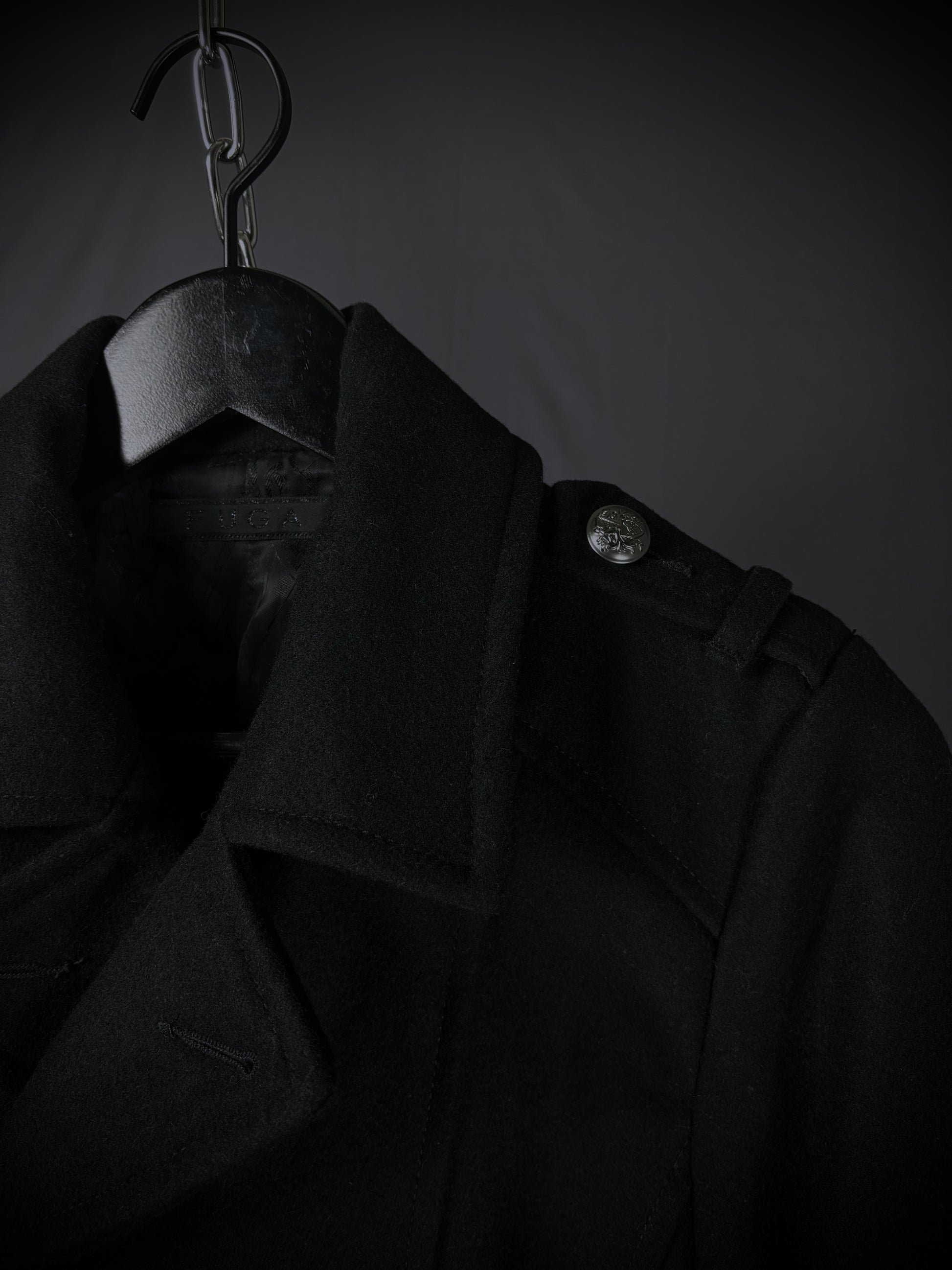 This jacket from the Japanese brand Fuga features a tailored, double-breasted silhouette with a pronounced “Napoleon” military influence. It is finished with custom embossed metal buttons at the front, cuffs, and epaulets. The outer shell is constructed from a wool-based blend of wool, polyester, acrylic, nylon, rayon, and silk, while the interior is fully lined in 100% polyester with an all-over woven pattern. Additional details include structured shoulders, angled front pockets, and a clean, contoured back panel that reinforces the jacket’s tailored shape.