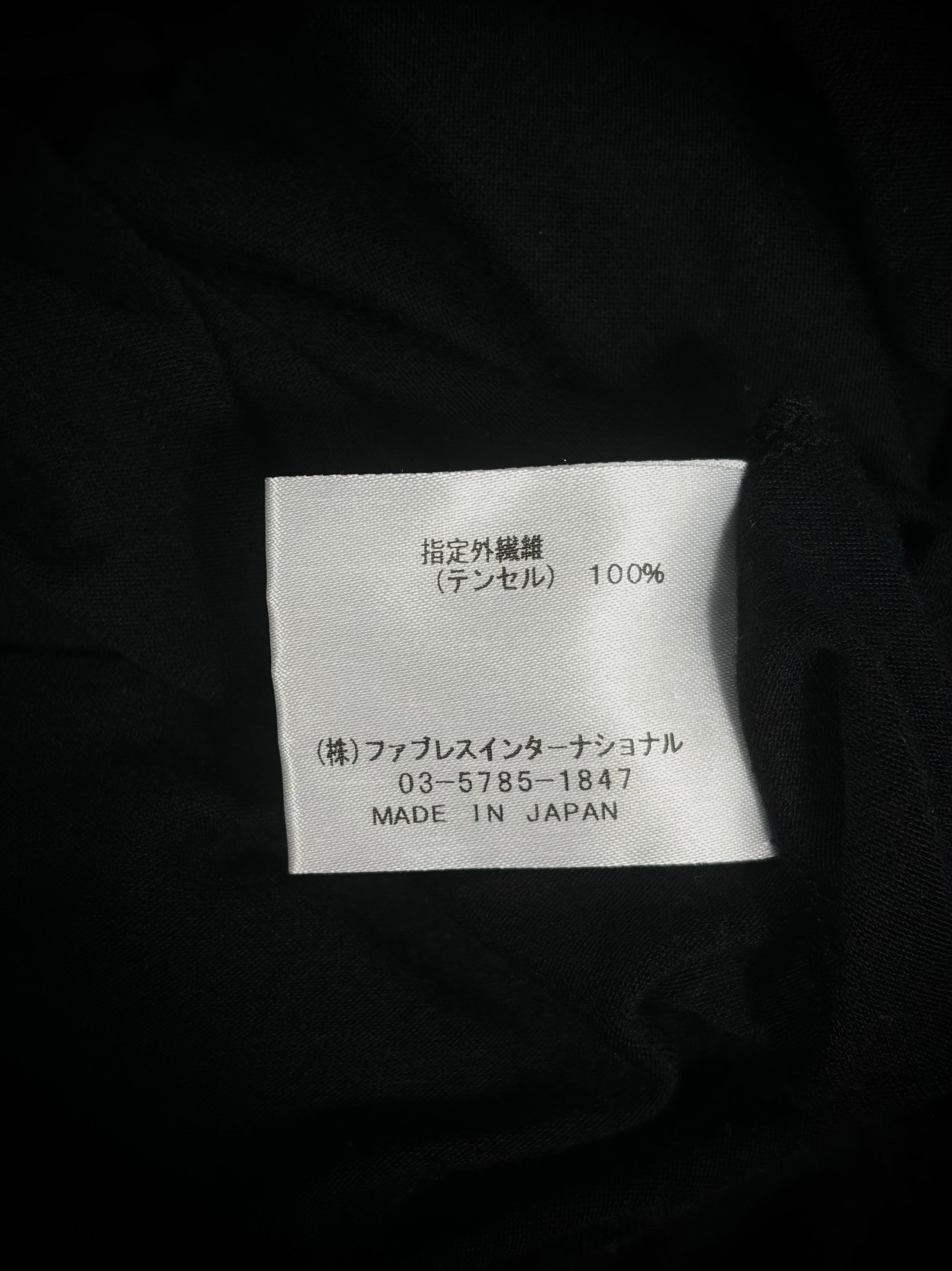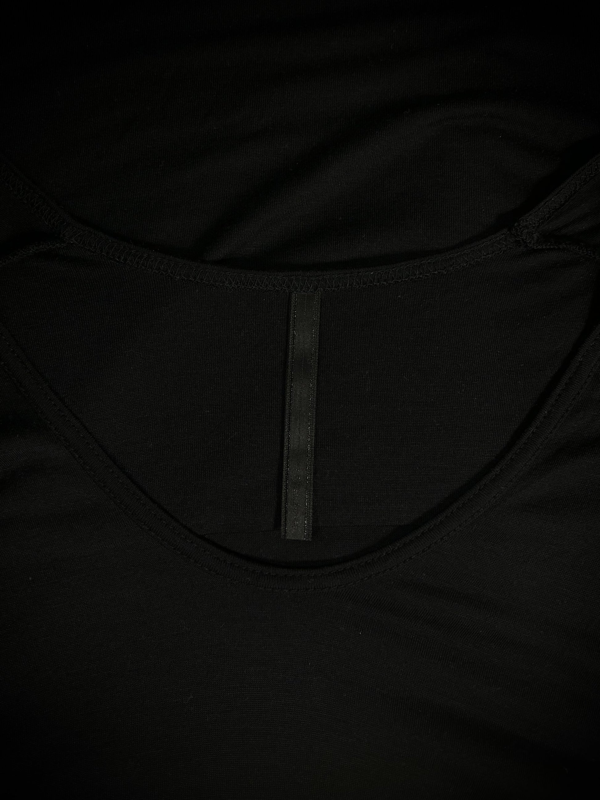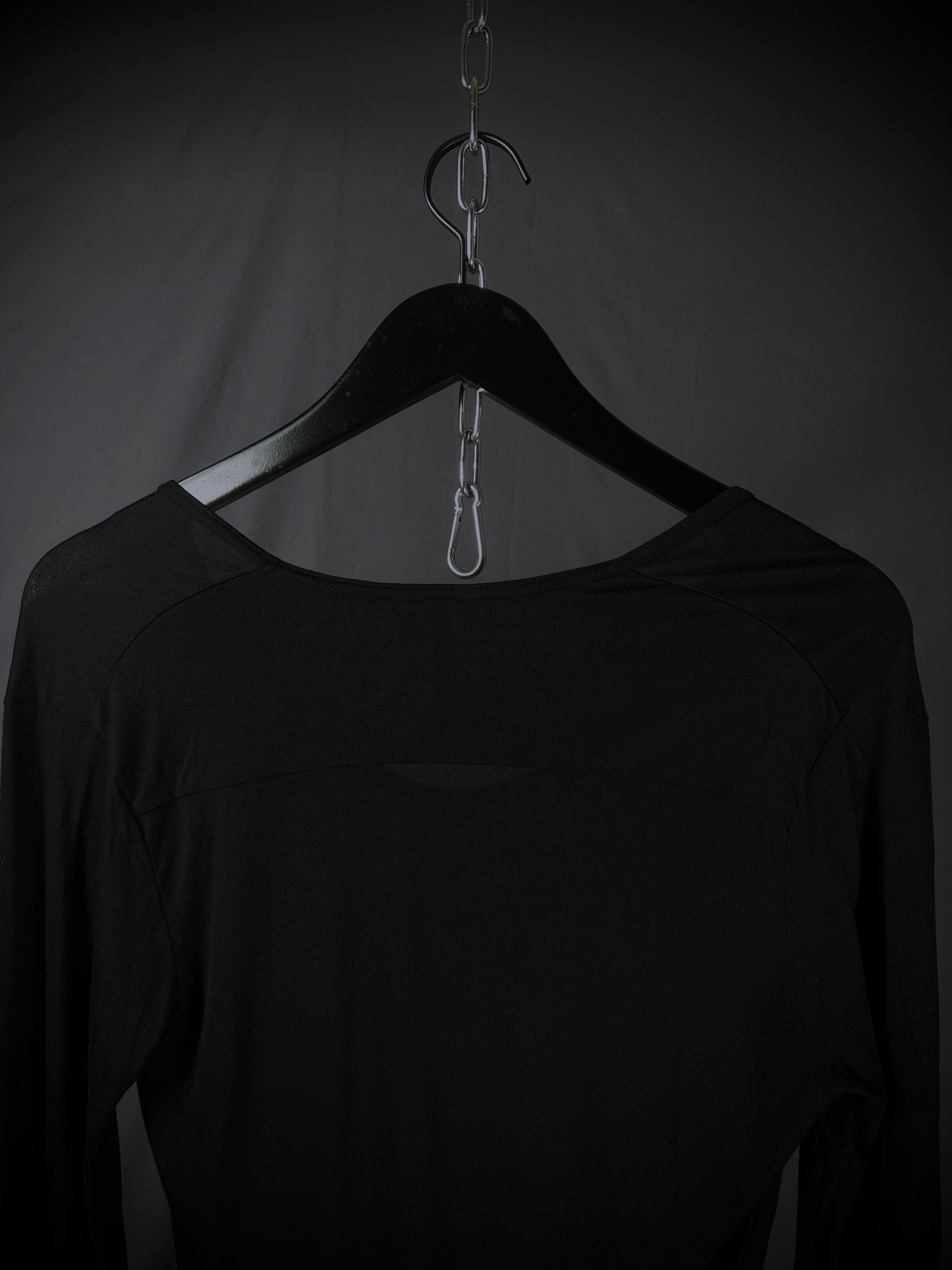 This long-sleeve tee from GalaabenD epitomizes Japanese avant-garde minimalism through its tight-fitted silhouette and dramatic proportions. Crafted from a semi-sheer 100% Tencel (rayon), the garment offers a luxurious, fluid drape with a subtle "second-skin" transparency. The design is defined by a scoop neck and a striking exaggerated scooped hem, balanced by horizontal seam detailing across the upper back that highlights the brand’s focus on architectural tailoring.