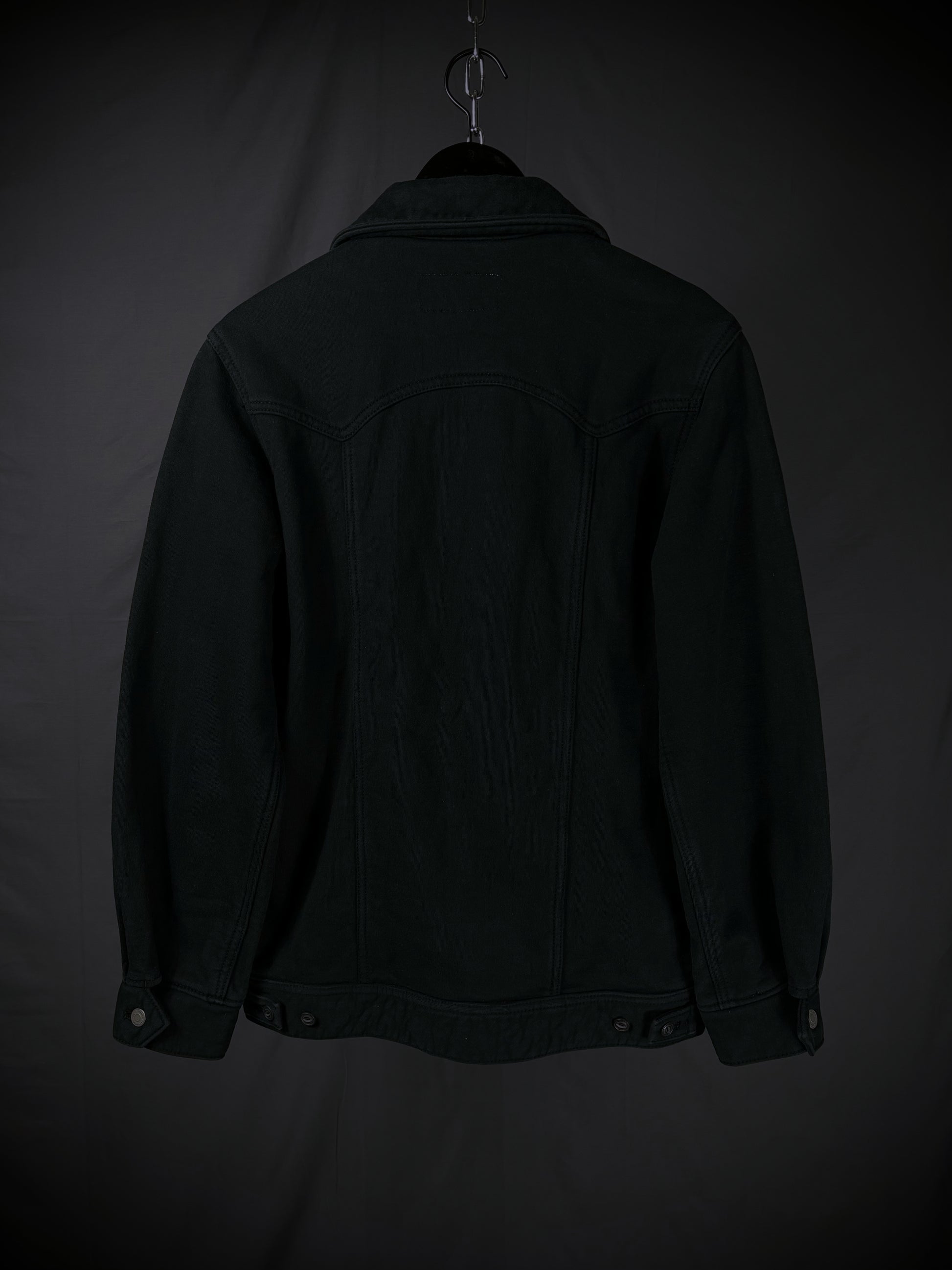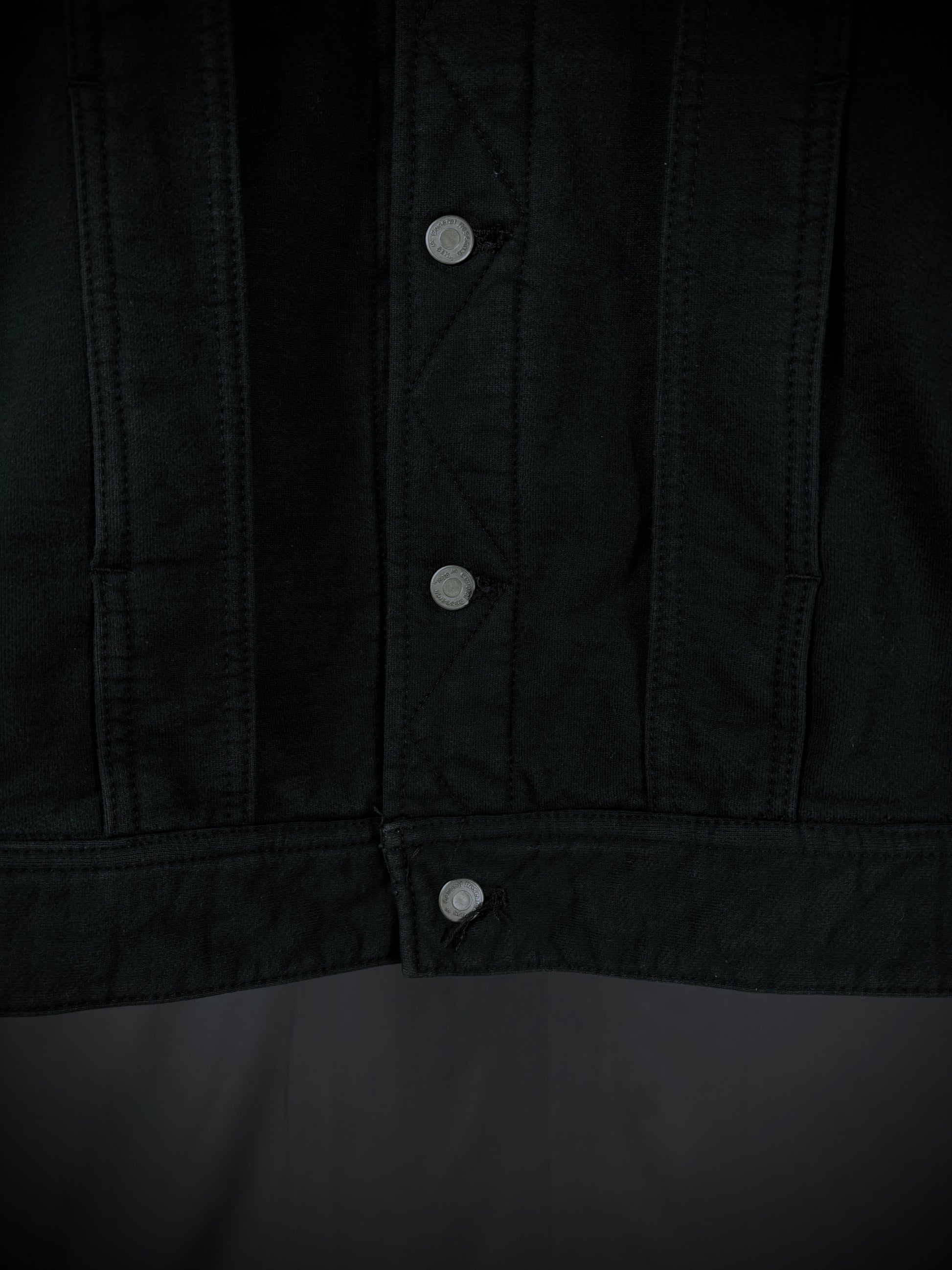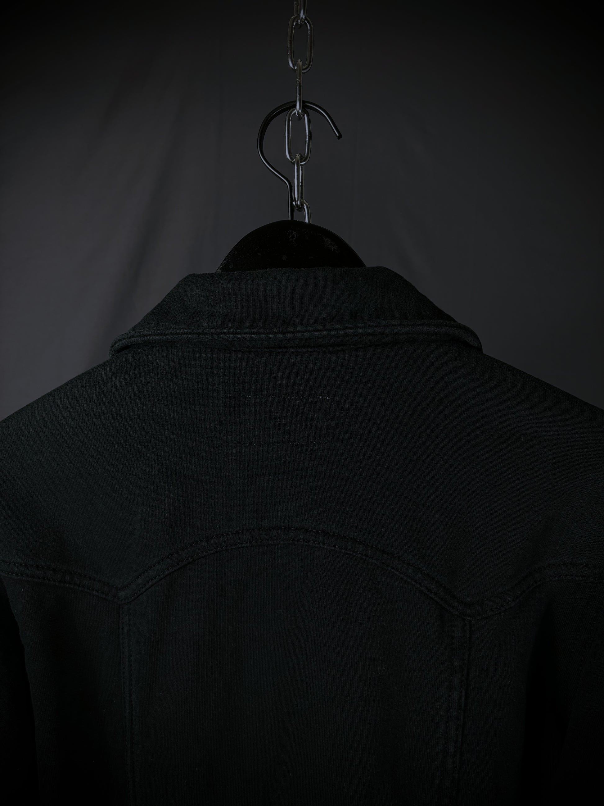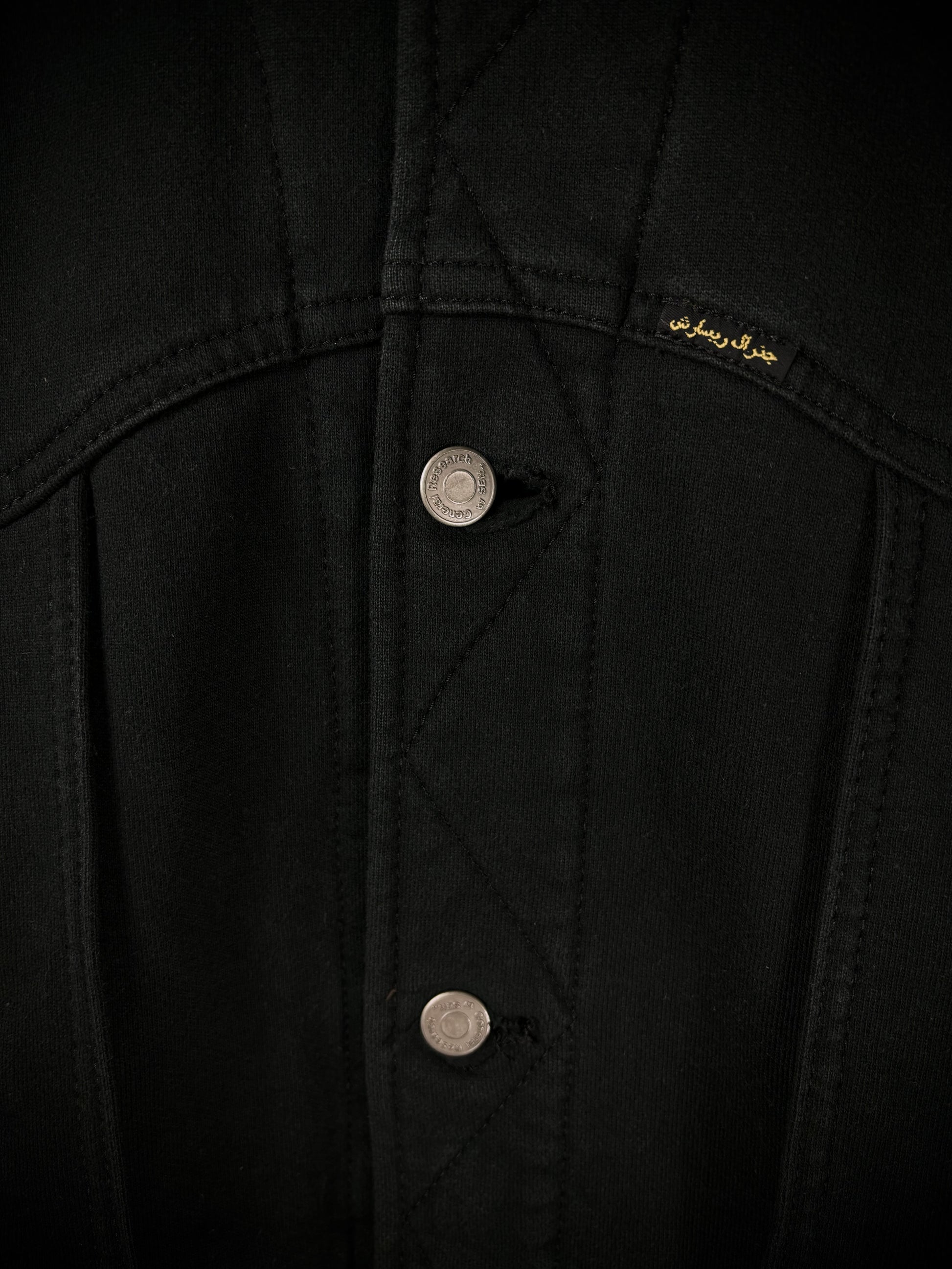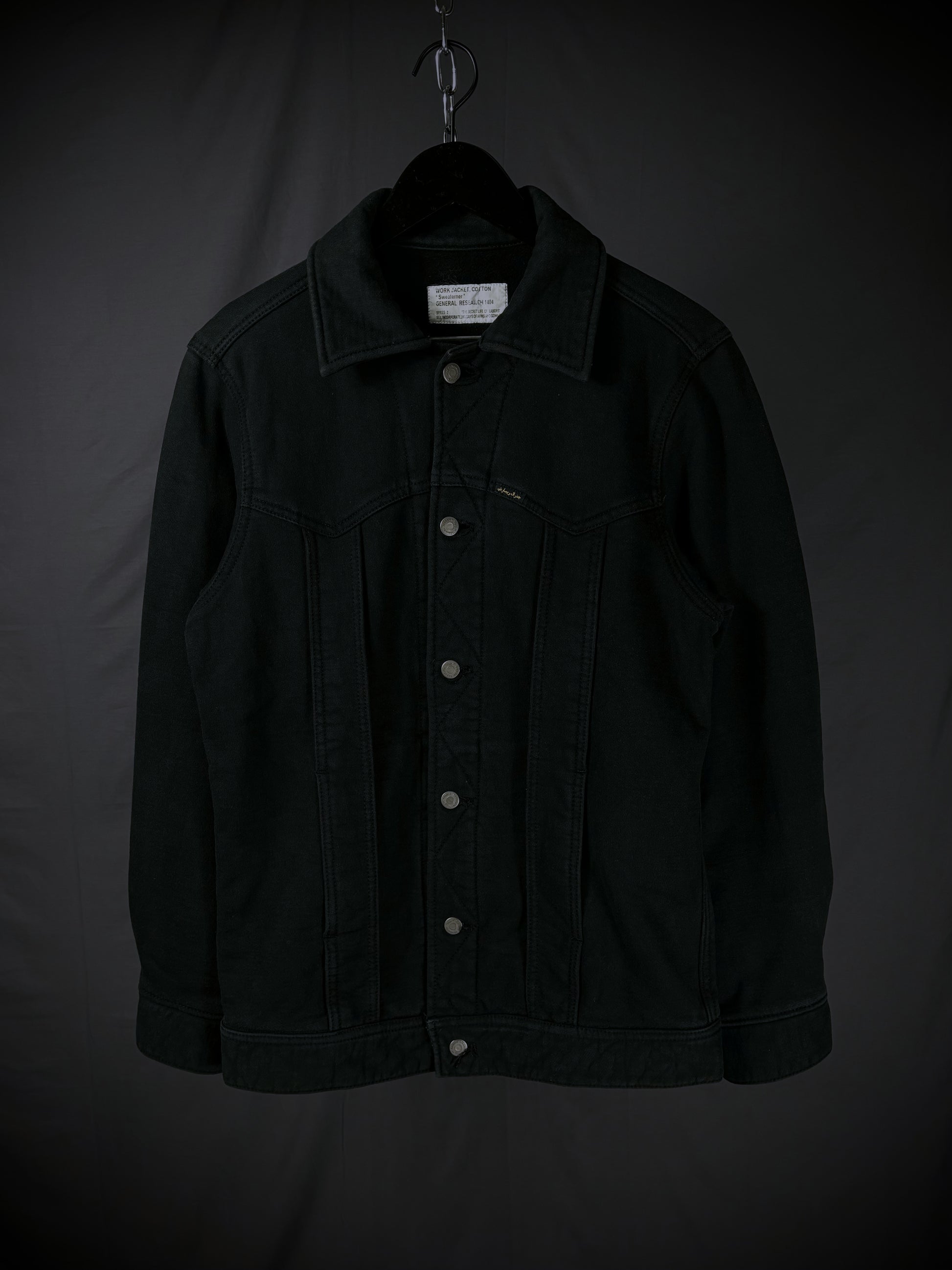 This jacket from General Research’s Autumn/Winter 2003 “The Secret Life of Labors” collection embodies the essence of traditional workwear while infusing elements of classic Americana trucker jackets. Constructed from high-quality terry cotton and made in Japan, it features branded hardware and a unique interpretation of a Western yoke, accompanied by vertical paneling that conceals two front pockets.