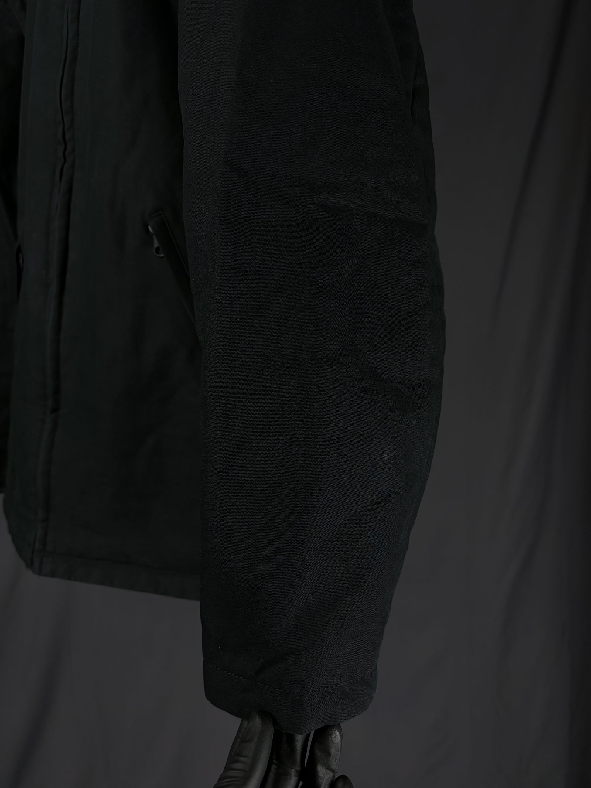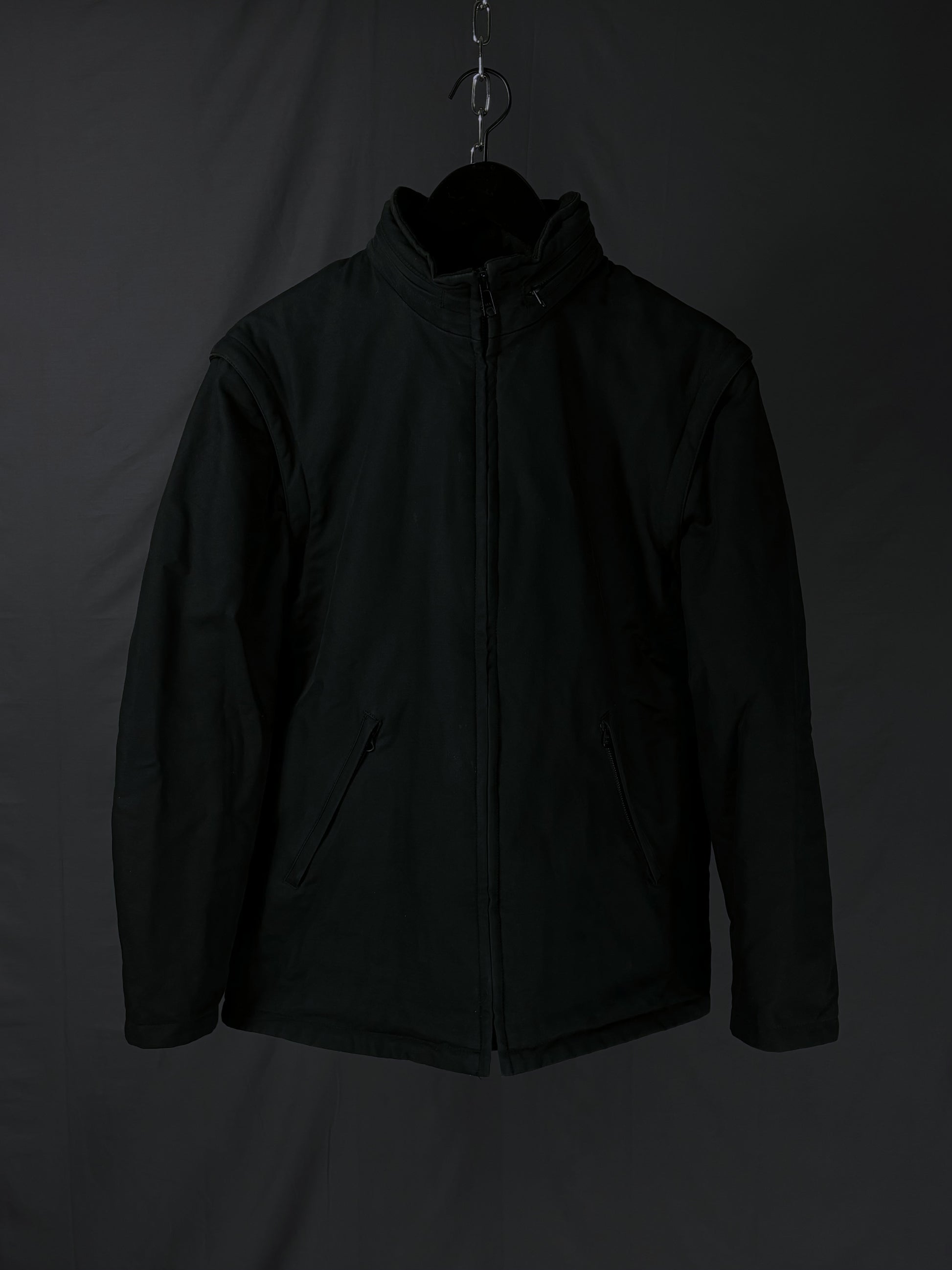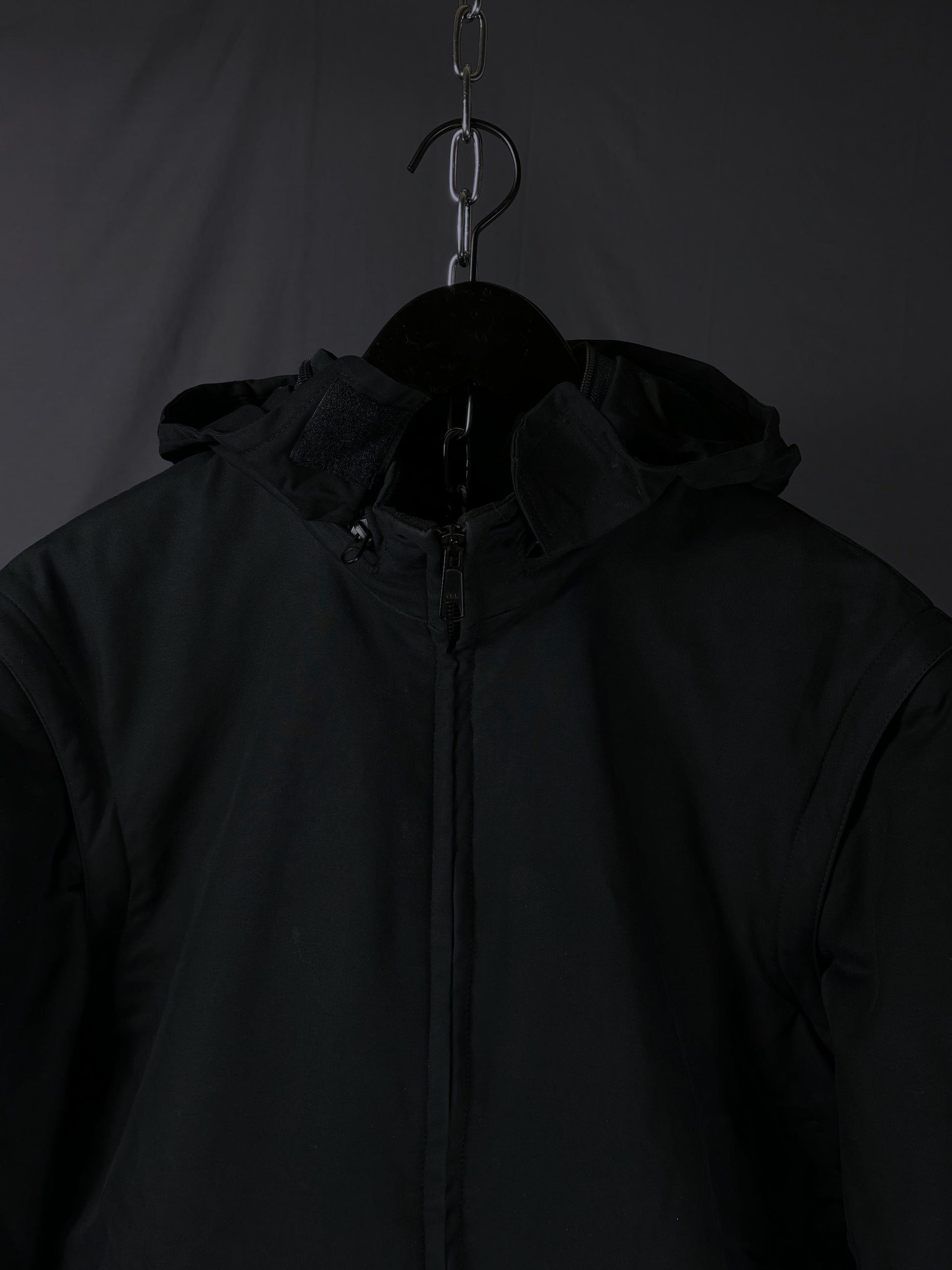 This jacket by General Research from 2000 is made with a 100% cotton outer and features a modular design with zip-off sleeves that convert it into a vest. It includes a packable hood stored in the collar, along with a full front zip closure and zippered pockets. The interior is double-lined for insulation, with a wool/nylon blend as the first layer and a polyester second layer for added warmth and comfort.
