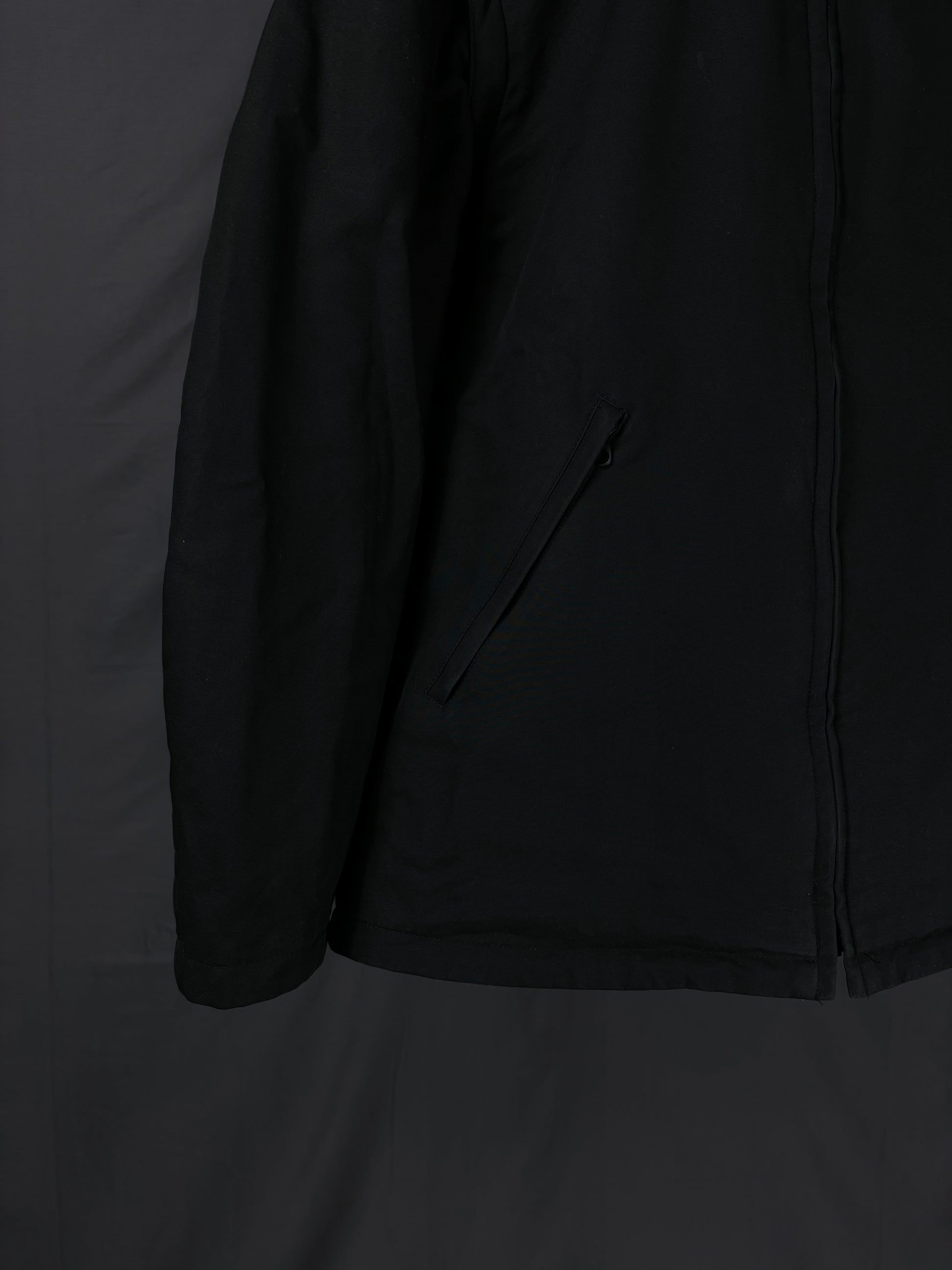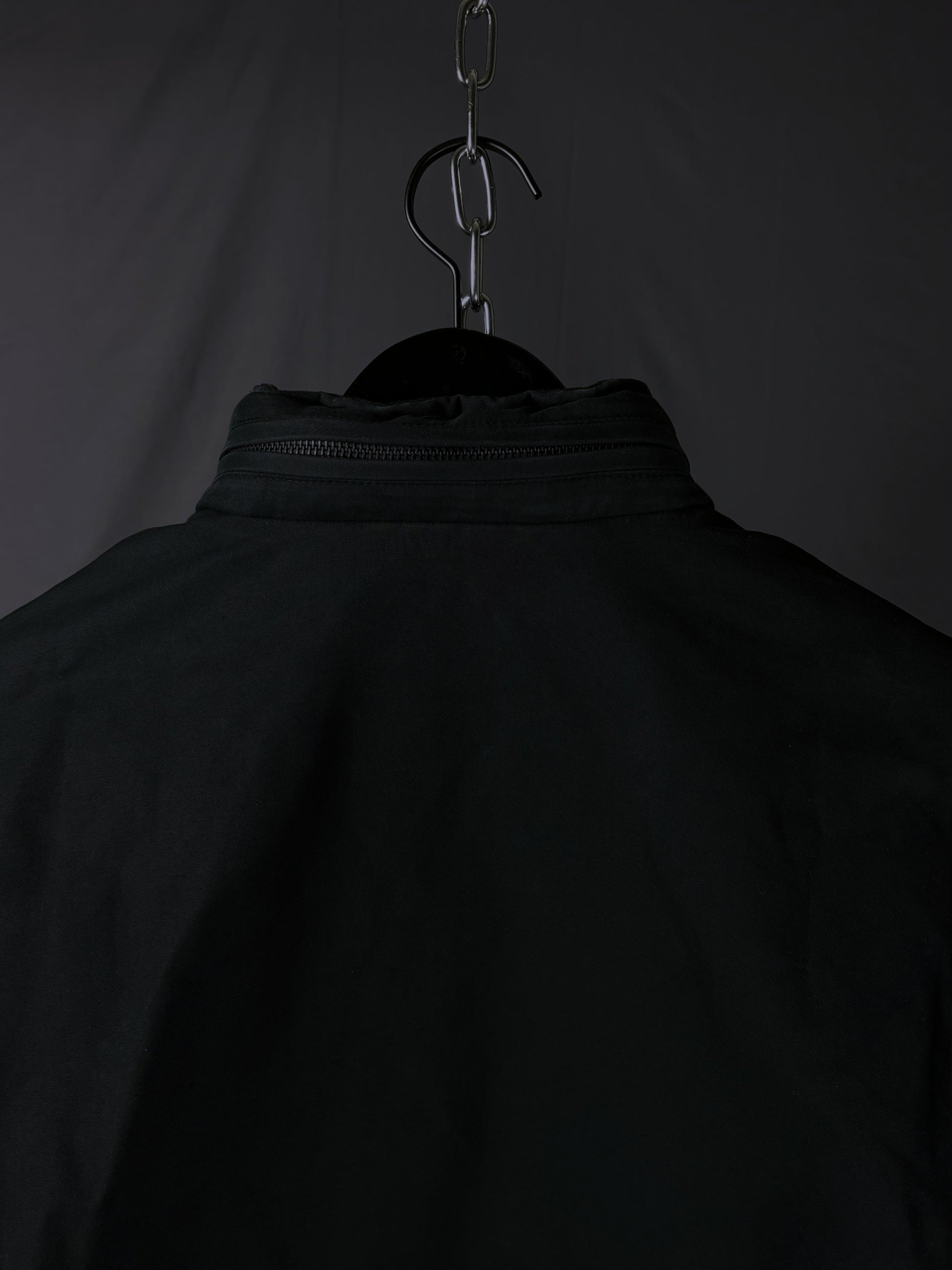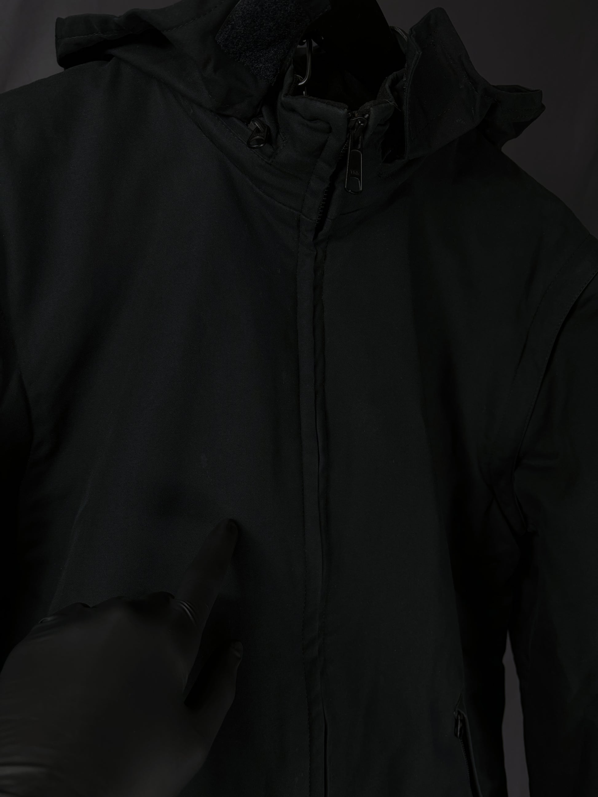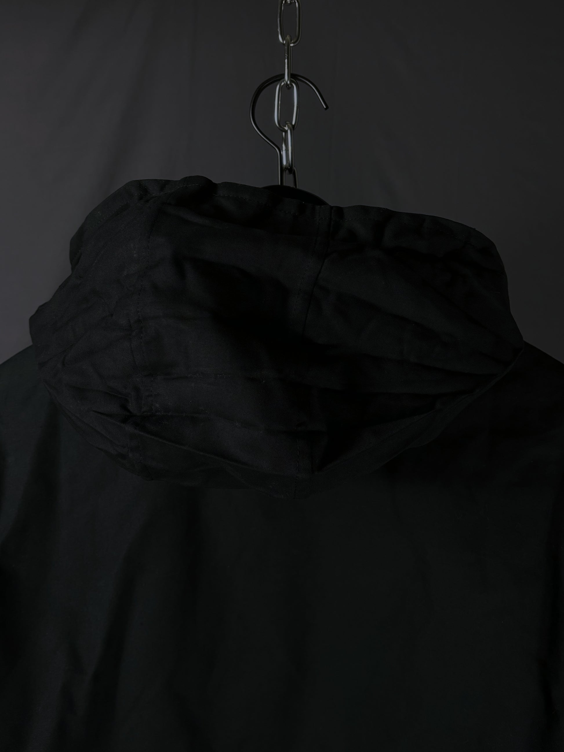 This jacket by General Research from 2000 is made with a 100% cotton outer and features a modular design with zip-off sleeves that convert it into a vest. It includes a packable hood stored in the collar, along with a full front zip closure and zippered pockets. The interior is double-lined for insulation, with a wool/nylon blend as the first layer and a polyester second layer for added warmth and comfort.