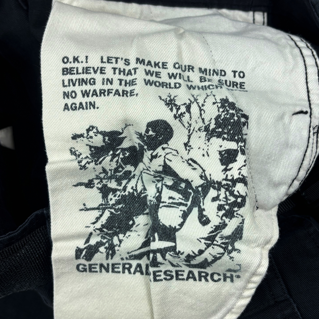 This pair of pants by the Japanese brand General Research from 2000 features back zippers along the leg opening for an adjustable fit, and a branded clasped belt with tied red ribbon for contrast.