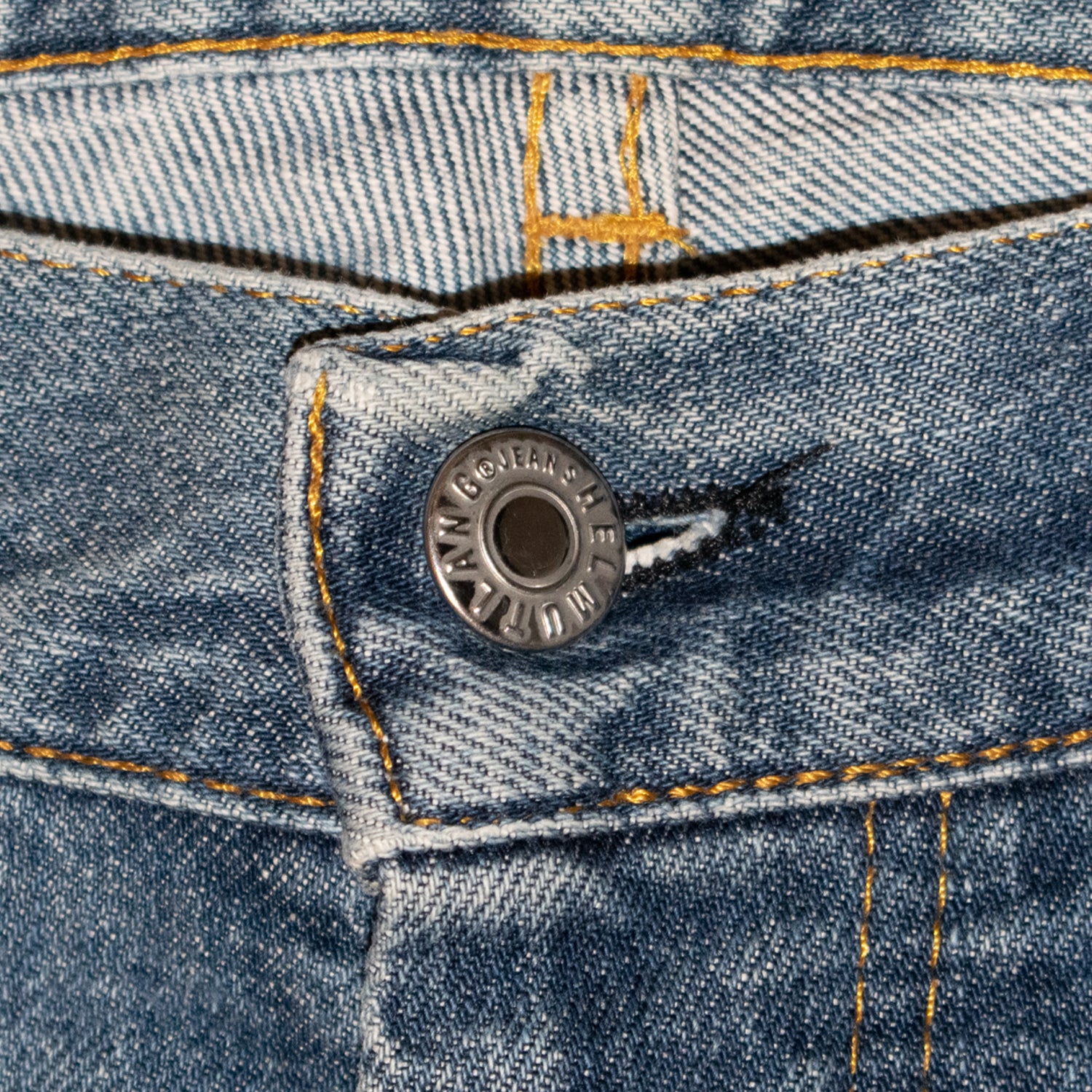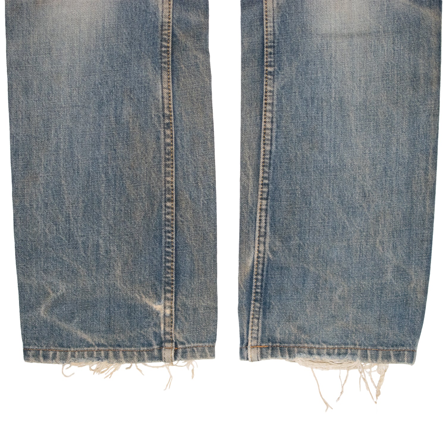 Here we have a vintage pair of jeans from circa 1999 by Helmut Lang. This piece is constructed with high-quality Japanese denim and features various design elements such as a classic cut silhouette reminiscent of the iconic Levi’s 501xx model, five pockets, and a nickel logo button fly. Boasting a beautifully aged light wash, this pair of denim from Helmut Lang is a staple piece that will never go out of style.