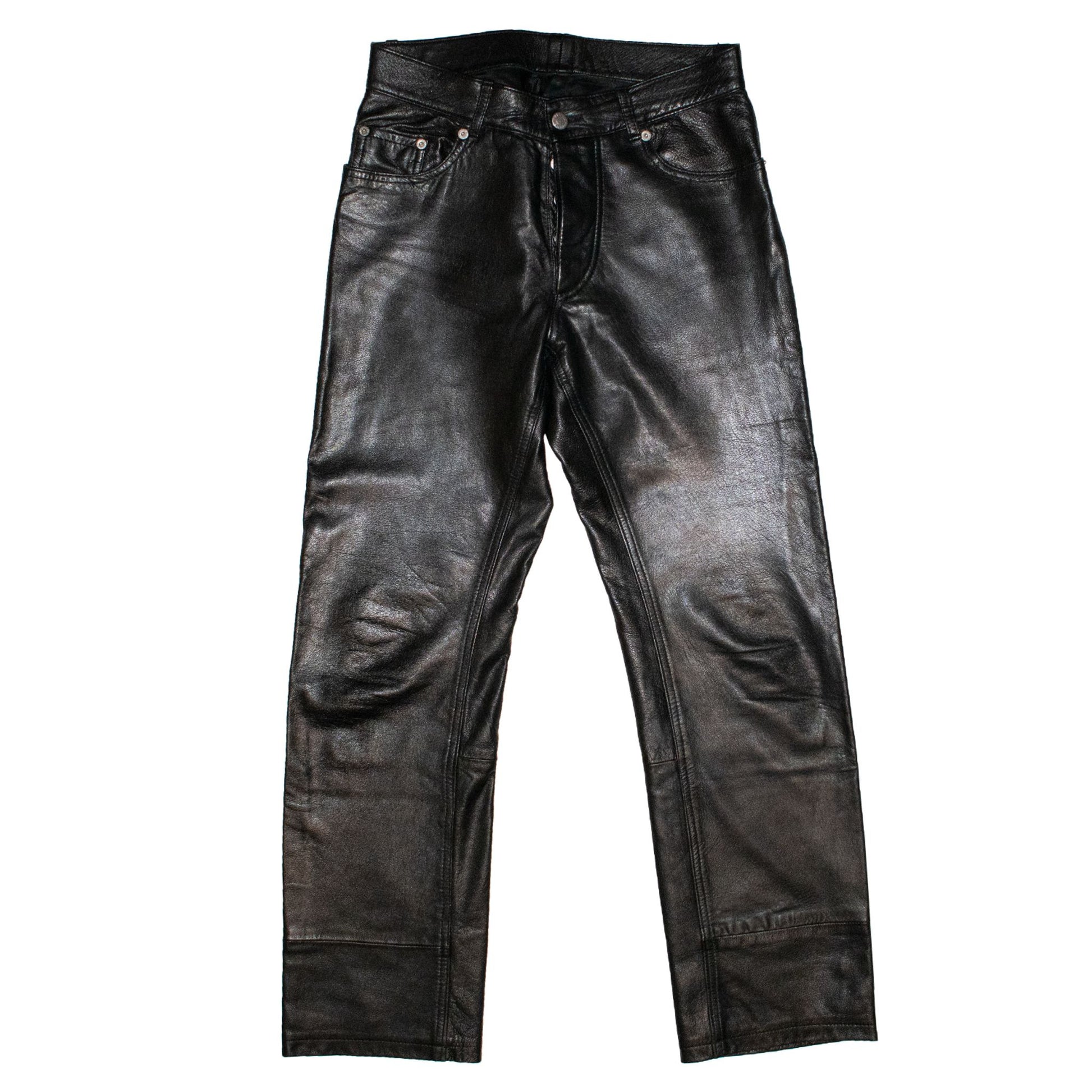Here we have a staple piece amongst archive Helmut Lang collectors – This pair of runway leather pants from Lang’s AW 1999 menswear collection is made entirely out of luxurious calfskin leather. Its 5-pocket, high rise, and bootcut design create a sophisticated silhouette that is unmatched.