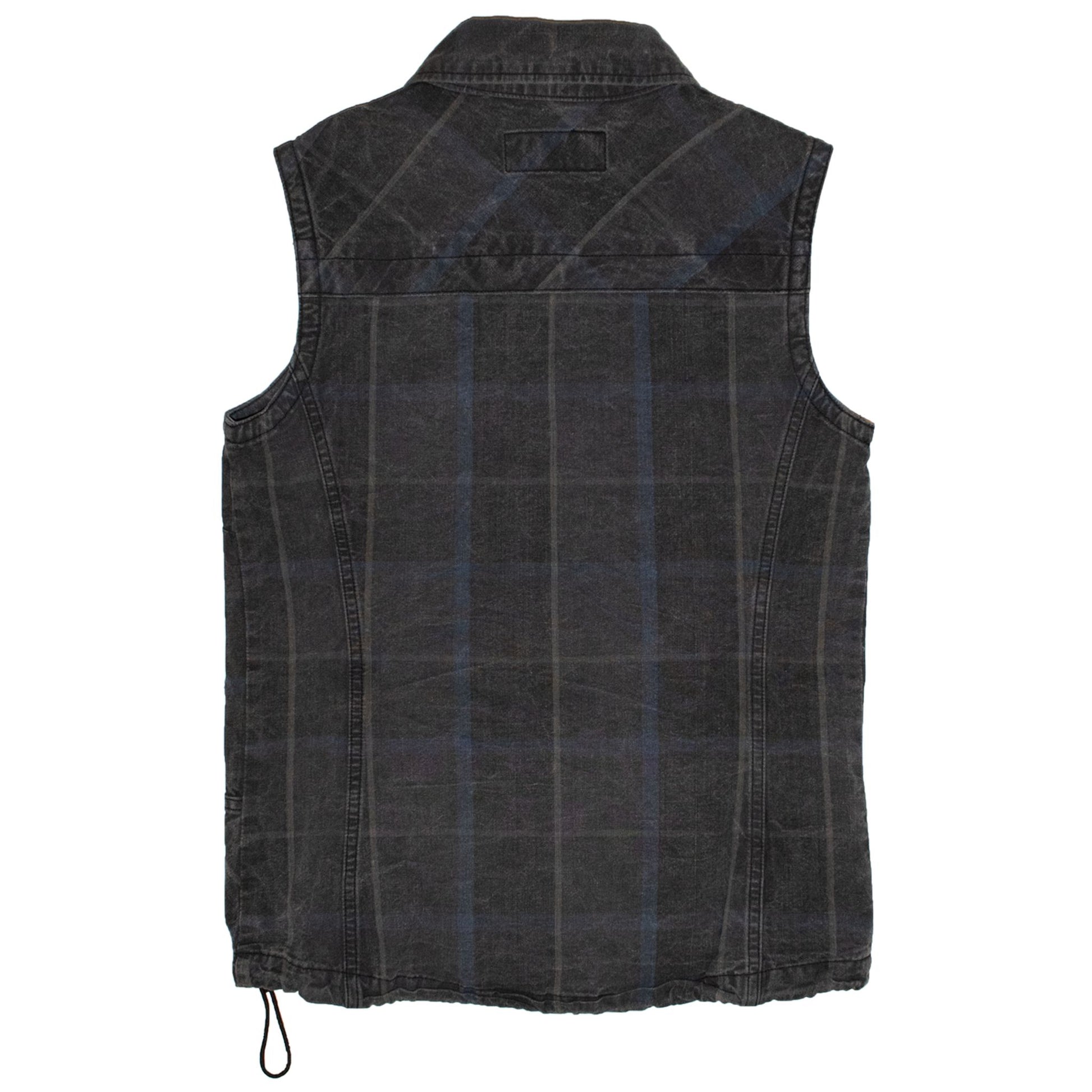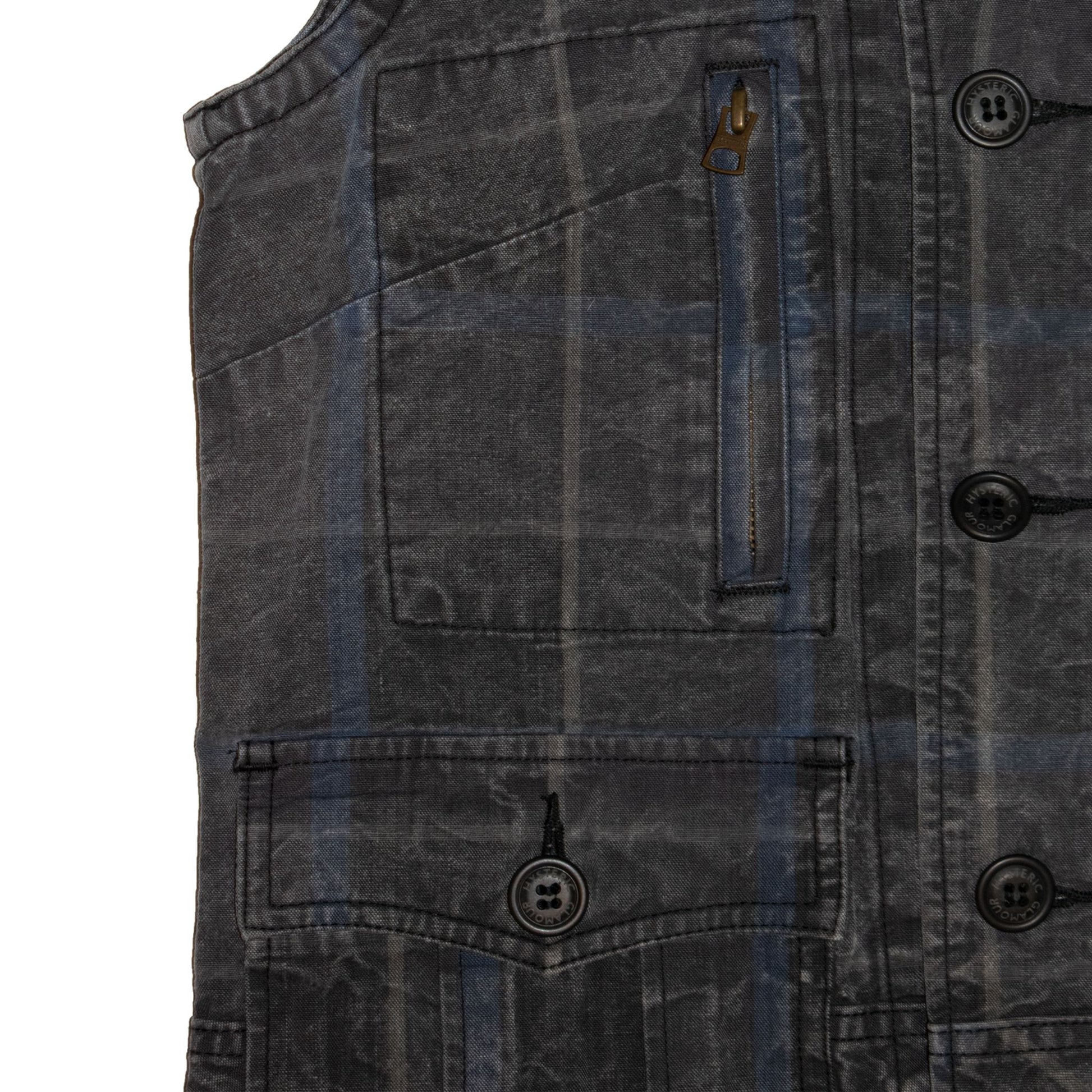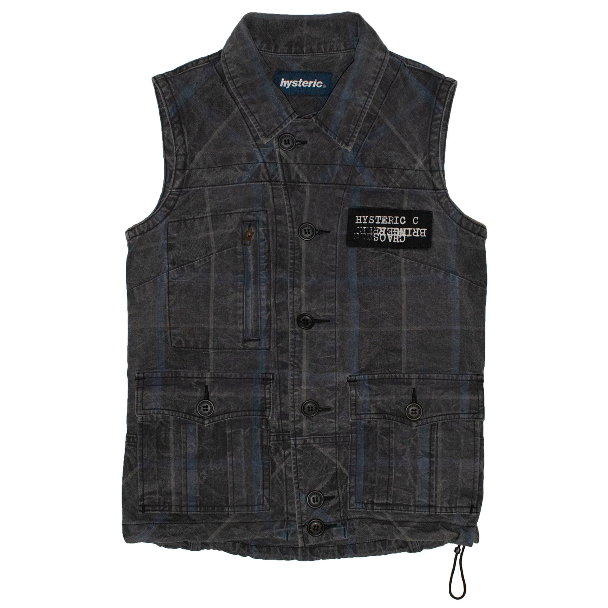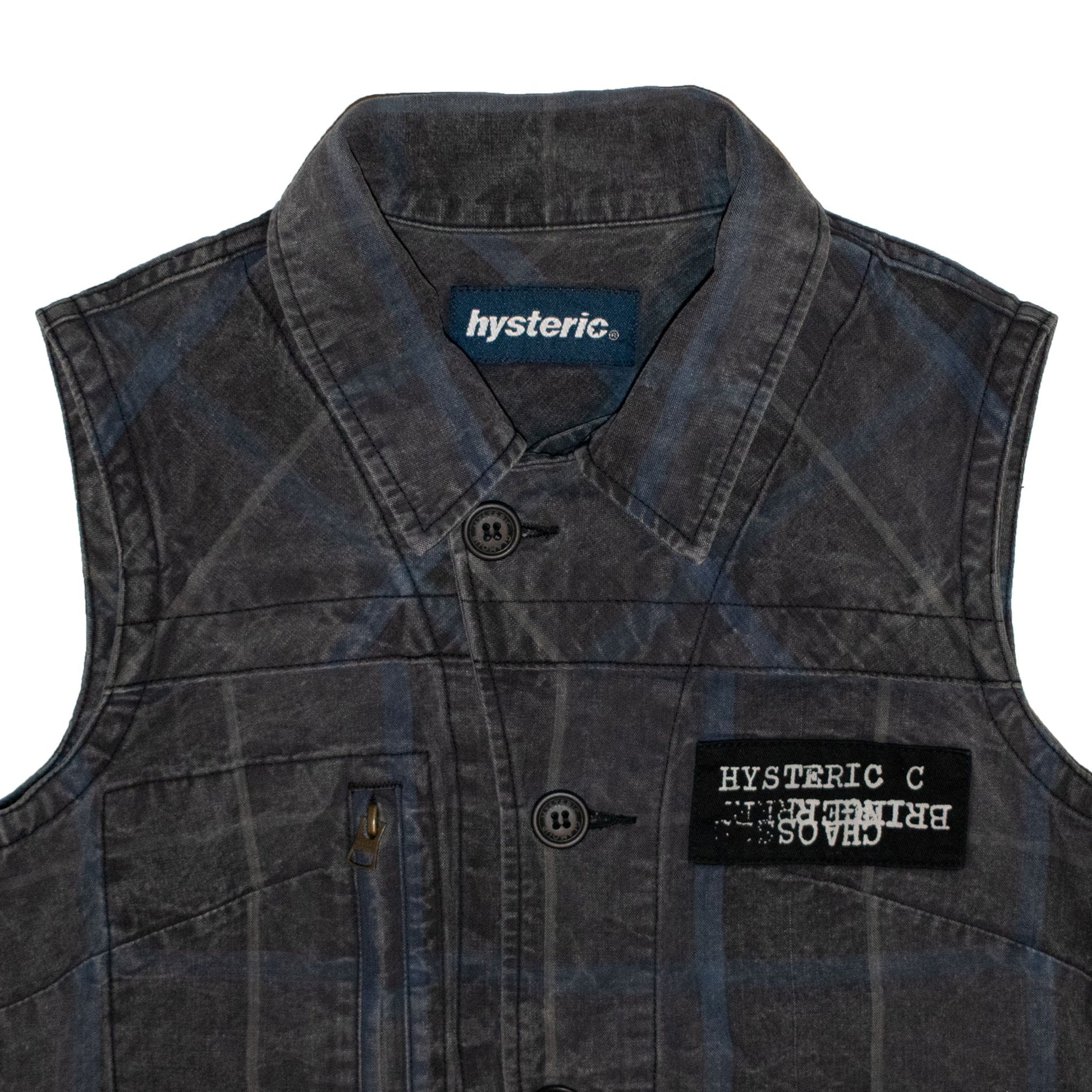 Here we have a sick vintage y2k vest from Hysteric Glamour by Nobuhiko Kitamura. This 100% cotton garment features a button-up design, multiple cargo-style pockets, a washed black/grey/blue plaid colorway, drawstring hem for an altered fit, and Hysteric’s popular typewriter motif patchworked on the left chest of the piece. This vest can be dressed up or down and is perfect for all seasons!