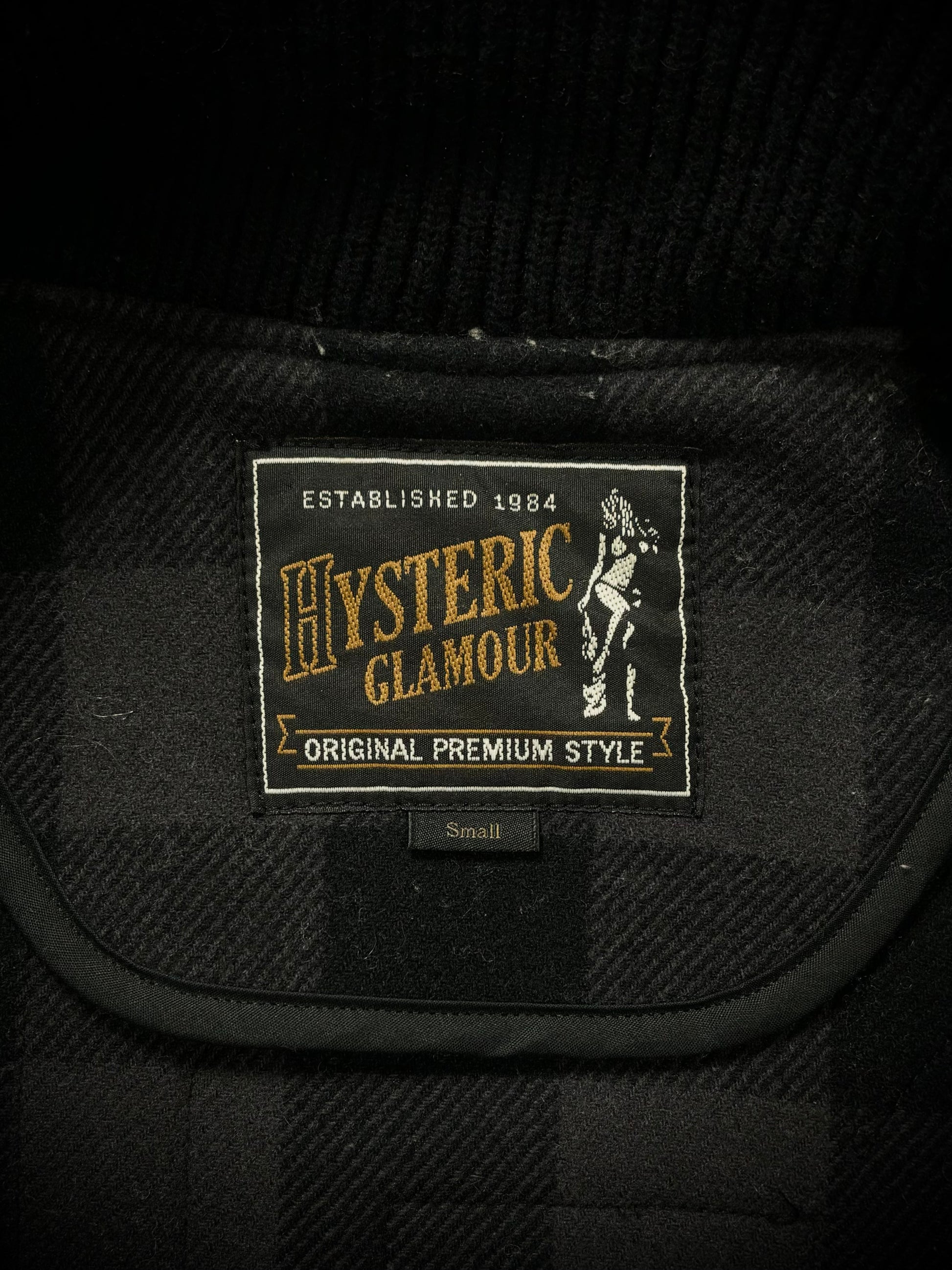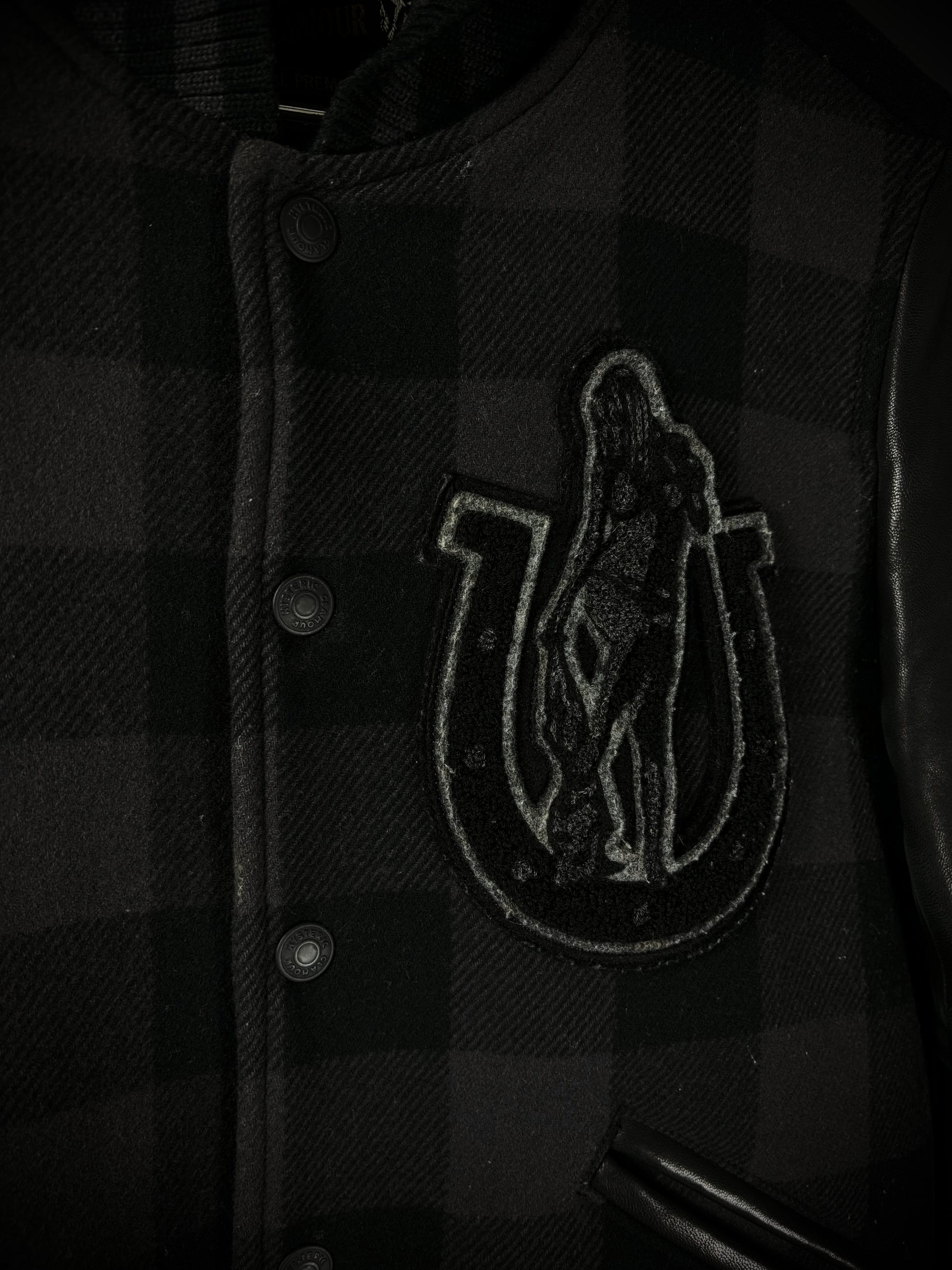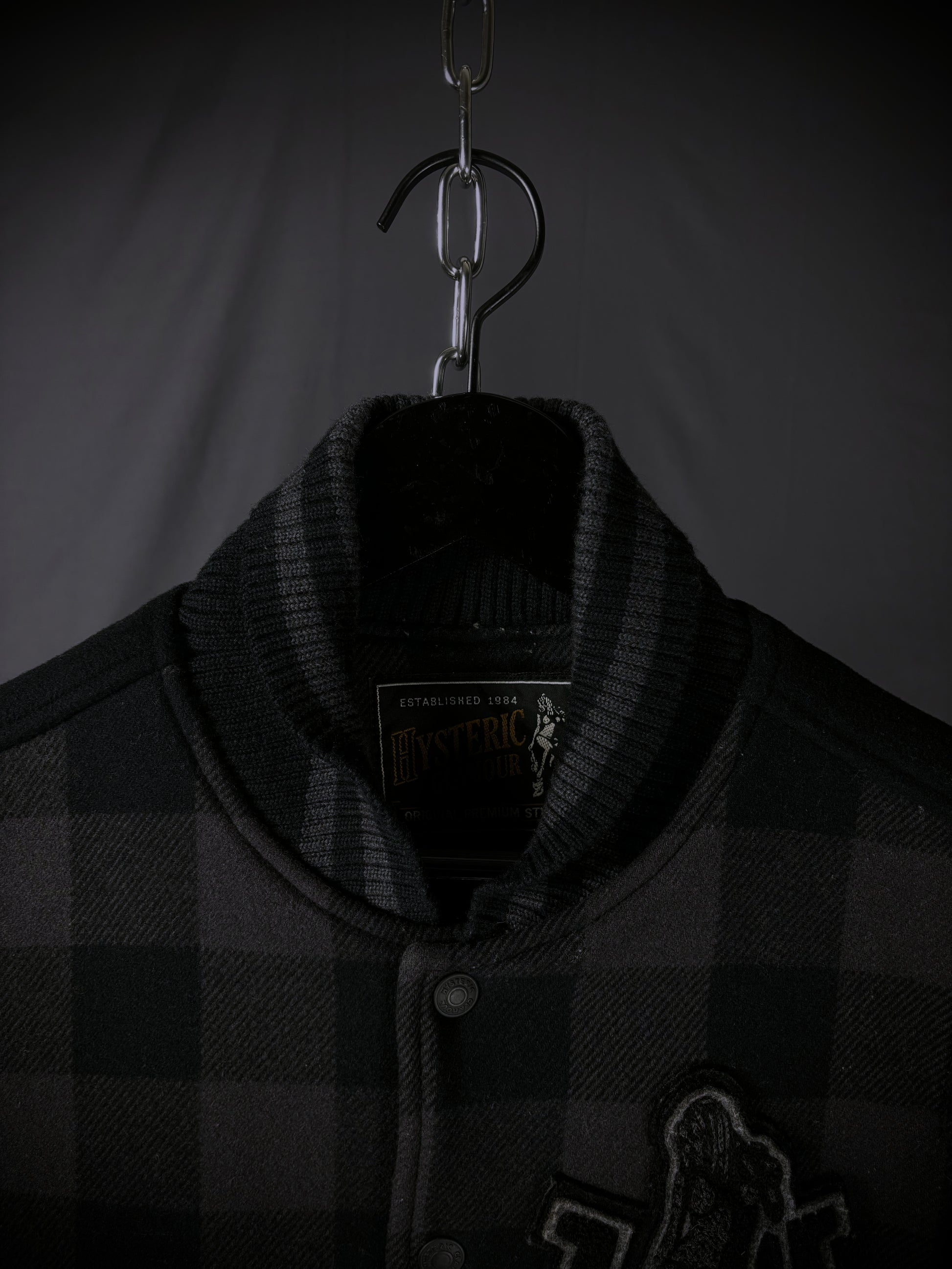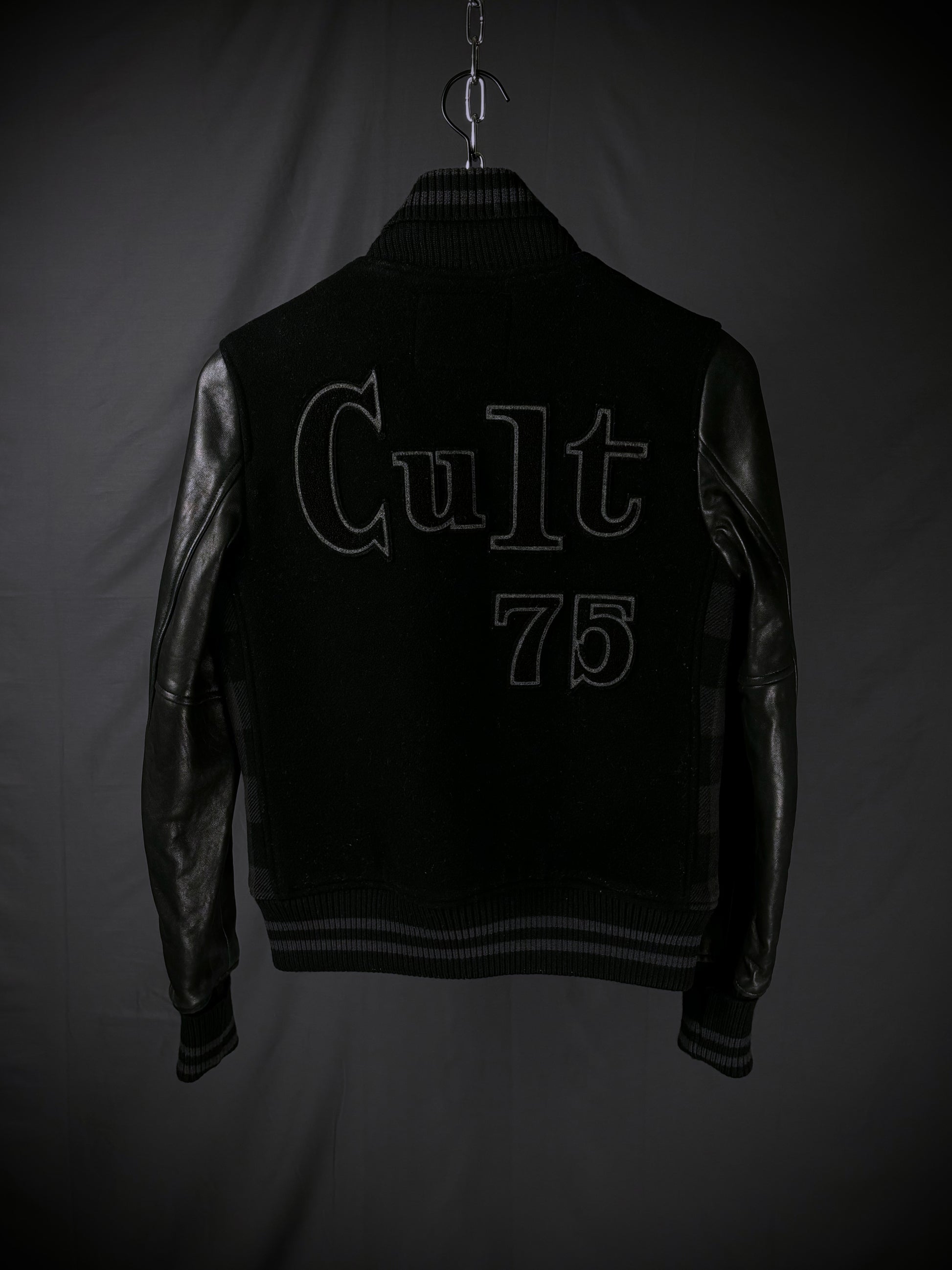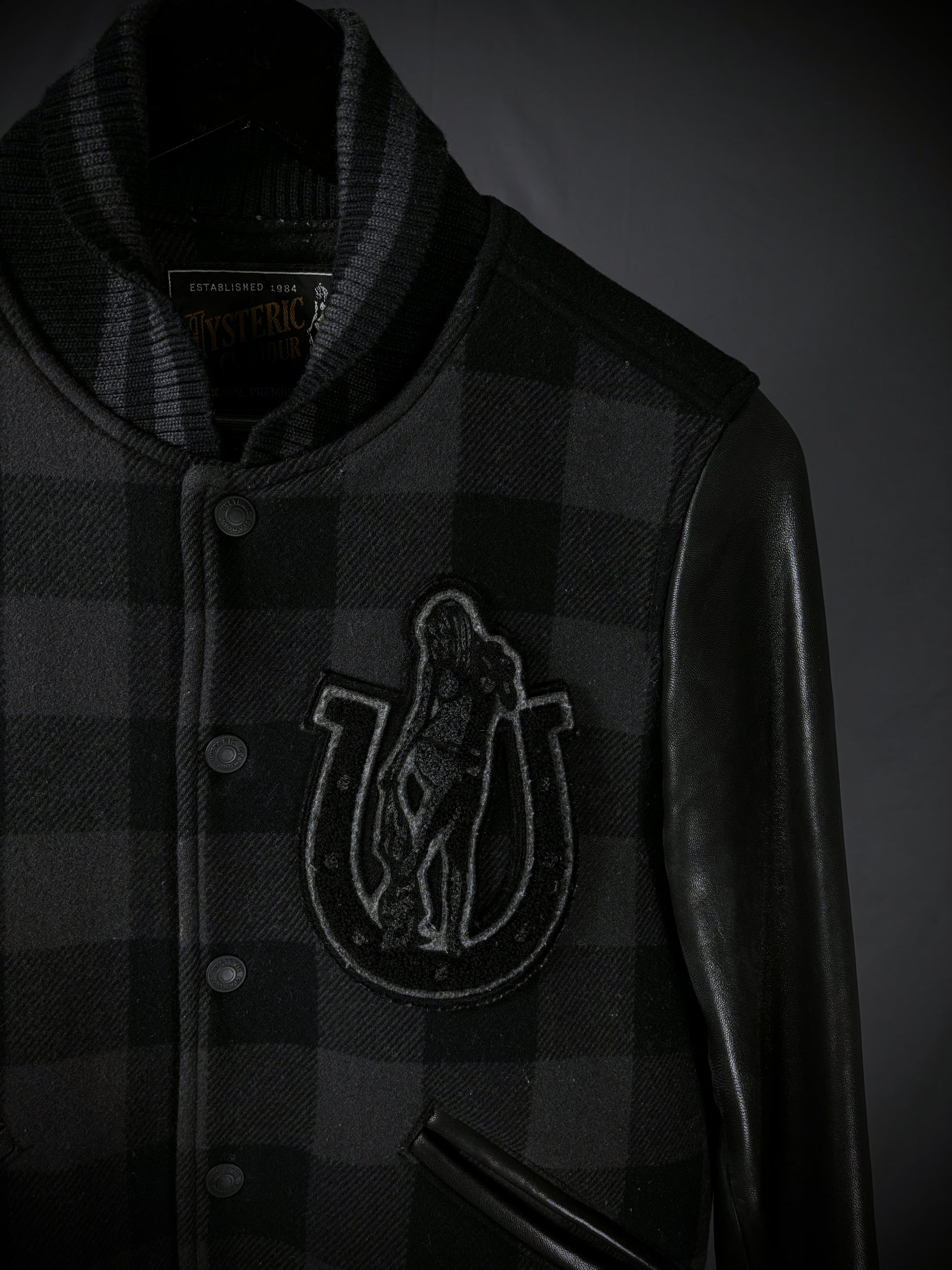 This Hysteric Glamour varsity jacket combines a wool/nylon body with premium sheepskin leather sleeves. Plaid accents adorn the front, while the ribbed knit collar, cuffs, and hem feature dark tones with subtle grey stripes. Details include a branded snap-button closure, welt pockets, and two signature varsity-style embroidered patches: a pin-up girl with a horseshoe on the chest and a bold “Cult 75” patchwork script along the back.