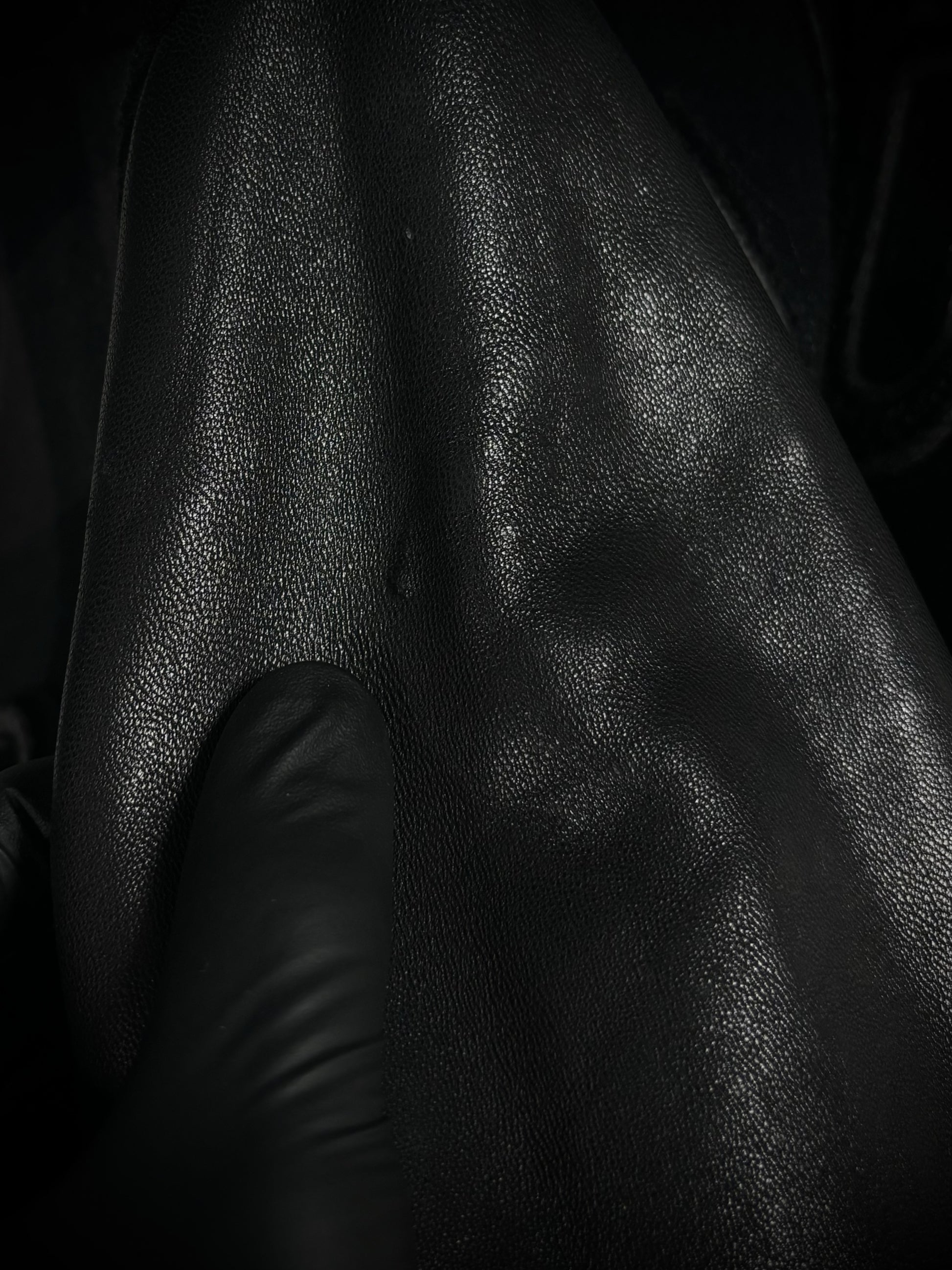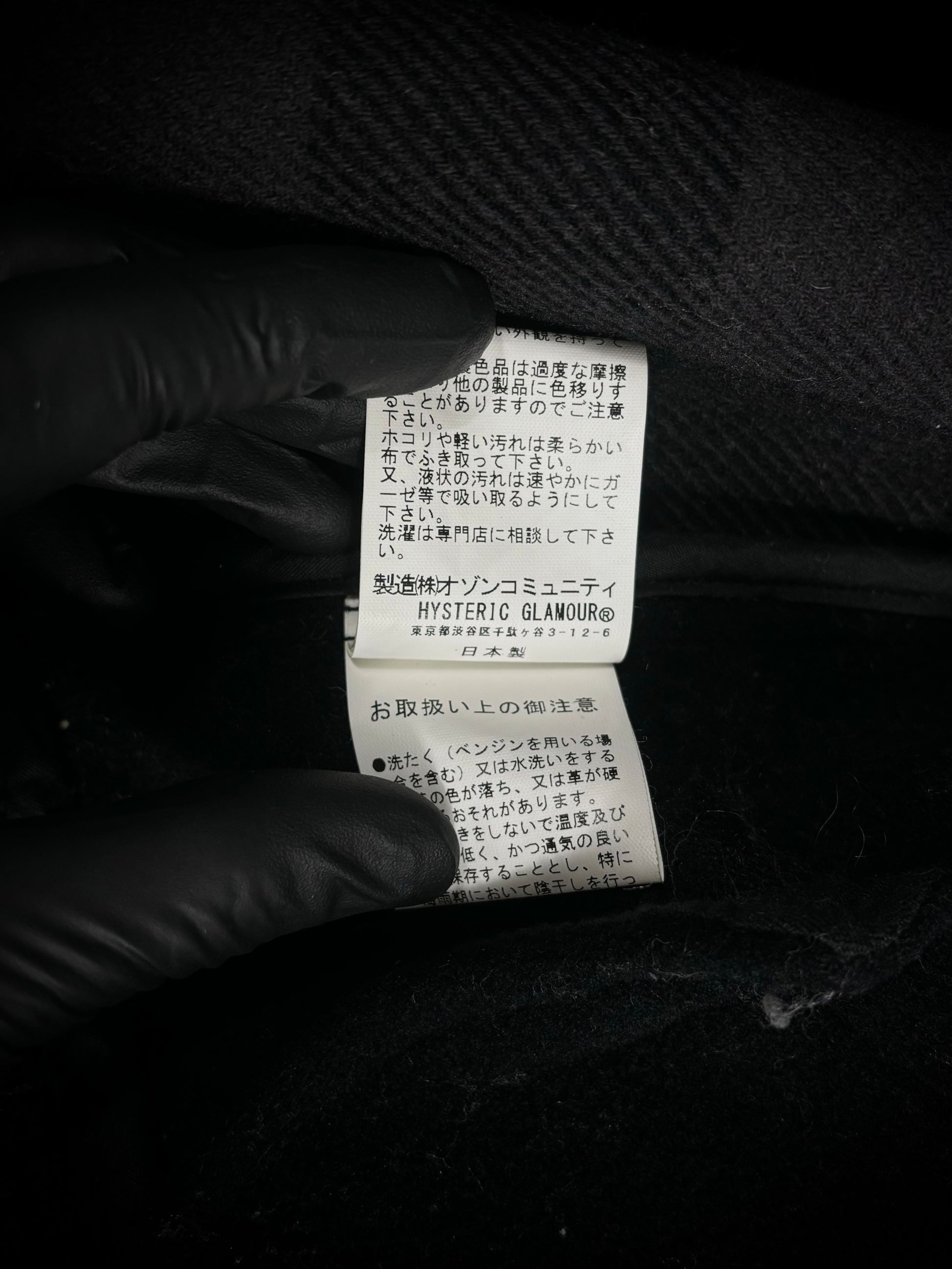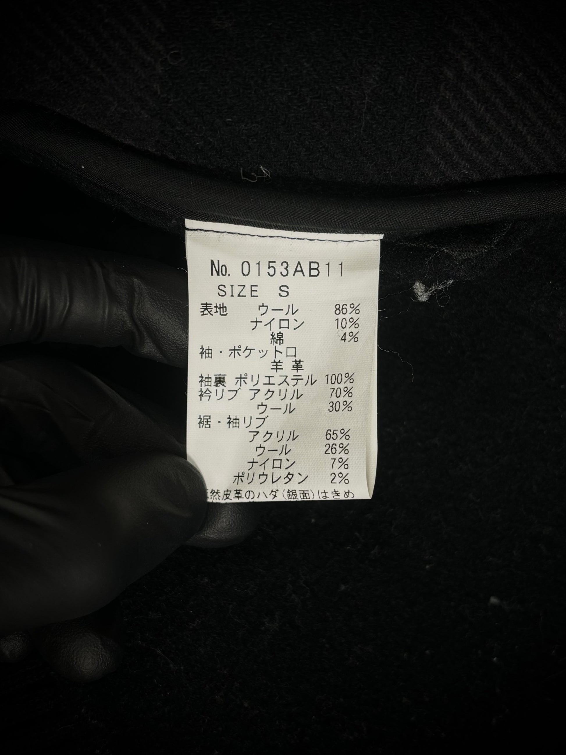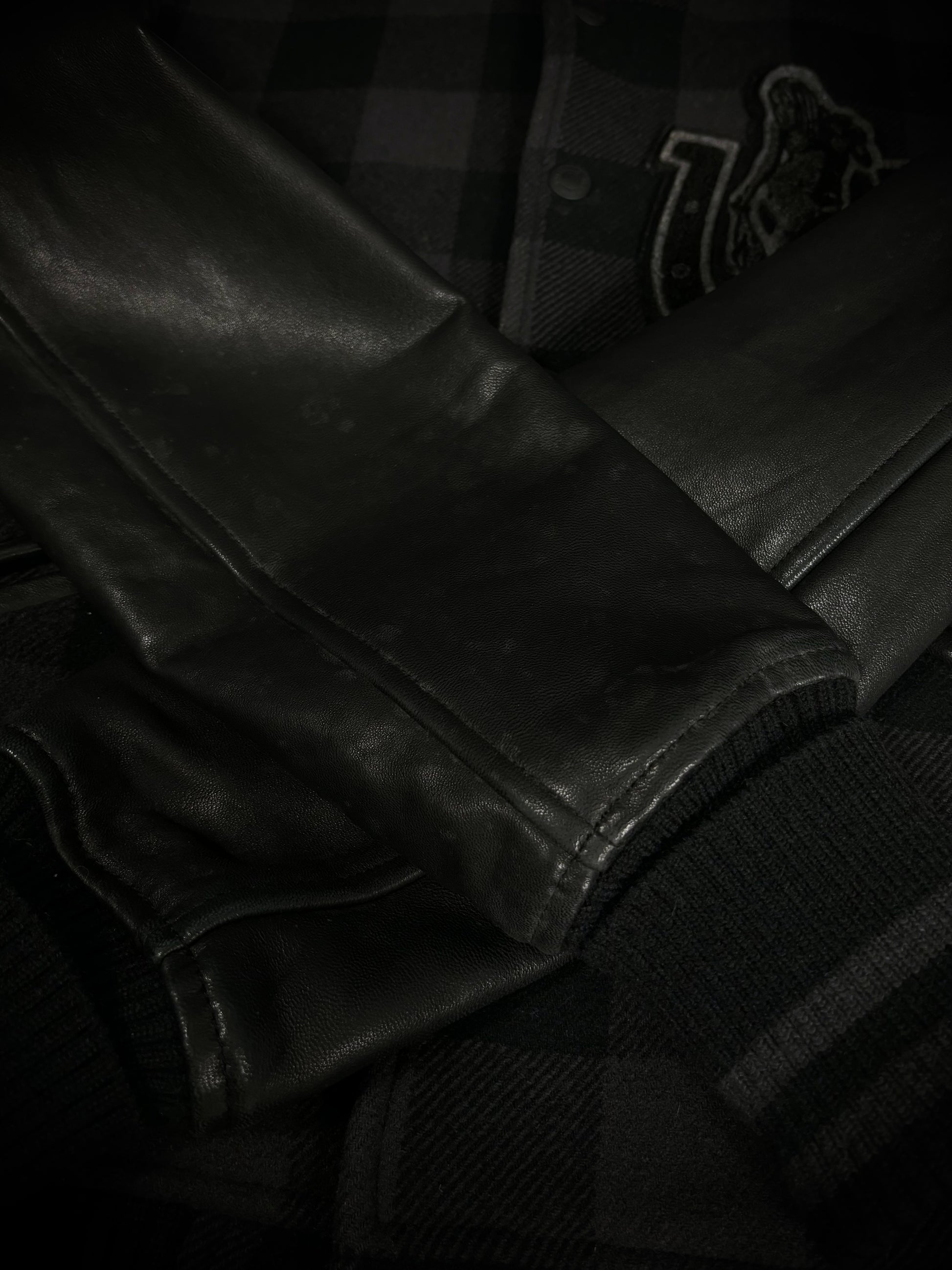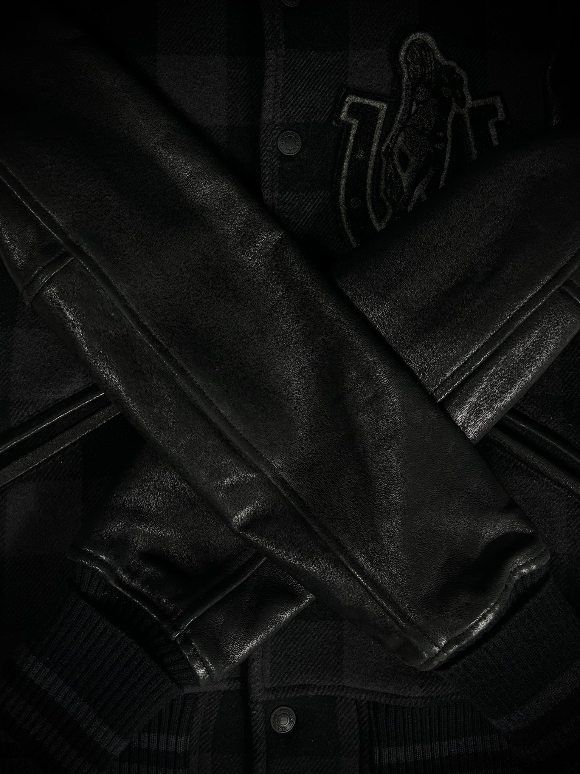 This Hysteric Glamour varsity jacket combines a wool/nylon body with premium sheepskin leather sleeves. Plaid accents adorn the front, while the ribbed knit collar, cuffs, and hem feature dark tones with subtle grey stripes. Details include a branded snap-button closure, welt pockets, and two signature varsity-style embroidered patches: a pin-up girl with a horseshoe on the chest and a bold “Cult 75” patchwork script along the back.