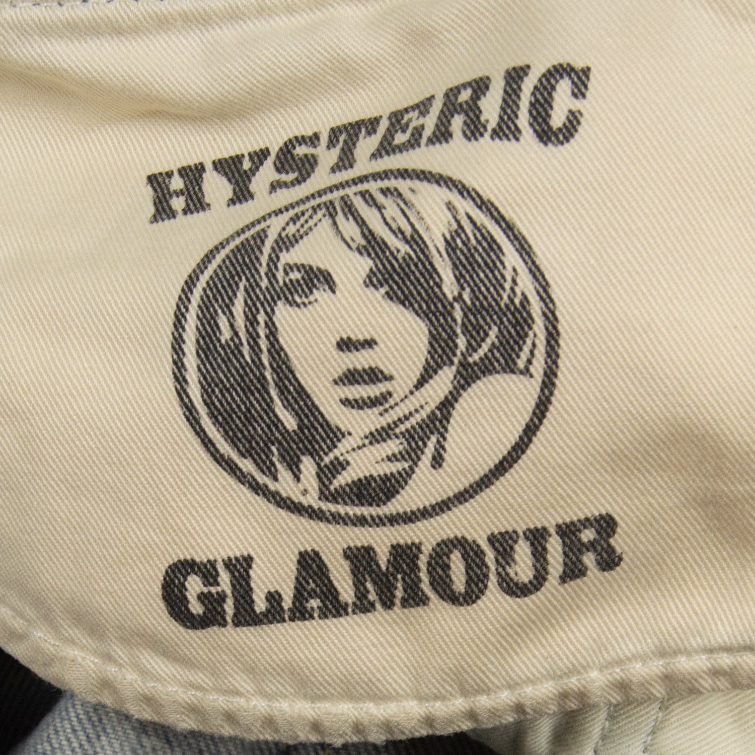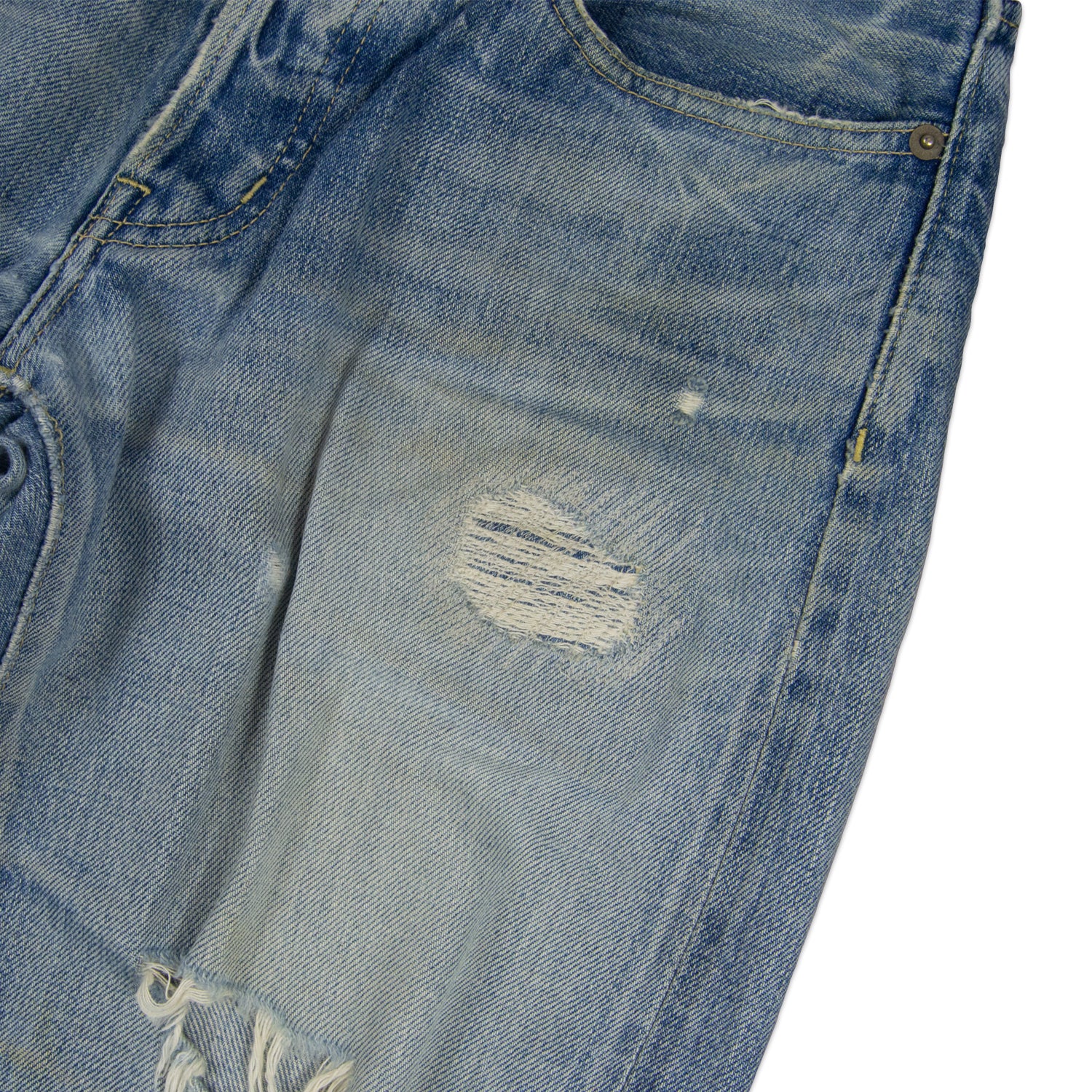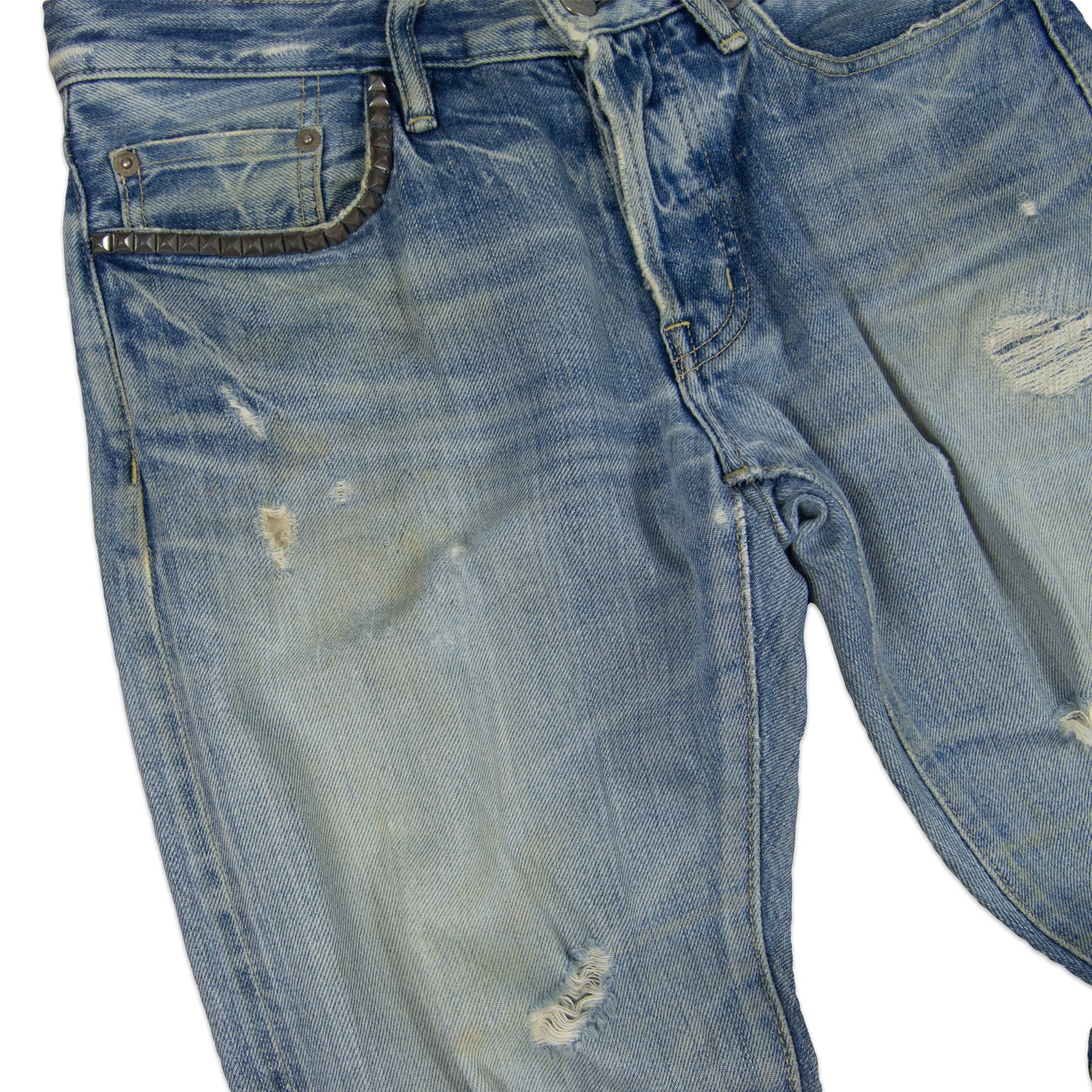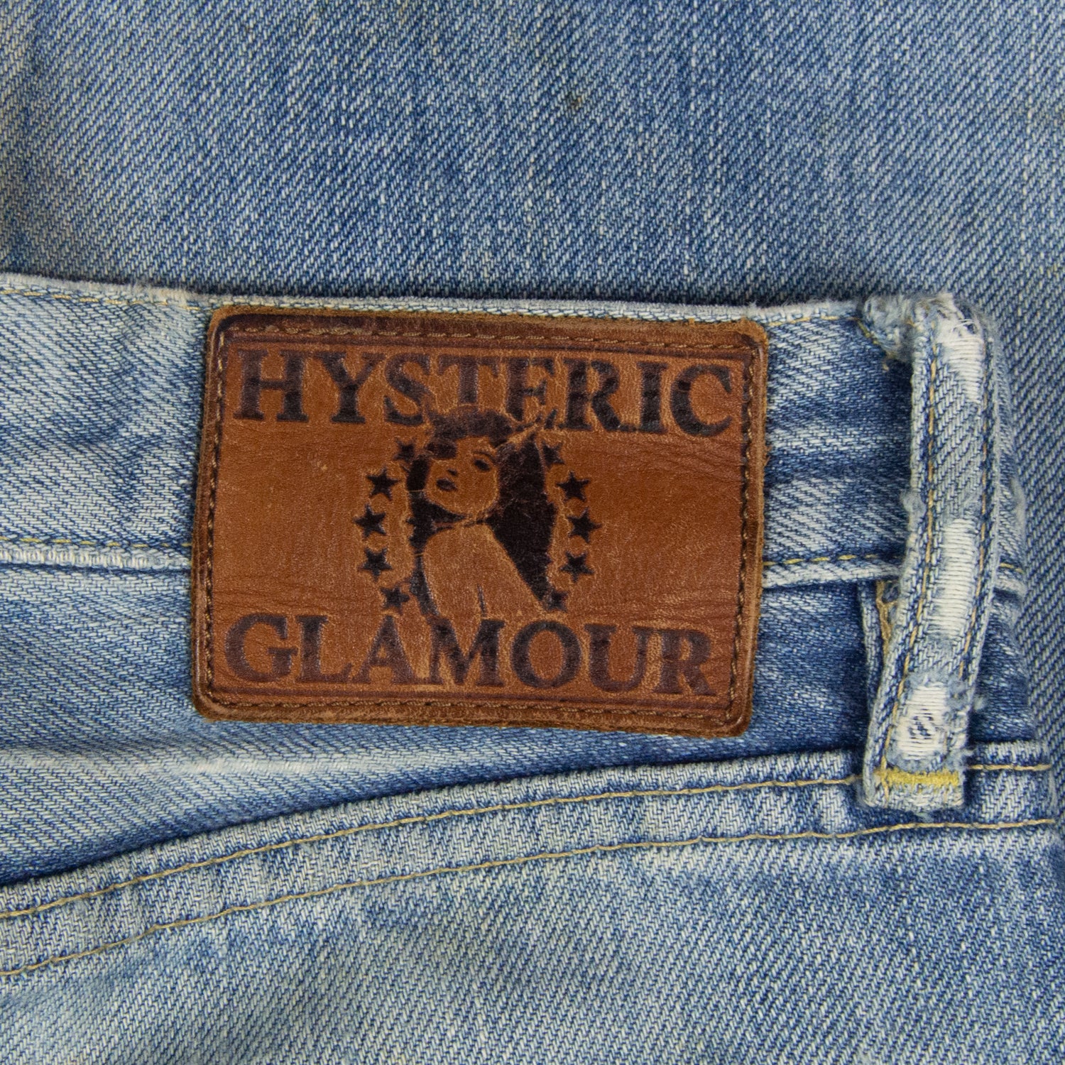 This pair of 5-pocket denim from the Japanese brand Hysteric Glamour features an elegantly aged light wash accompanied by instances of distressing throughout and the brand's signature studded pocket and pin-up leather patch on the waist. Ā