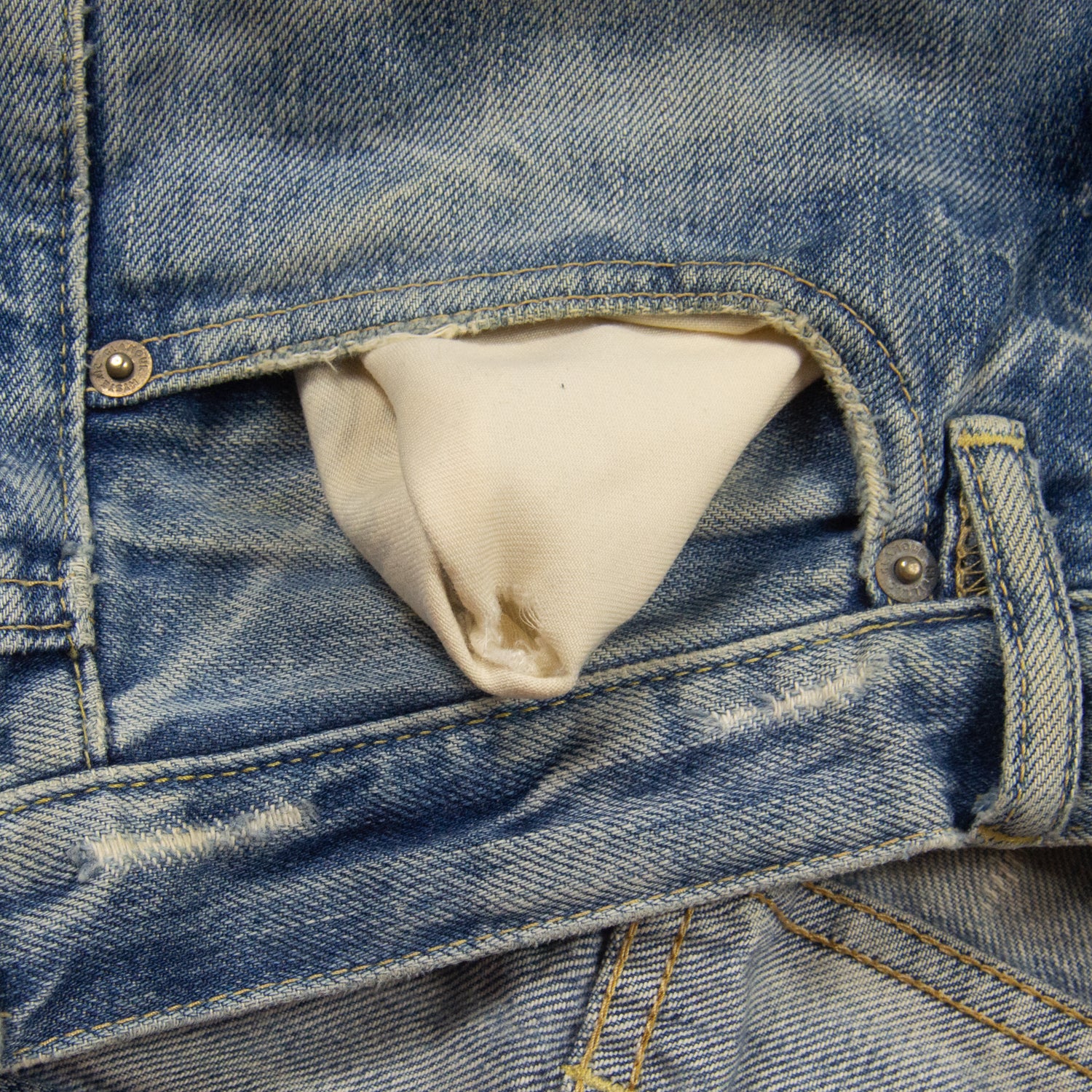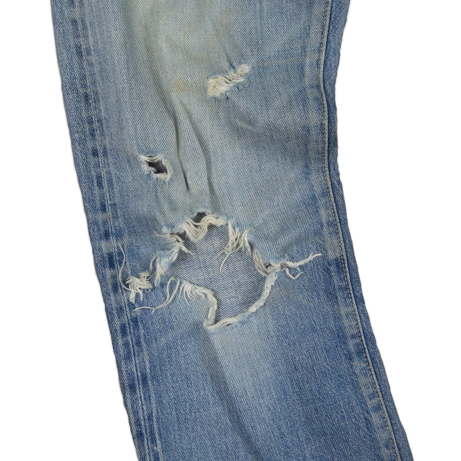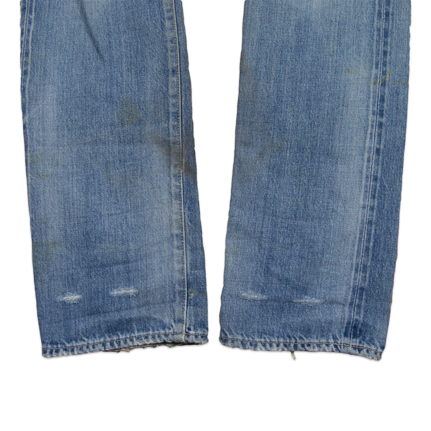 7/10 ā Item is in good condition overall. Fading & distressing from wear, stain markings throughout, and a small hole in left-front pocket.