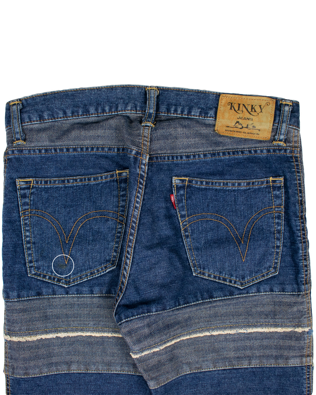 Here we have a pair of the iconic Hagi denim by Hysteric Glamour. This piece features punk-inspired reconstructed panels with raw seams and shredding, Hysteric’s “Kinky Jeans” leather patch, a red Hysteric tag on the back-right pocket, and a skinny, flared fit.