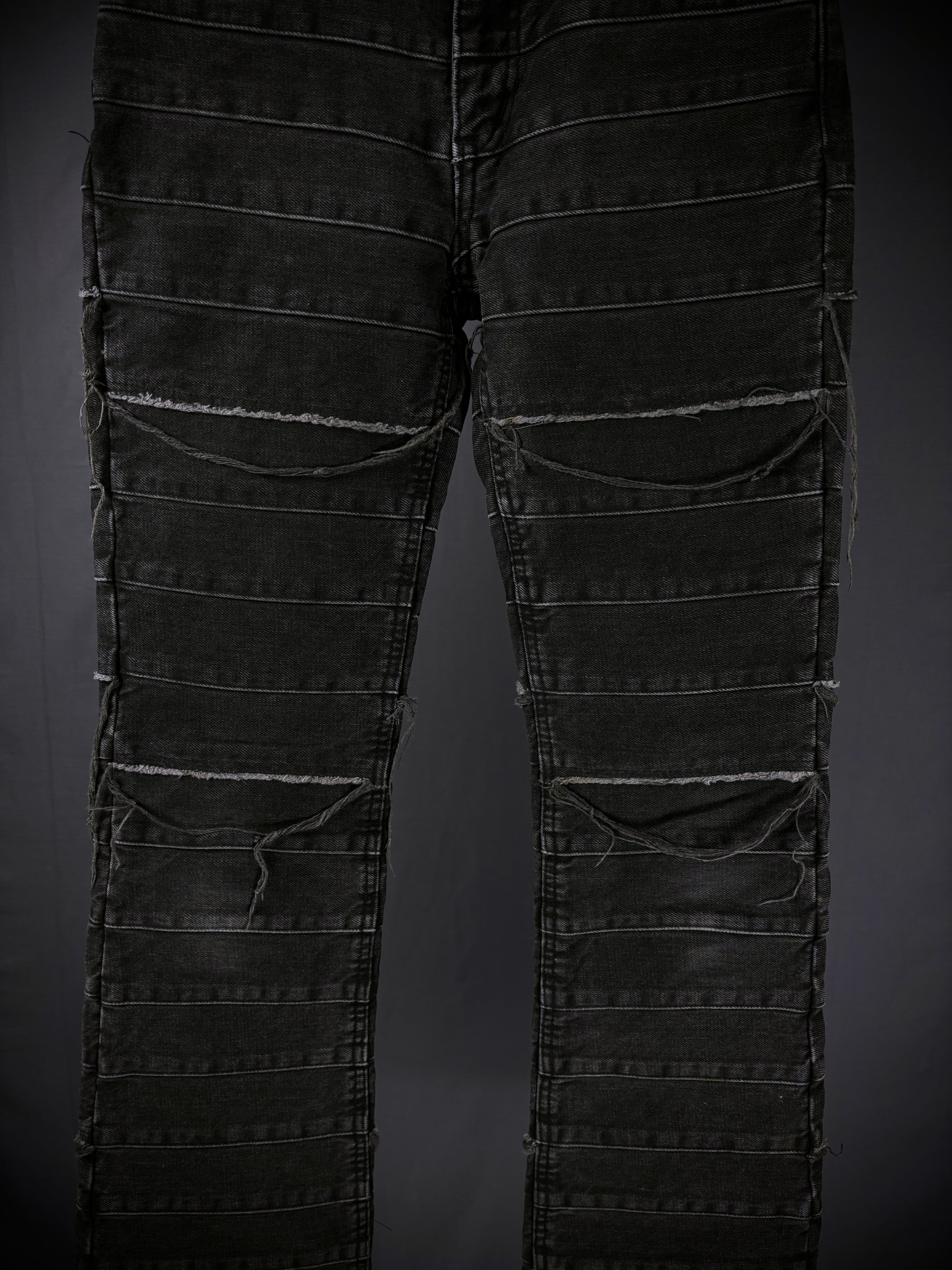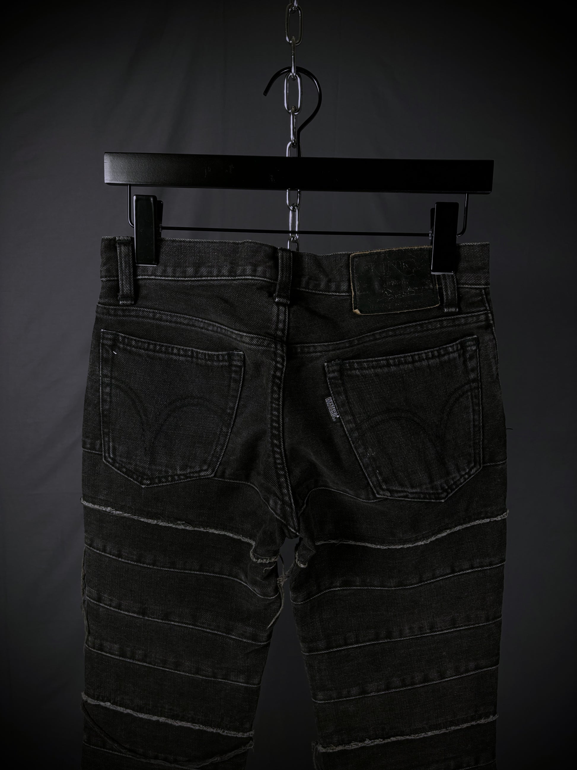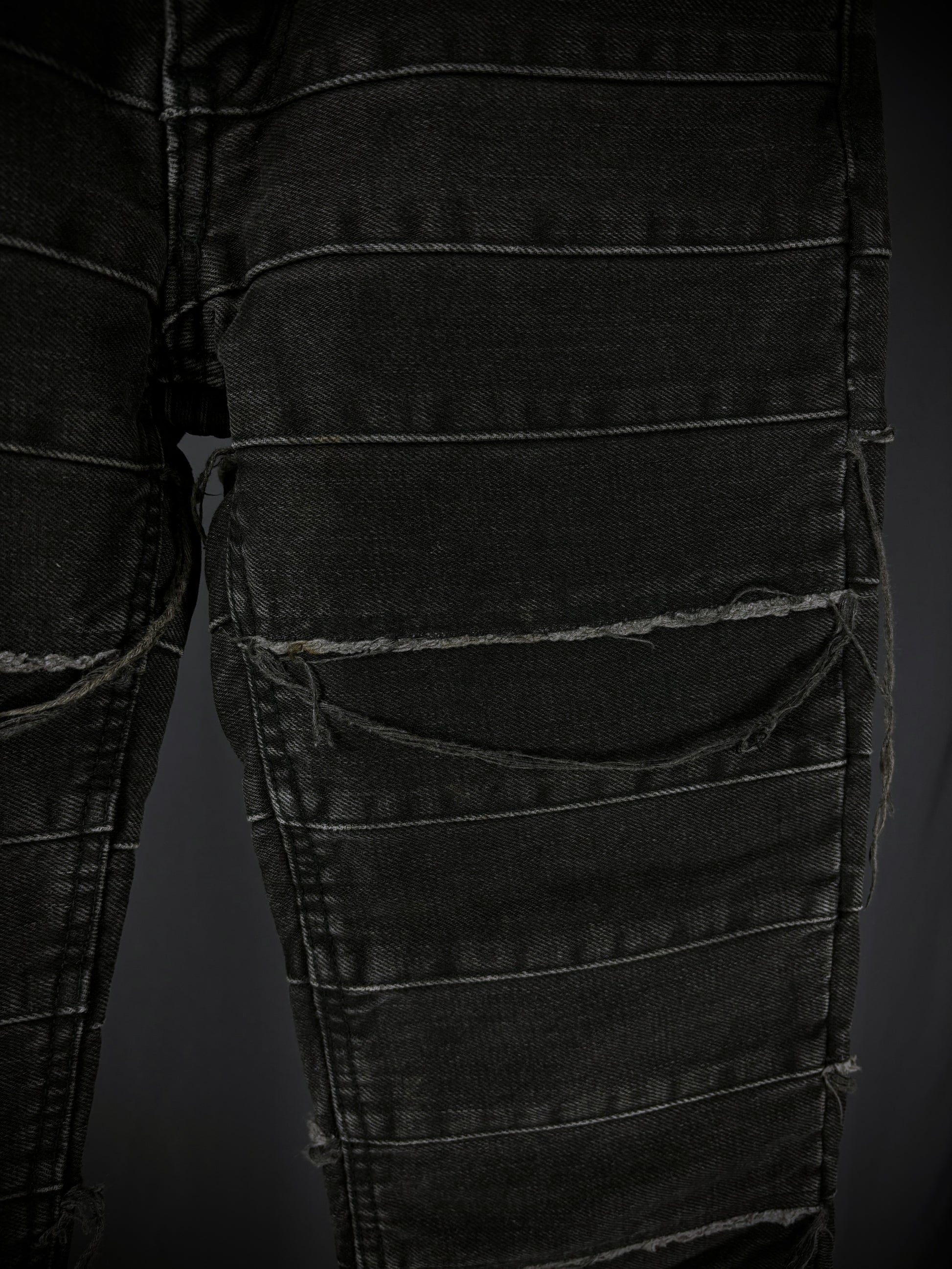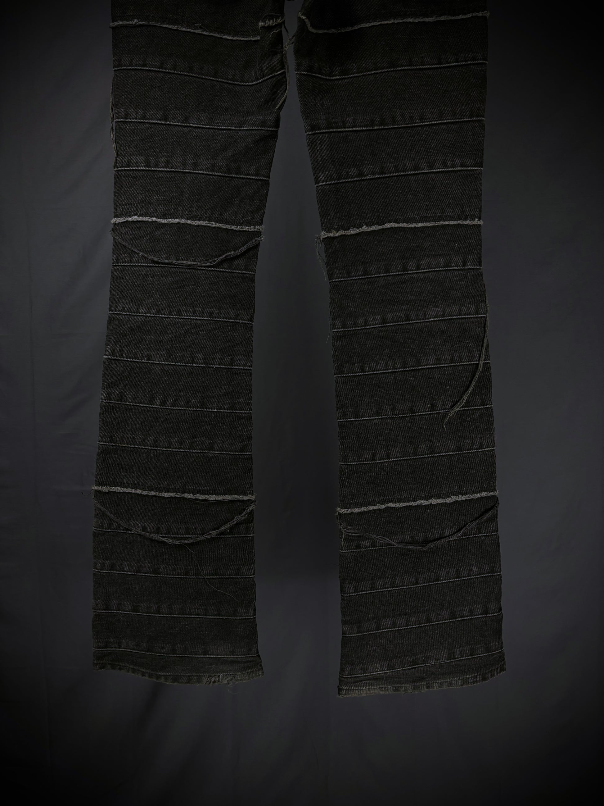 This iconic pair of Hysteric Glamour Hagi denim from the early 2000s (rare black tag variant) comes in black, elegantly faded over time into an almost grey colorway. It features the beloved patchwork “Hagi” motif throughout, accompanied by distressed fringe detailing and a flattering flared silhouette.