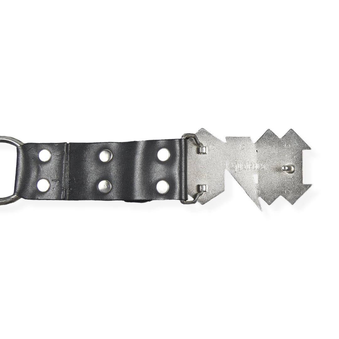 This late ’90s - early 2000’s rock inspired leather bondage belt from Hysteric Glamour’s high-end ‘Hysterics’ line features a kiss-inspired HG lightning bolt motif buckle, bondage-esque O-rings, and other silver trimmings that contrast exceptionally well with the belt's black leather base.