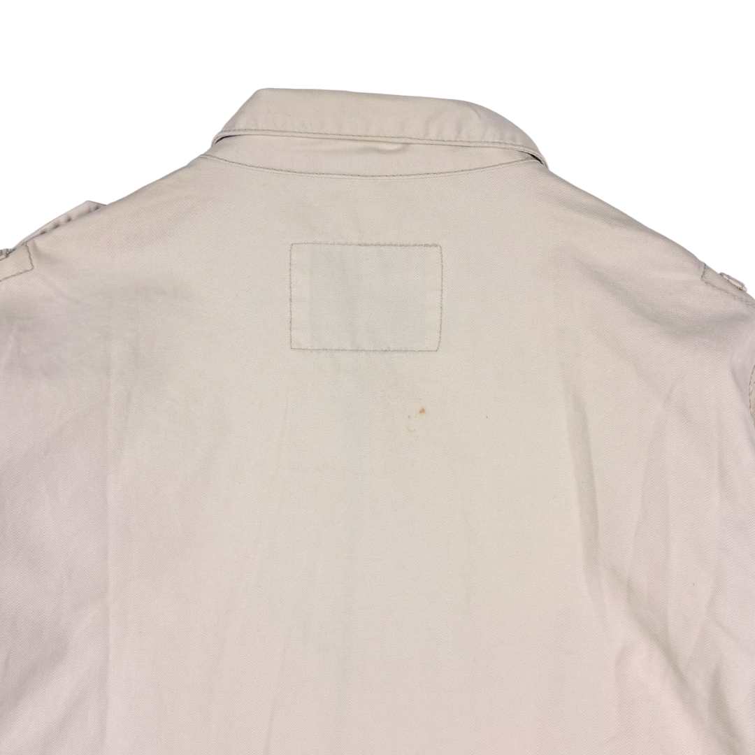 This 100% cotton canvas field jacket from the Japanese brand Hysteric Glamour features various screen prints, including the branded slogan on the front and an eye-catching skeleton motif on the back. The garment comes equipped with various-sized button-clasped pockets for functionality, boasting a militaristic design.