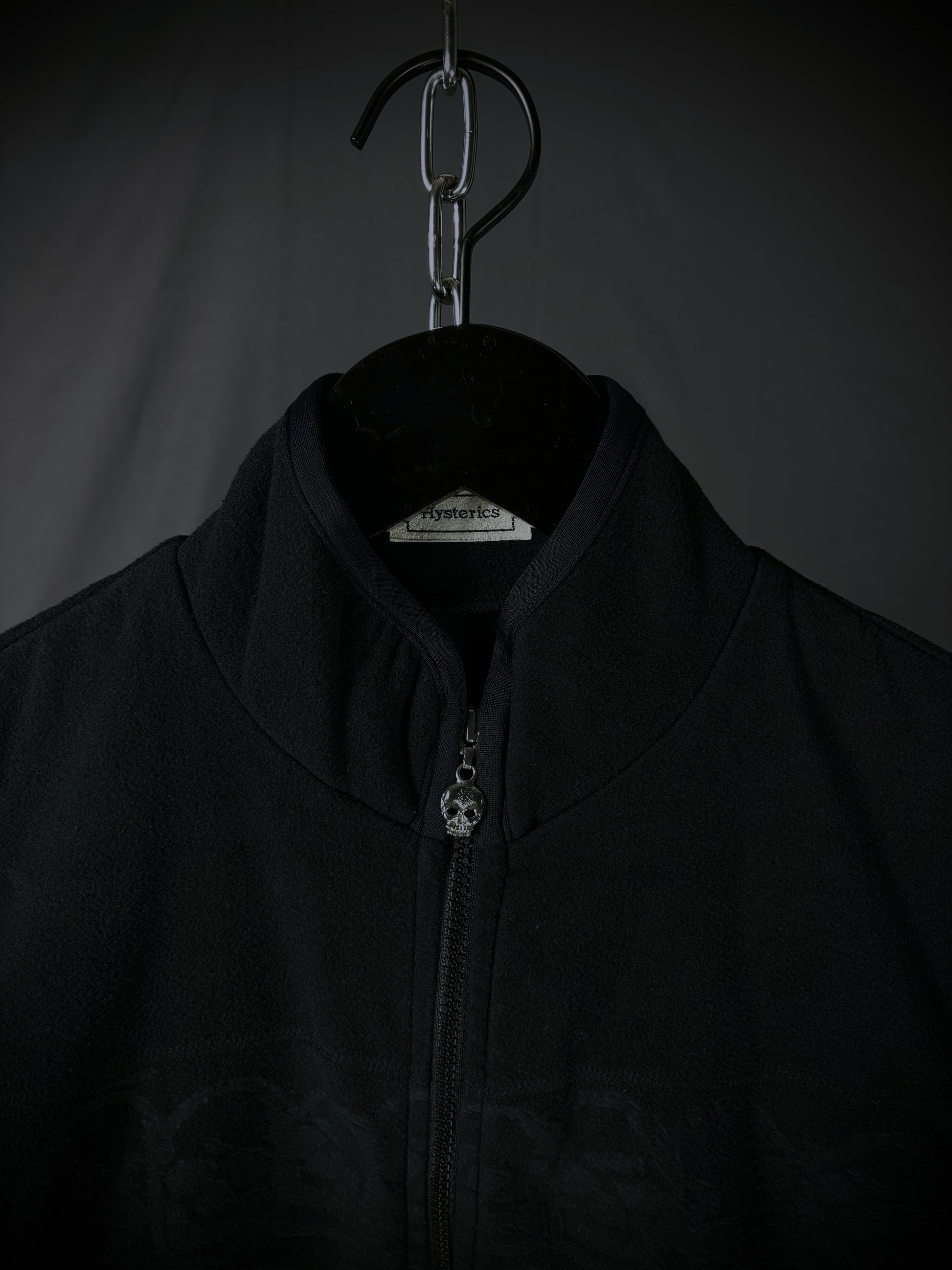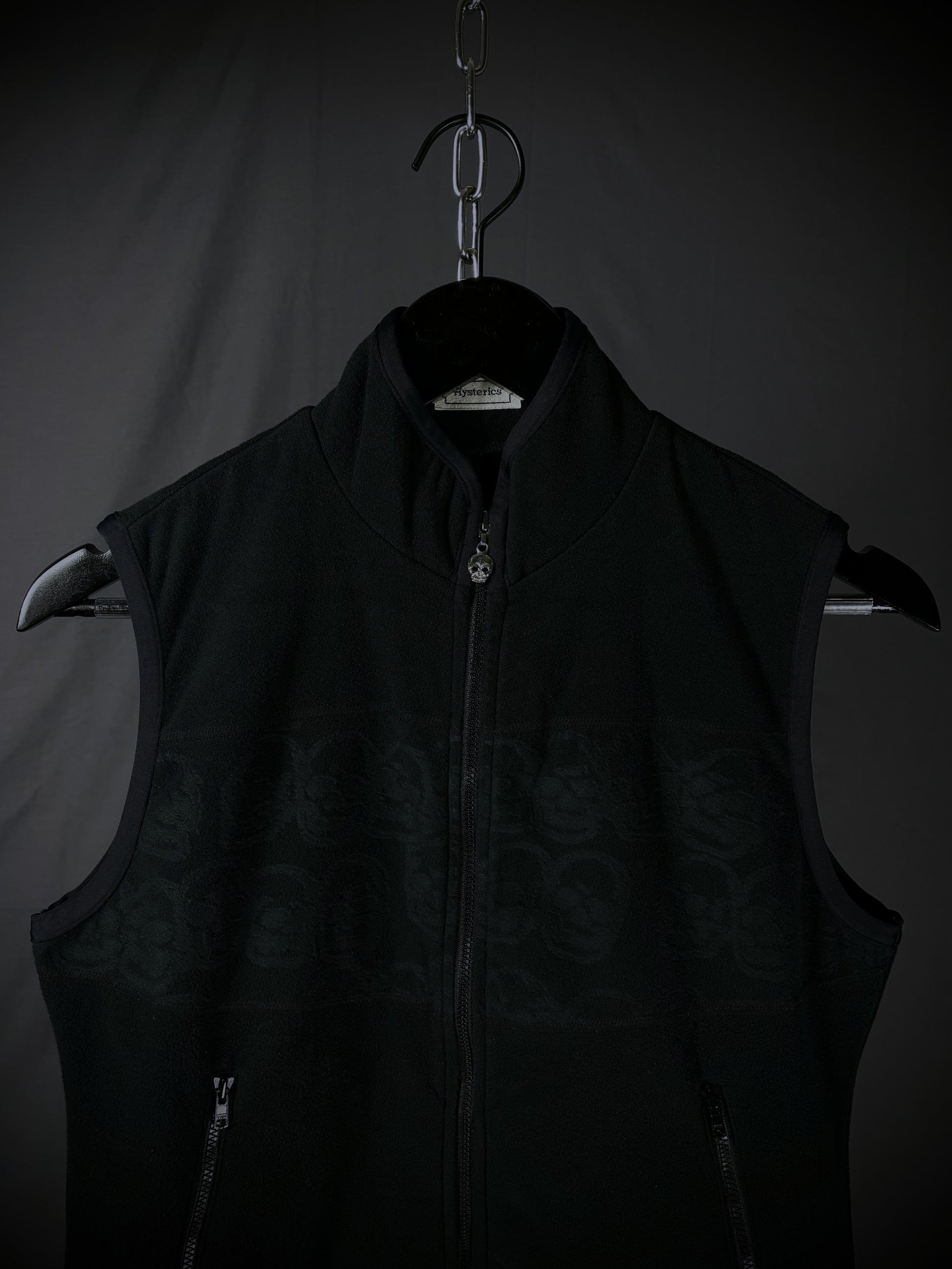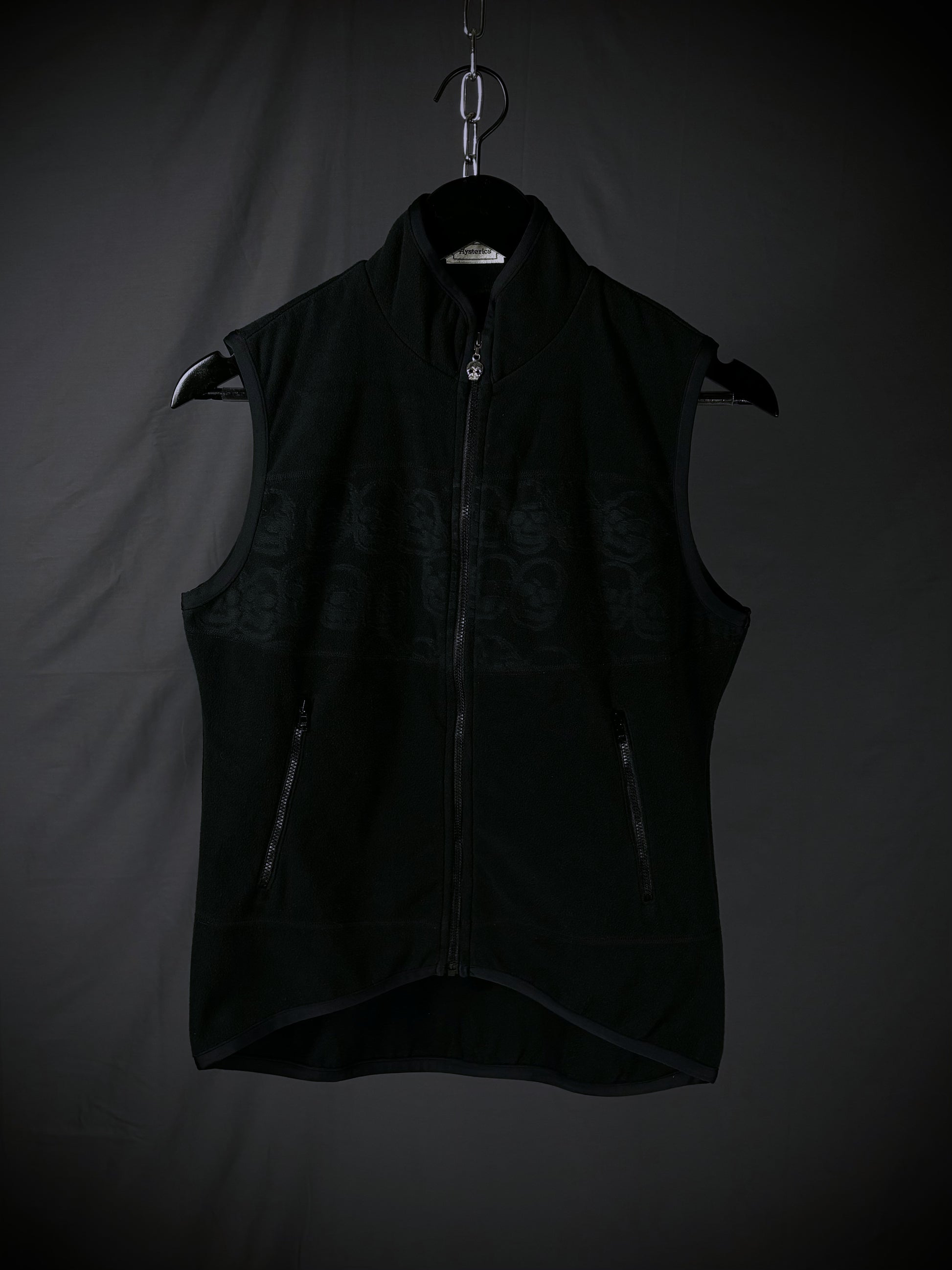 This vest from the Japanese brand Hysteric Glamour is crafted from soft black low-pile fleece. It features a stand-up collar, a full front zip closure with a skull pull tab, two slanted zip pockets, and the brand's iconic tonal all-over skull motif embossed on the chest.