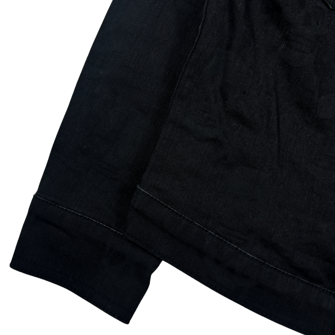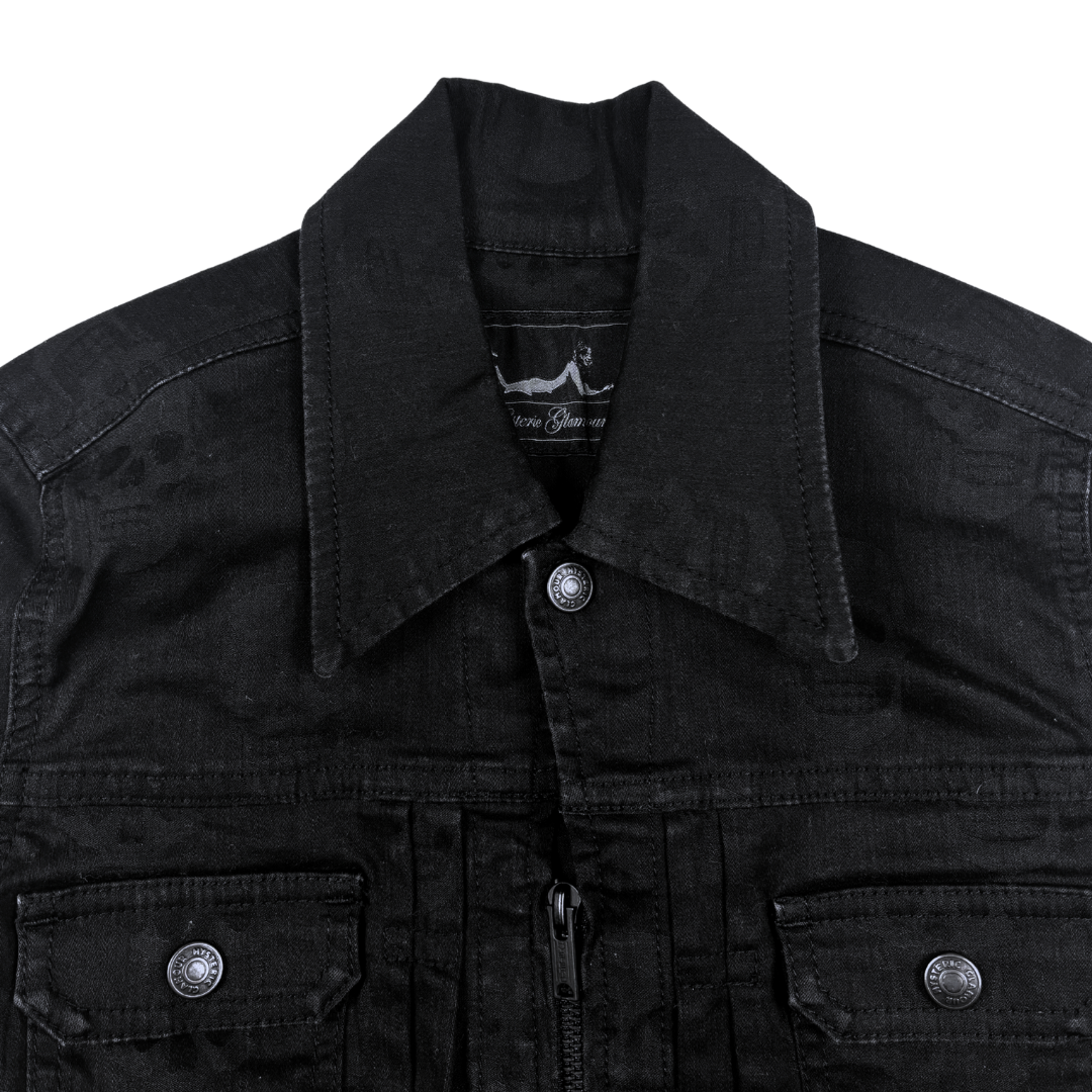 This jacket by the Japanese brand Hysteric Glamour features a classic trucker silhouette with a pointed collar, button-flap chest pockets, and clean vertical seam detailing. Crafted from black canvas cotton, it’s accented with a subtle tonal skull pattern woven throughout the fabric.
