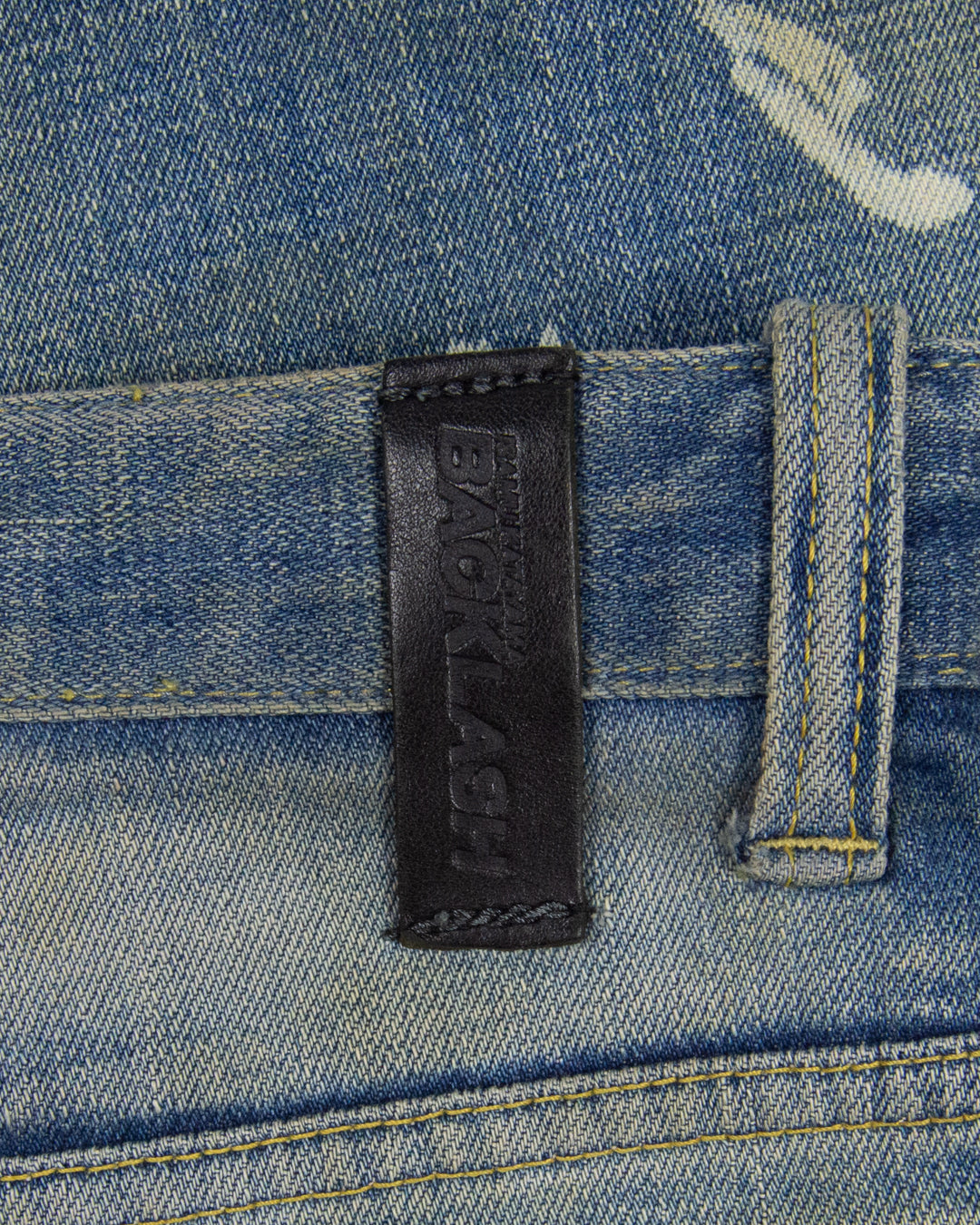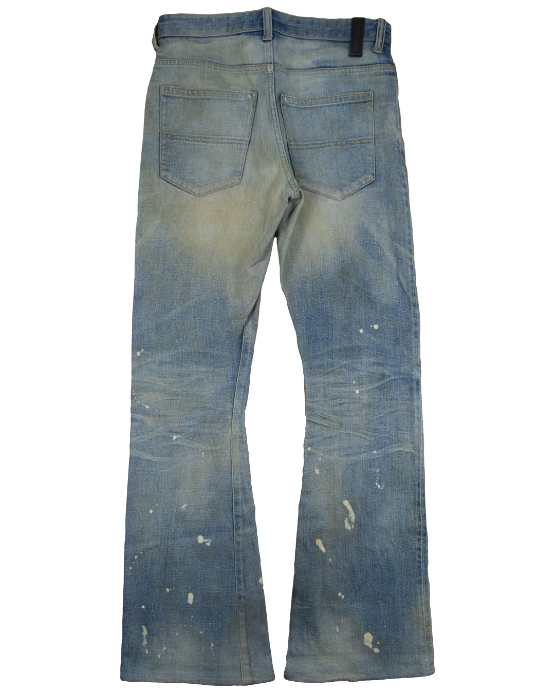 Here we have an eye-catching pair of denim from Isamu Katayama Backlash. This pair of four-pocket flared jeans feature numerous details such as a stunning light wash accompanied by a processed marbling effect found throughout the garment. This piece also includes accents of paint and dyed markings that give the denim a worn look alongside various instances of distressing.