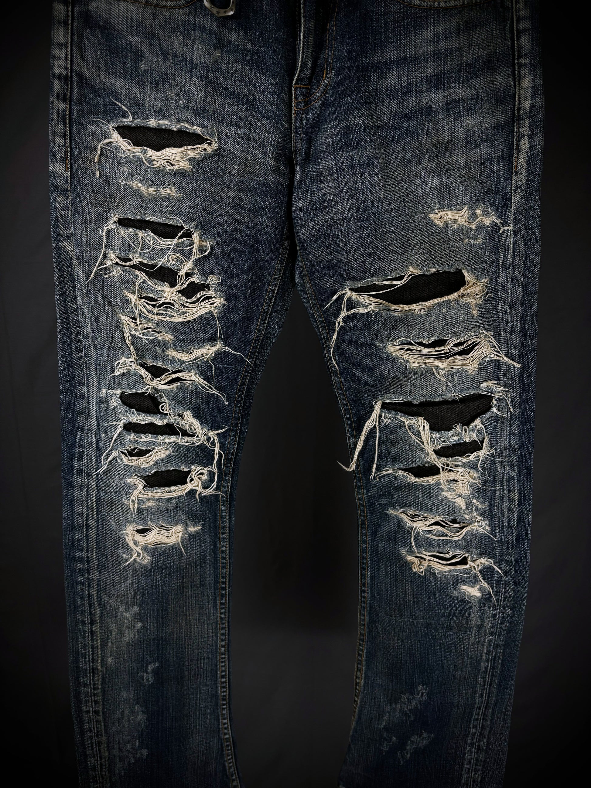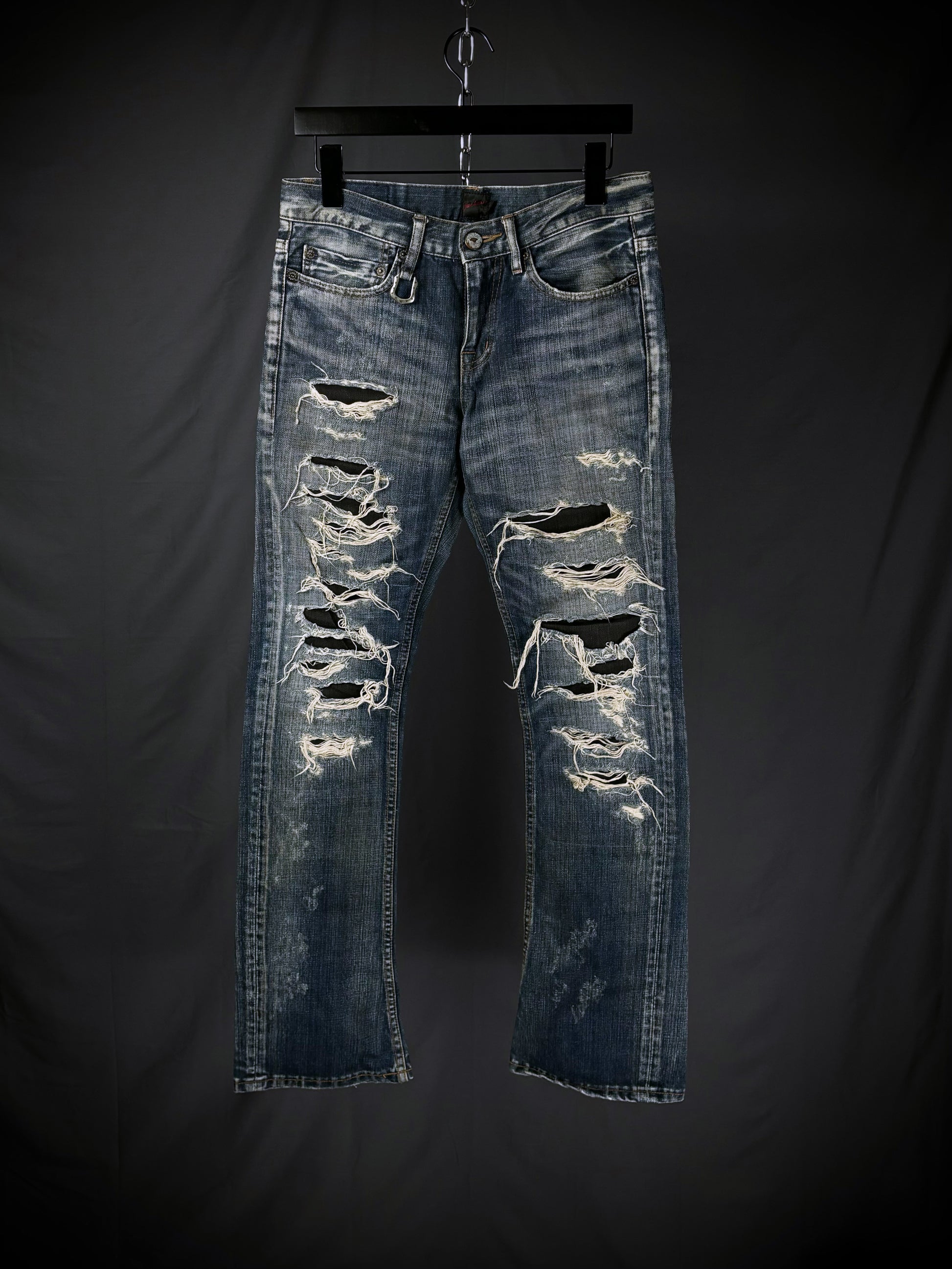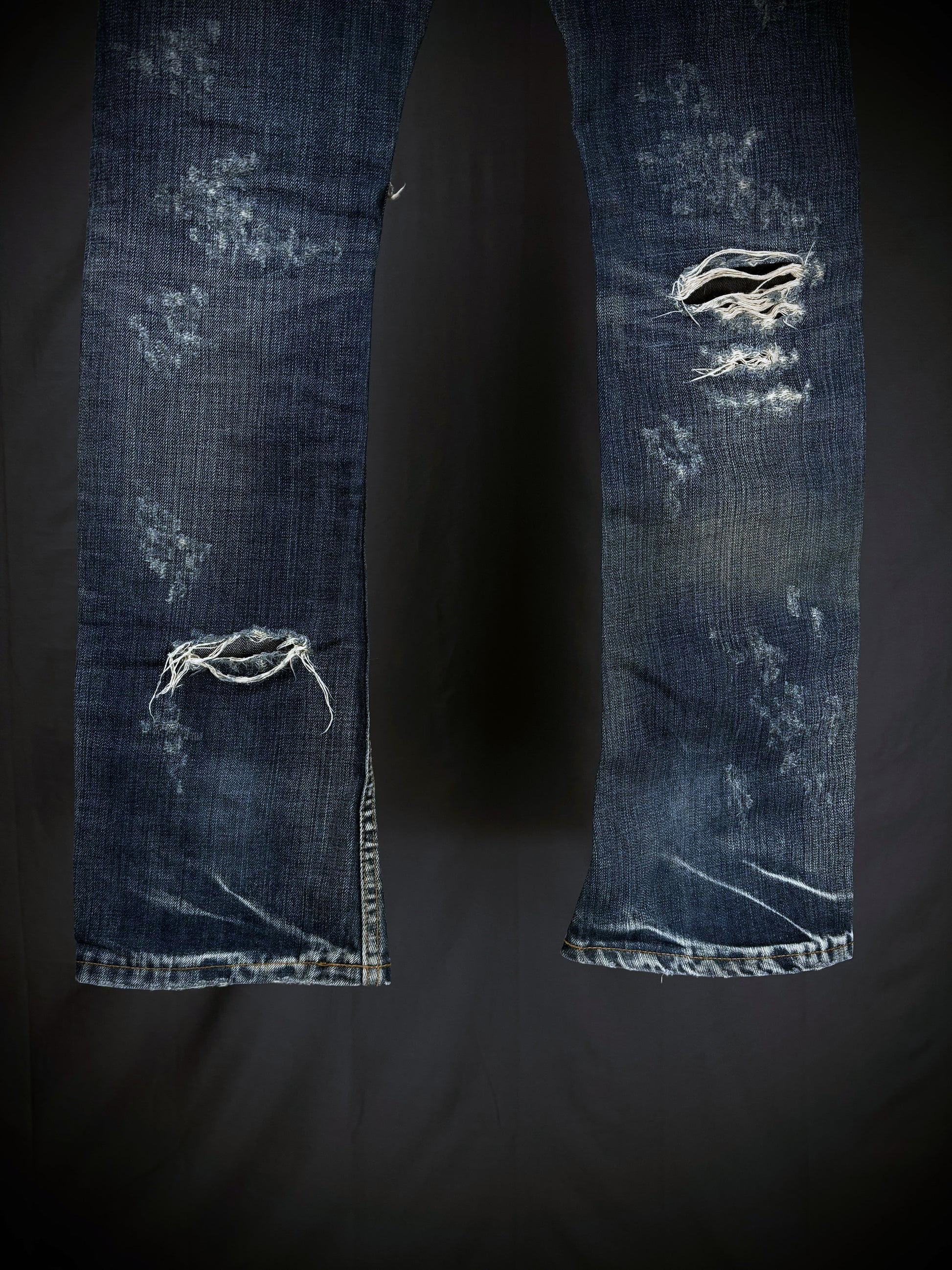 This pair of bootcut denim by the Japanese brand Jackrose features an elegant faded wash with heavy "crash" repaired distressing and shredded detailing throughout. The design is elevated by its signature hardware, including a front-loop D-ring, ornate wing embroidery on the rear pockets, and the branded fur back patch.