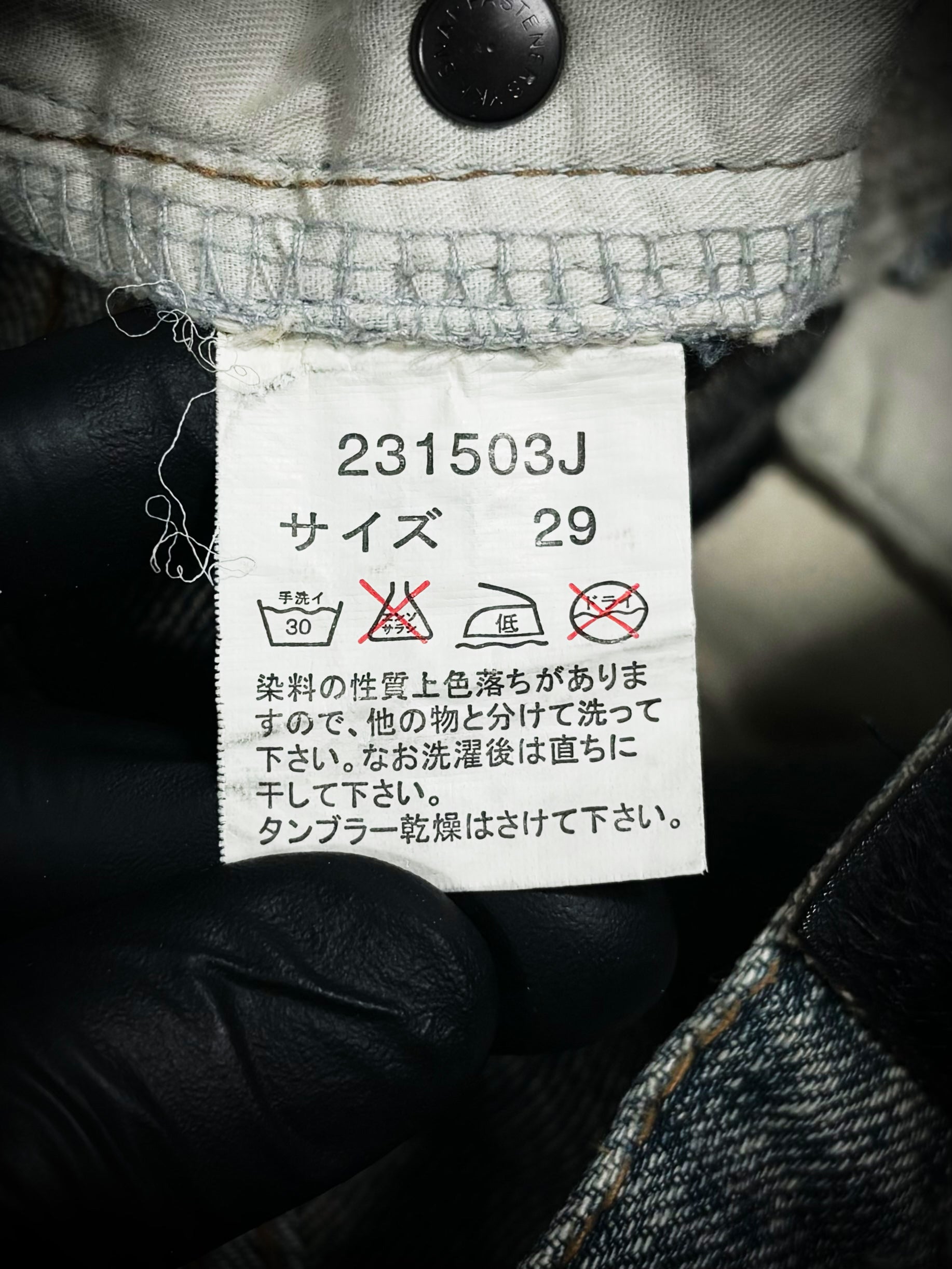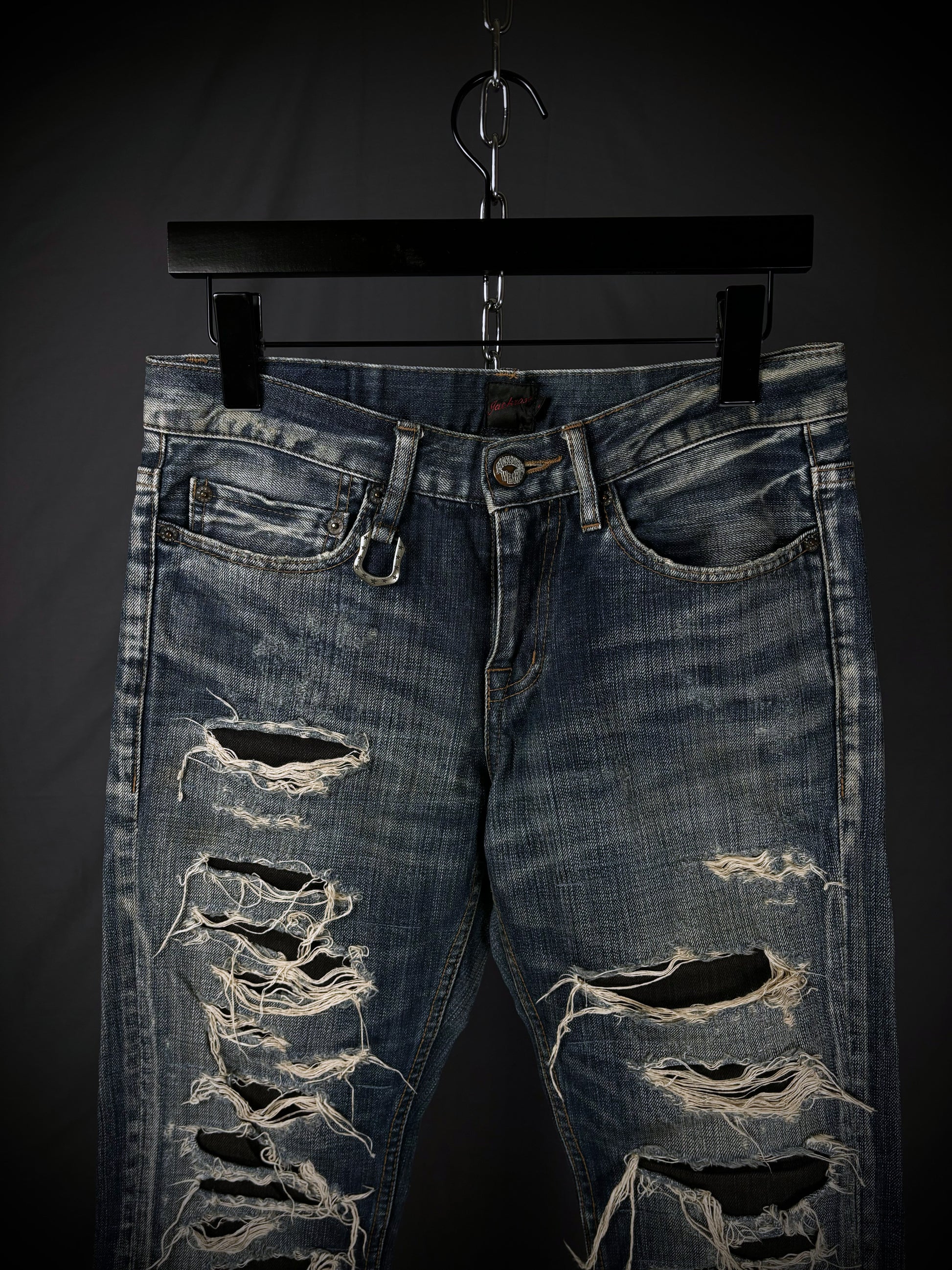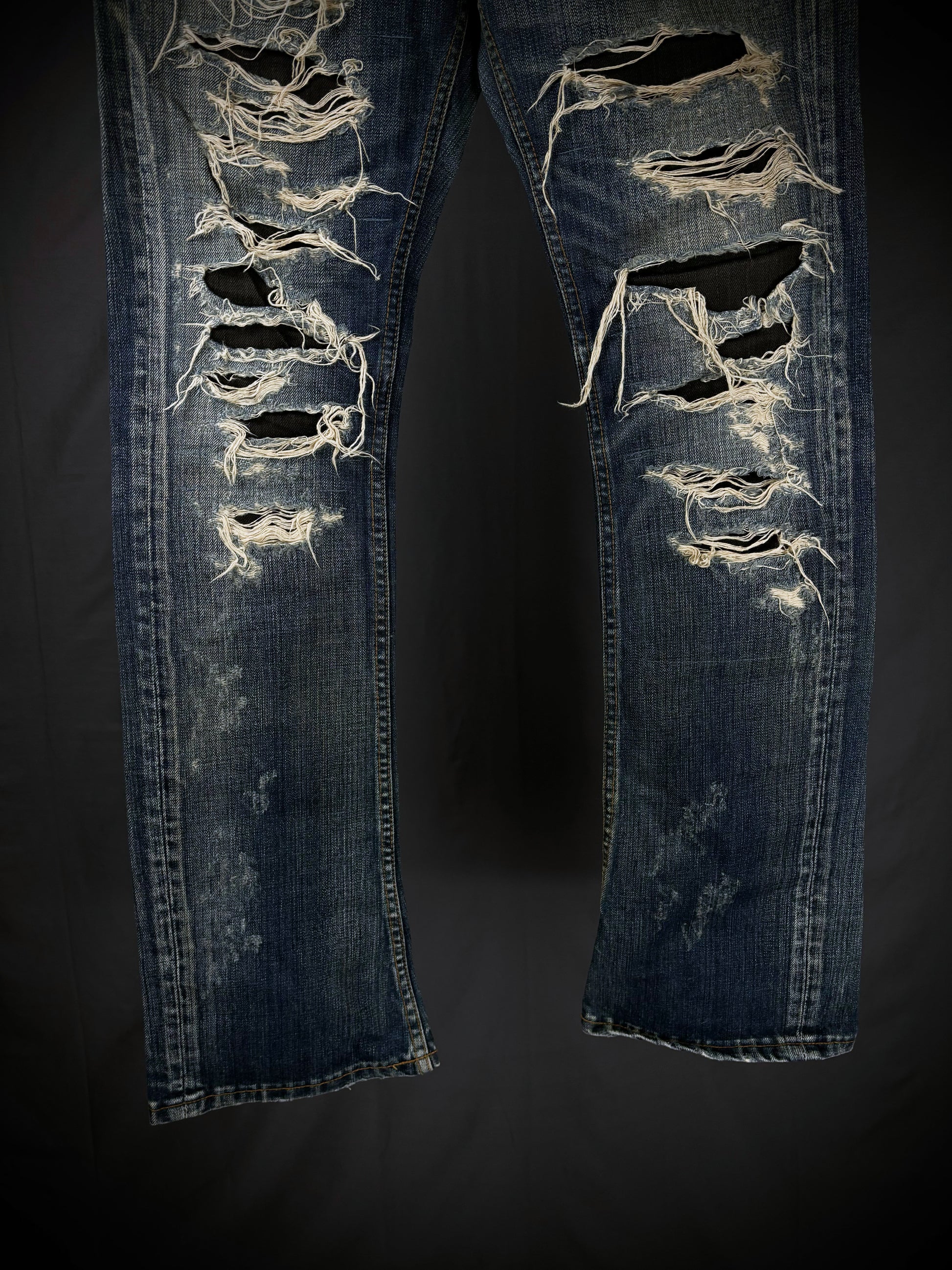 This pair of bootcut denim by the Japanese brand Jackrose features an elegant faded wash with heavy "crash" repaired distressing and shredded detailing throughout. The design is elevated by its signature hardware, including a front-loop D-ring, ornate wing embroidery on the rear pockets, and the branded fur back patch.
