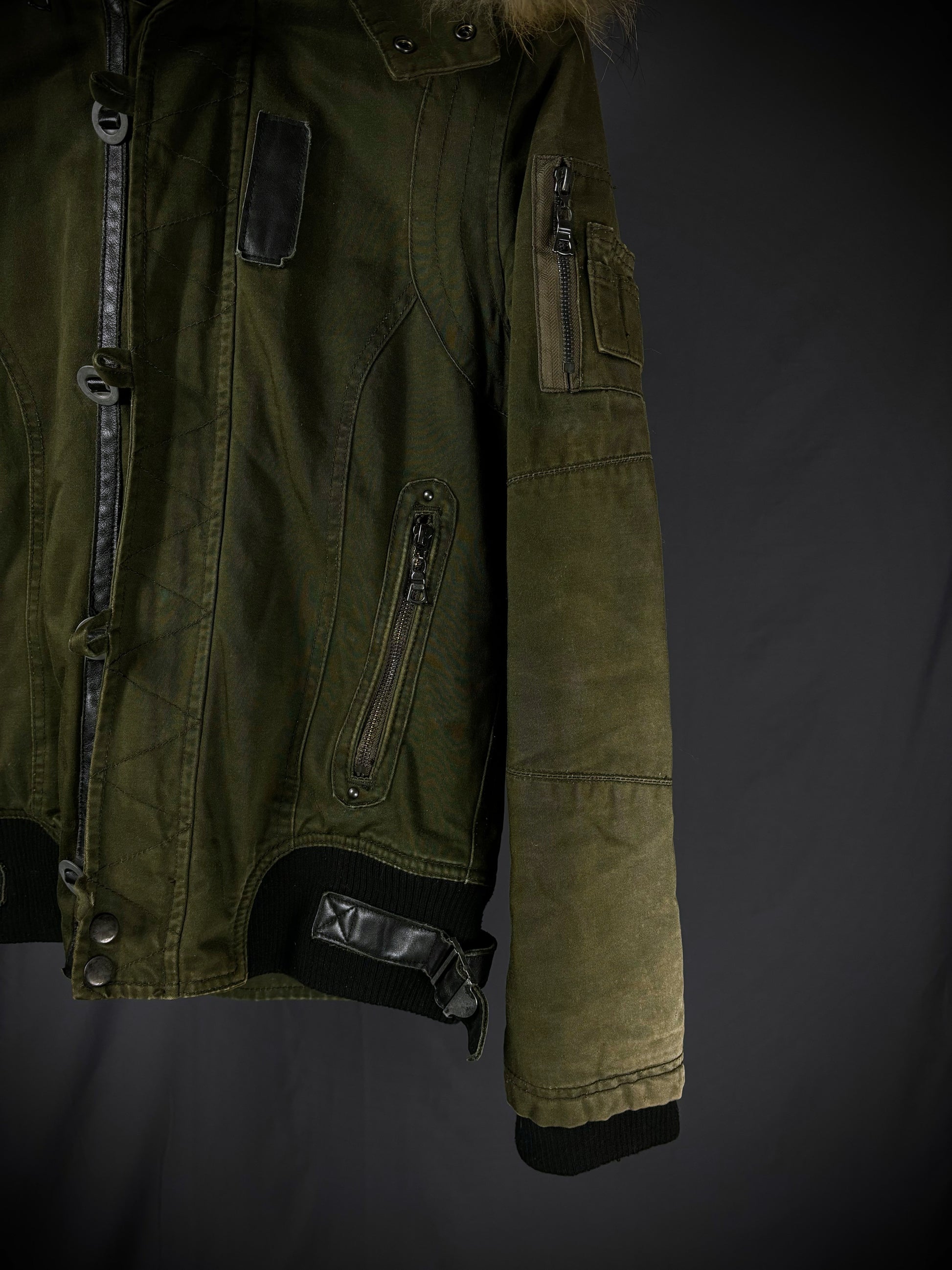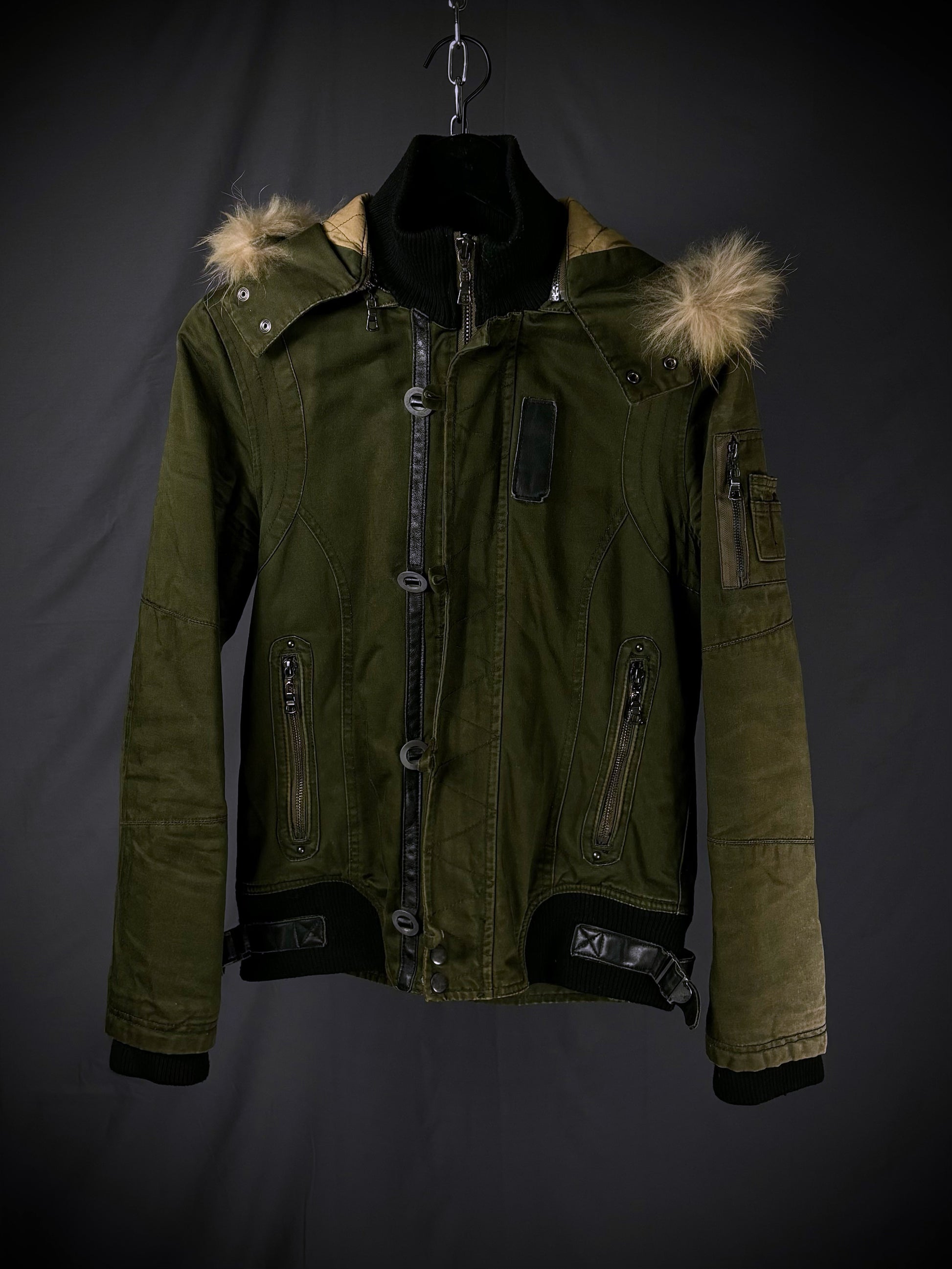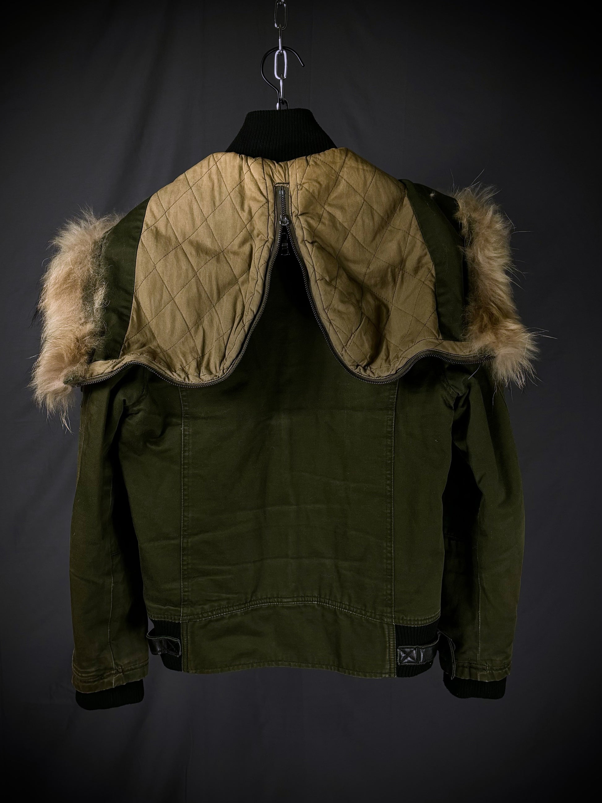 This military-inspired bomber by the Japanese brand Jackrose features a rugged olive/army green cotton shell and a signature raccoon fur-trimmed "exploder" hood. The modular hood zips open to reveal a tan diamond-quilted lining and a heavy ribbed funnel collar for a bold, layered look. Detailed with leather-trimmed toggle closures, utility pockets, and adjustable side-cinch buckles, it is finished with a lightweight polyester fill and a full quilted cotton interior for a sharp, tactical fit.