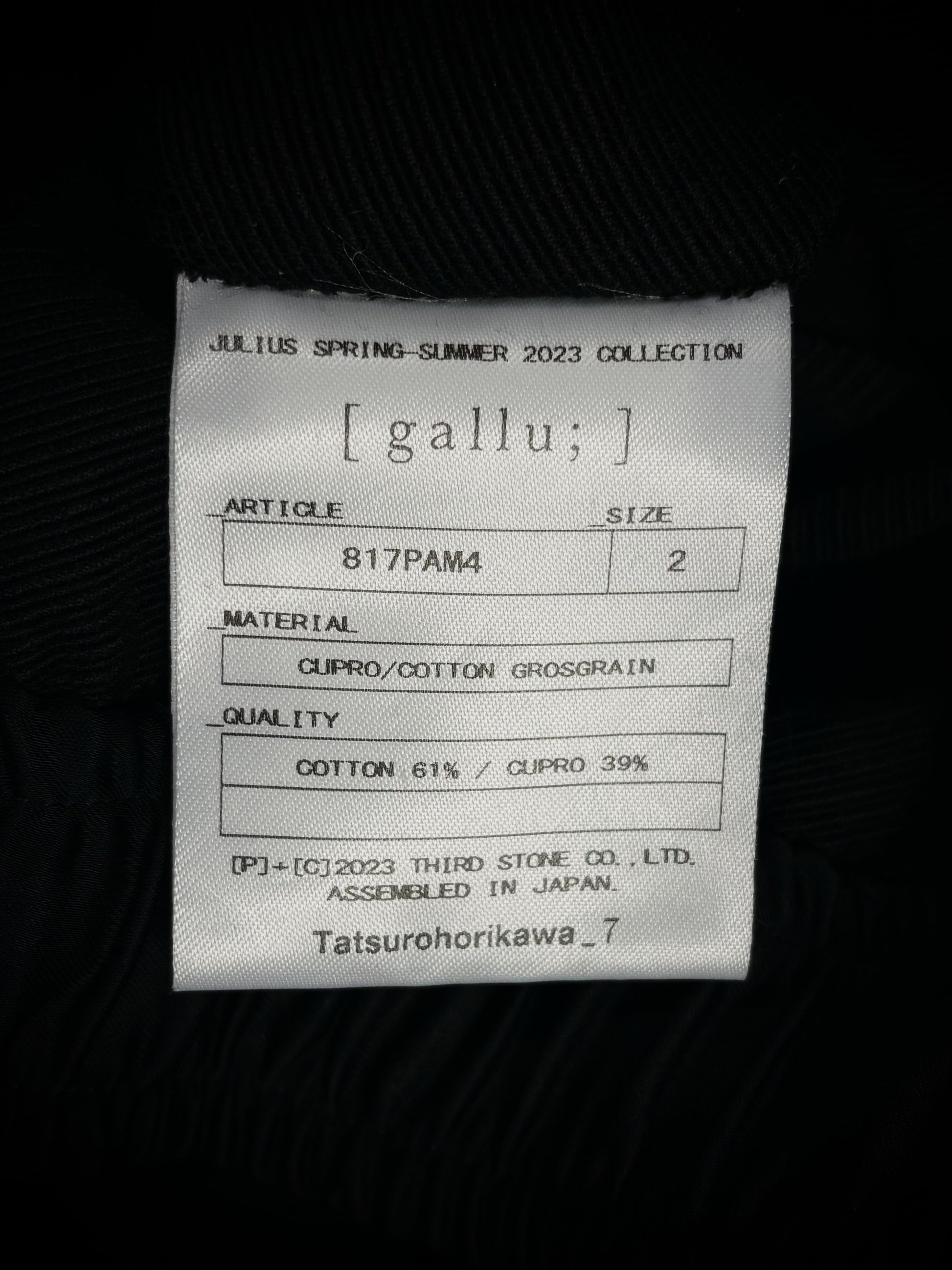 These shorts from Julius_7, released as part of the brand’s Spring/Summer 2023 “Gallu;” collection, feature a pronounced drop-crotch sarouel silhouette. The main body is constructed from a woven cotton/cupro fabric, while the crotch and waistband are reinforced with contrasting tri-blend paneling. Design details include geometric seam construction throughout, a zip-up fly, elasticated waistband, and elongated drawstrings.