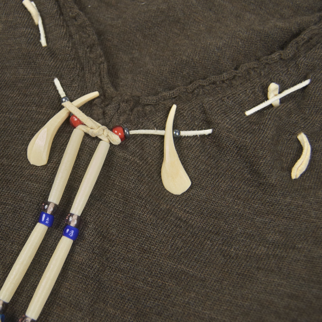 This 100% wool knit sweater from Junya Watanabe MAN’s Autumn/Winter 2003 collection features unorthodox seams with raw hem detailing and a unique necklace-like design consisting of faux bone and feathers outlining the garment's neckline. This motif can be found throughout the collection on denim, pants, various tops, and as its own standalone accessory.