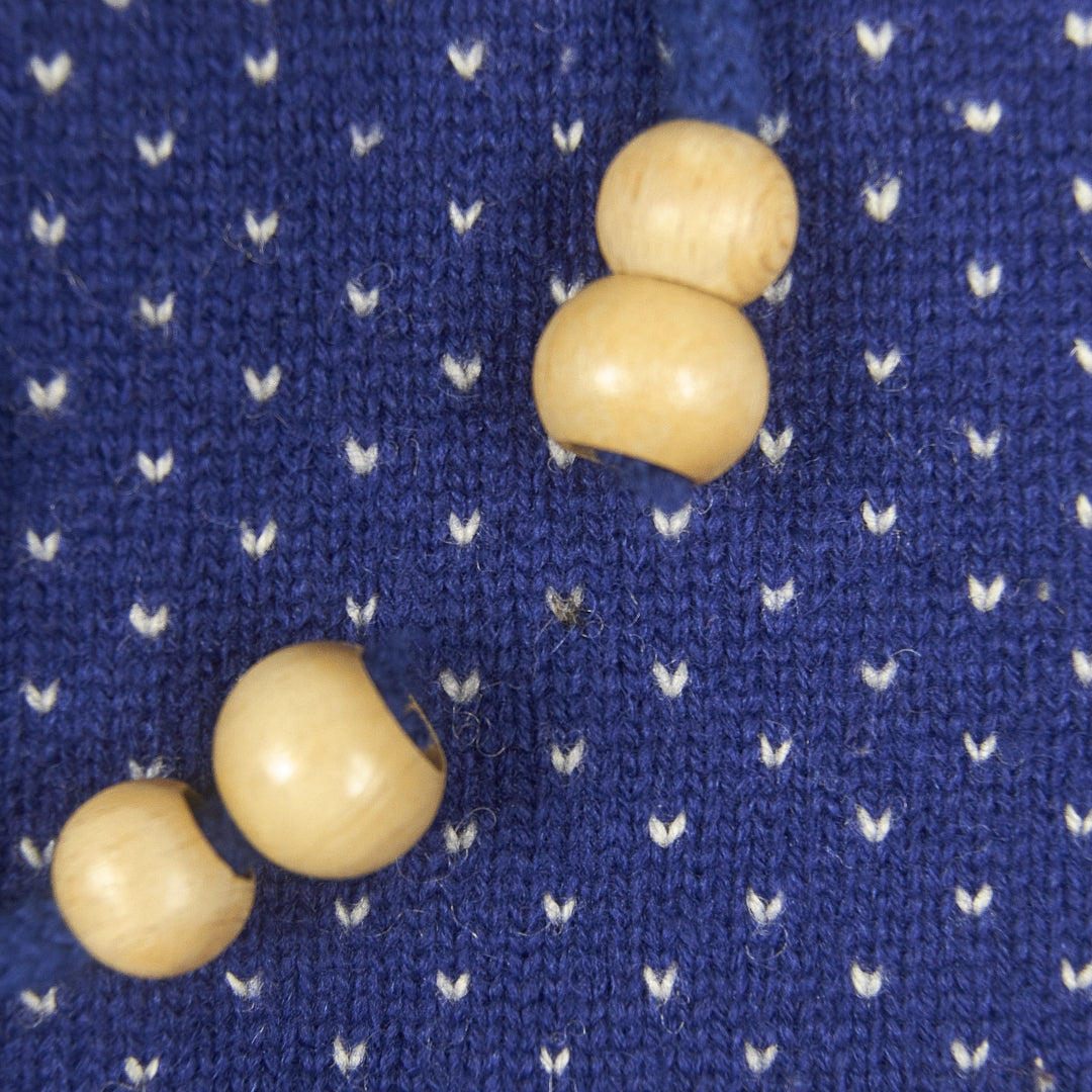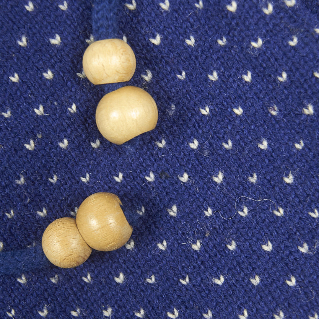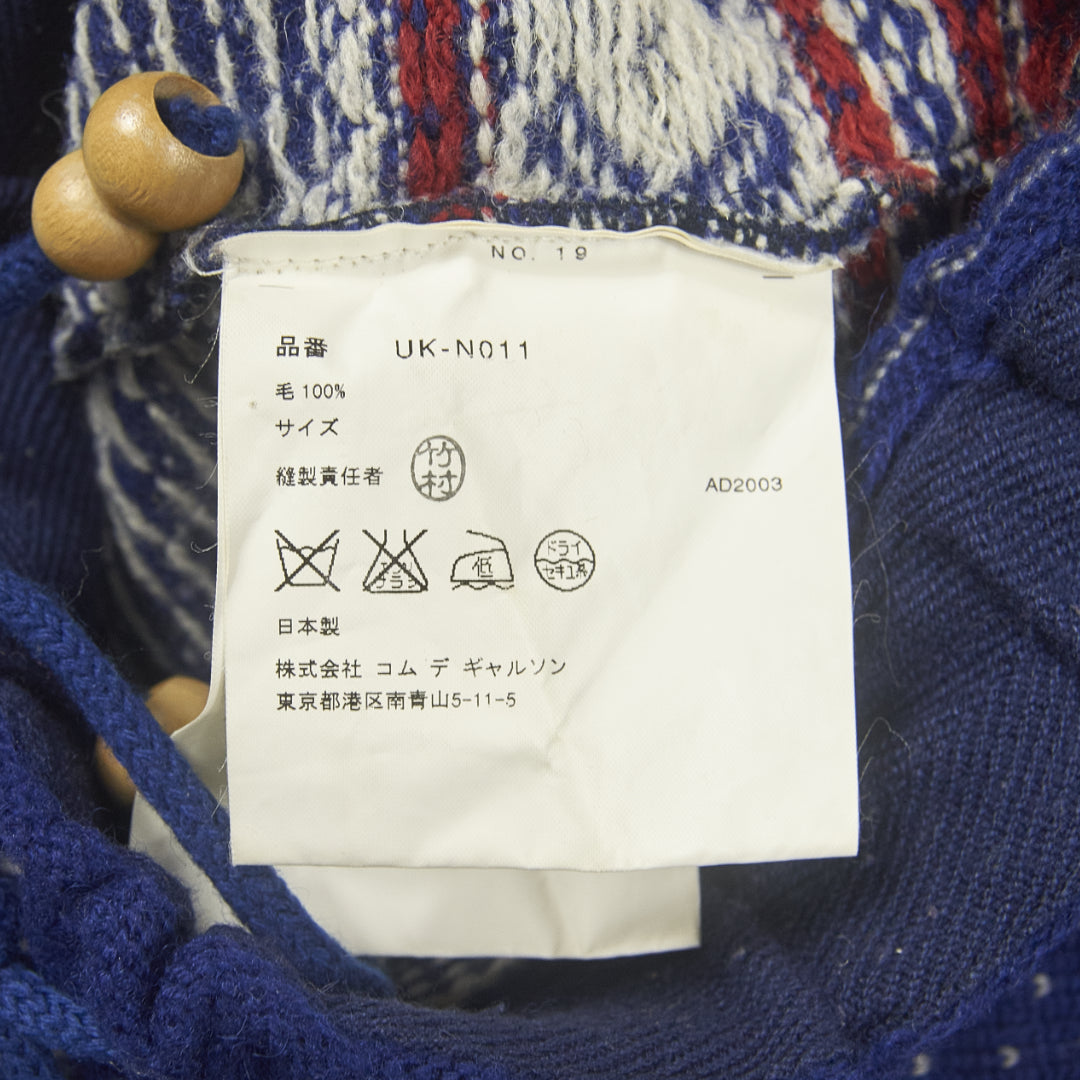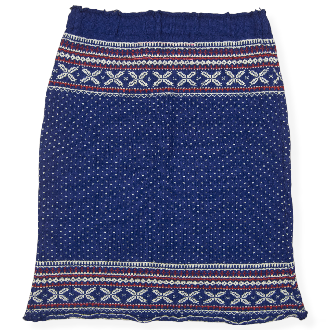 This mid-length skirt from Junya Watanabe MAN’s Autumn/Winter 2003 collection consists entirely of high-quality knitted wool, made in Japan, and features an eye-catching nordic pattern complemented by ornamentation, polka dots, and adjustable beaded drawstrings.
