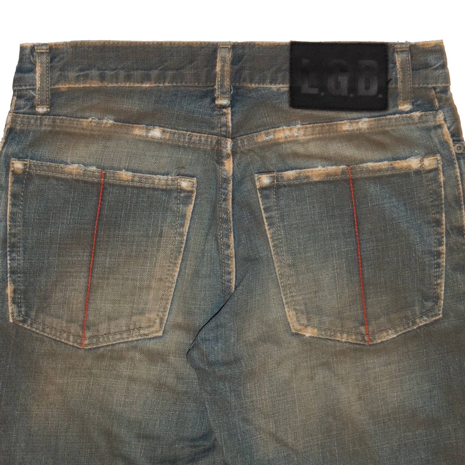 Here we have an eye-catching pair of five-pocket denim from the Japanese brand L.G.B. This piece features an array of unique details such as a processed ‘Mudwash’ which gives the denim a worn look while also creating a sick marbling effect near the front pockets. The garment has also been hand-distressed in various places, most prominently on the right knee and back hem which emphasizes heel drag. This pair of flared denim by L.G.B. is constructed with 100% Japanese cotton of the highest quality making its timeless design last a lifetime.