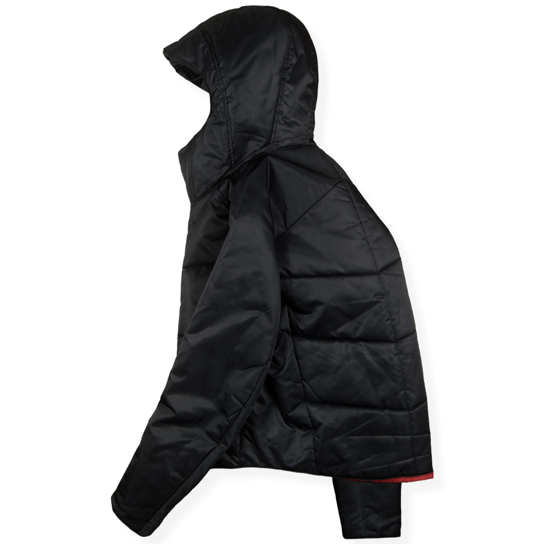 This jacket from Lad Musician’s Autumn/Winter 2010 ‘The Un-Dead’ collection features multi-paneled detailing, two interior & exterior pockets, a unique asymmetrical YKK zip design, and boasts a black finish with a vibrant red interior lining. This moderately down-filled jacket constructed entirely out of high-quality 100% polyester, made in Japan, is the perfect piece to add to any jacket collection thanks to its eye-catching design and superb quality.