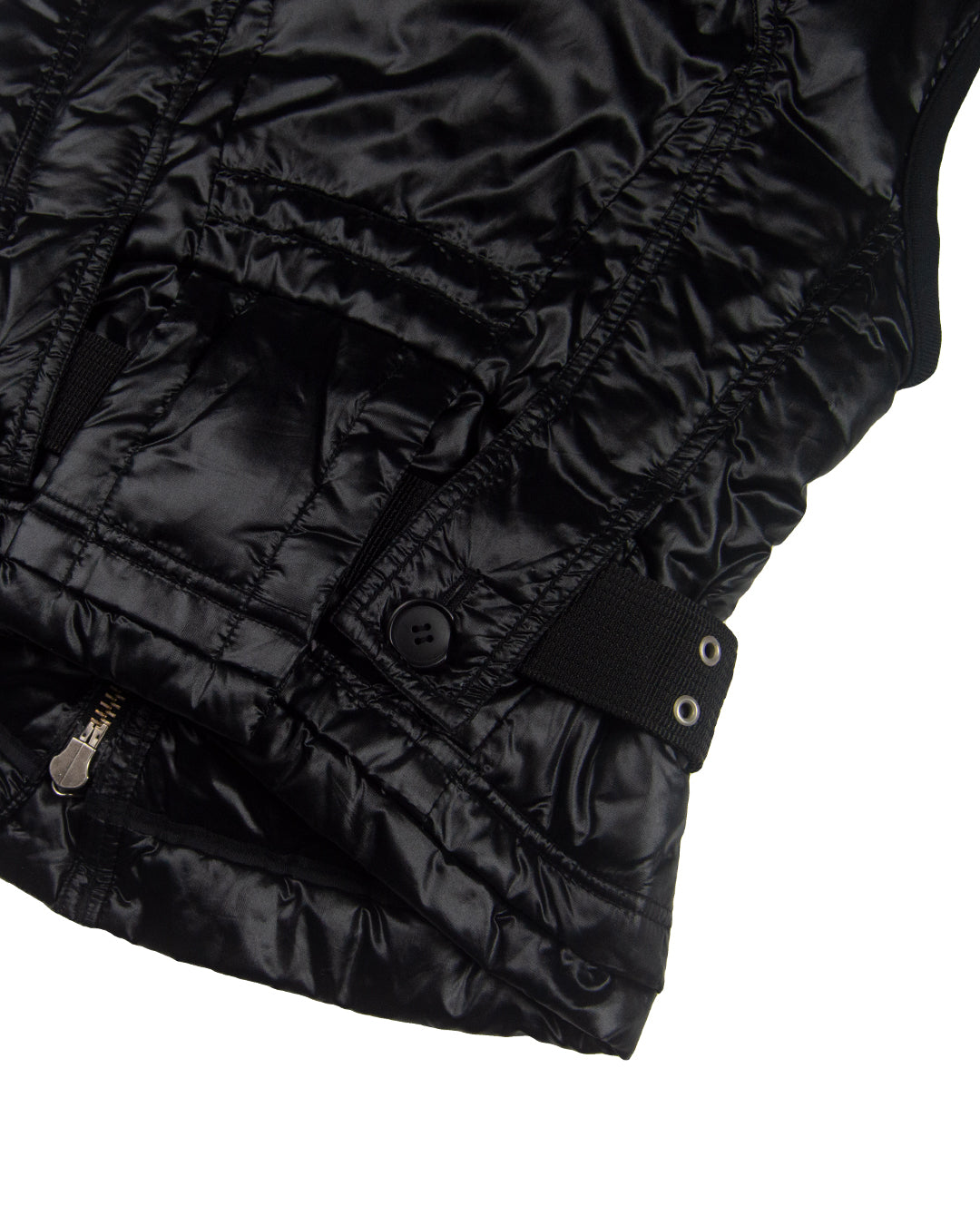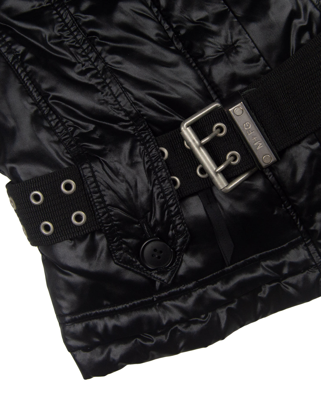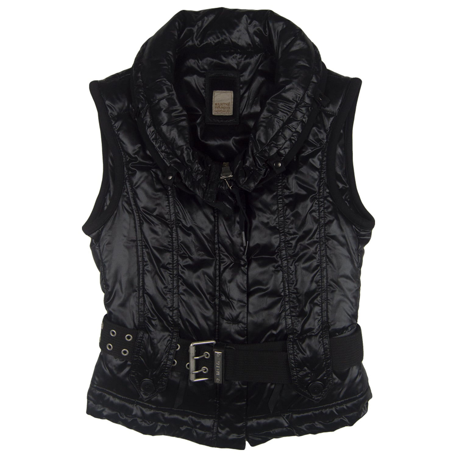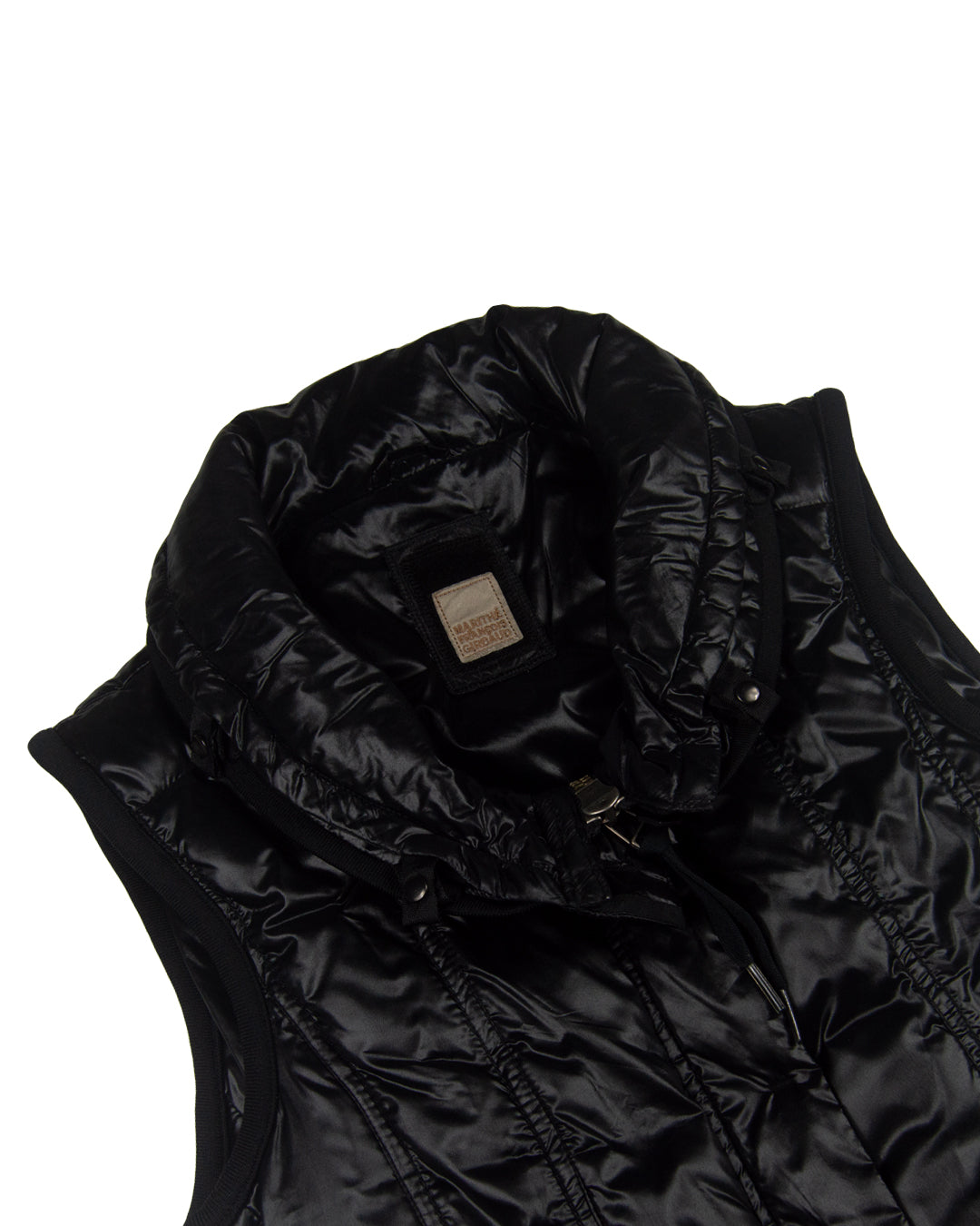 Here we have an eye-catching vest from MARITHÉ + FRANÇOIS GIRBAUD. This piece presumably from the early 2000s (based on the tag) features many striking elements such as the removable M+FG nylon belt, symmetrical paneling, and oversized collar which houses a hidden hood that is secured by a zip closure and multiple button clasps. The garment also features two zip pockets tucked underneath the belt for added functionality. Consisting of a lightly stuffed polyester, shelled by a shimmering 100% nylon exterior, this piece from MARITHÉ + FRANÇOIS GIRBAUD is a statement piece guaranteed to stand the test of time!
