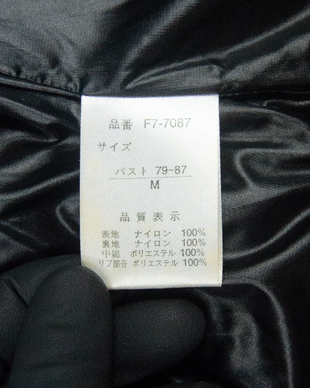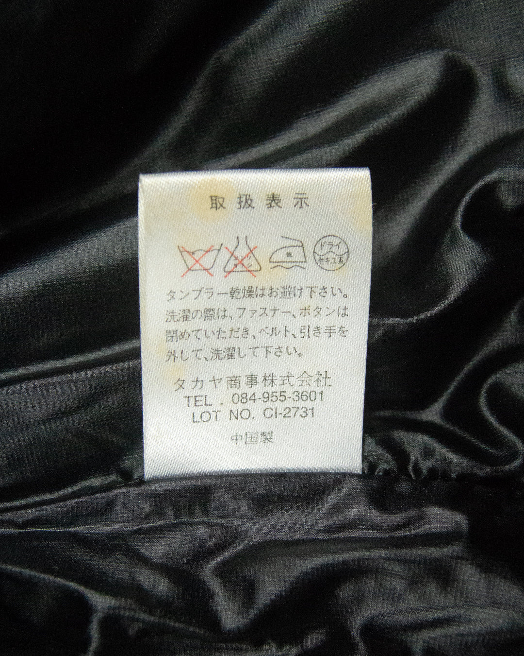 8/10 – Item is in good condition overall. Three very tiny holes in the outermost layer of the garment on the right side that are covered by the belt, no major flaws.