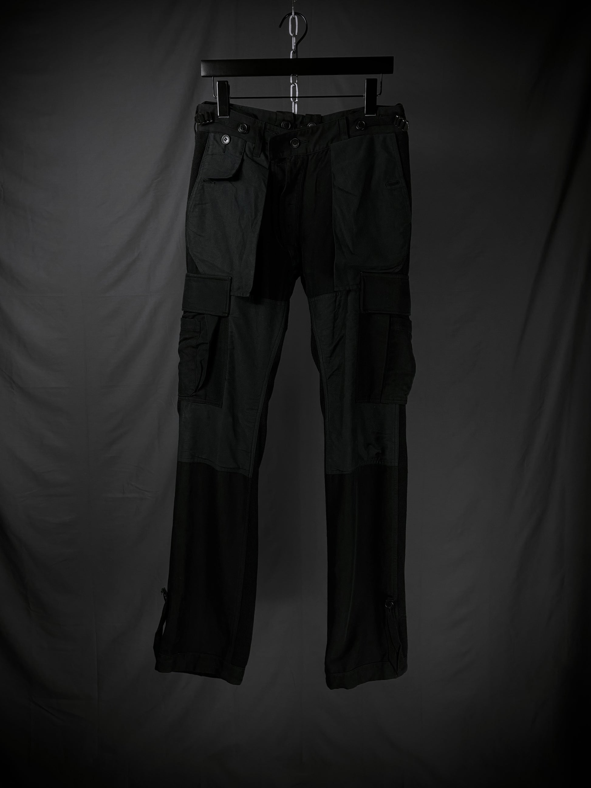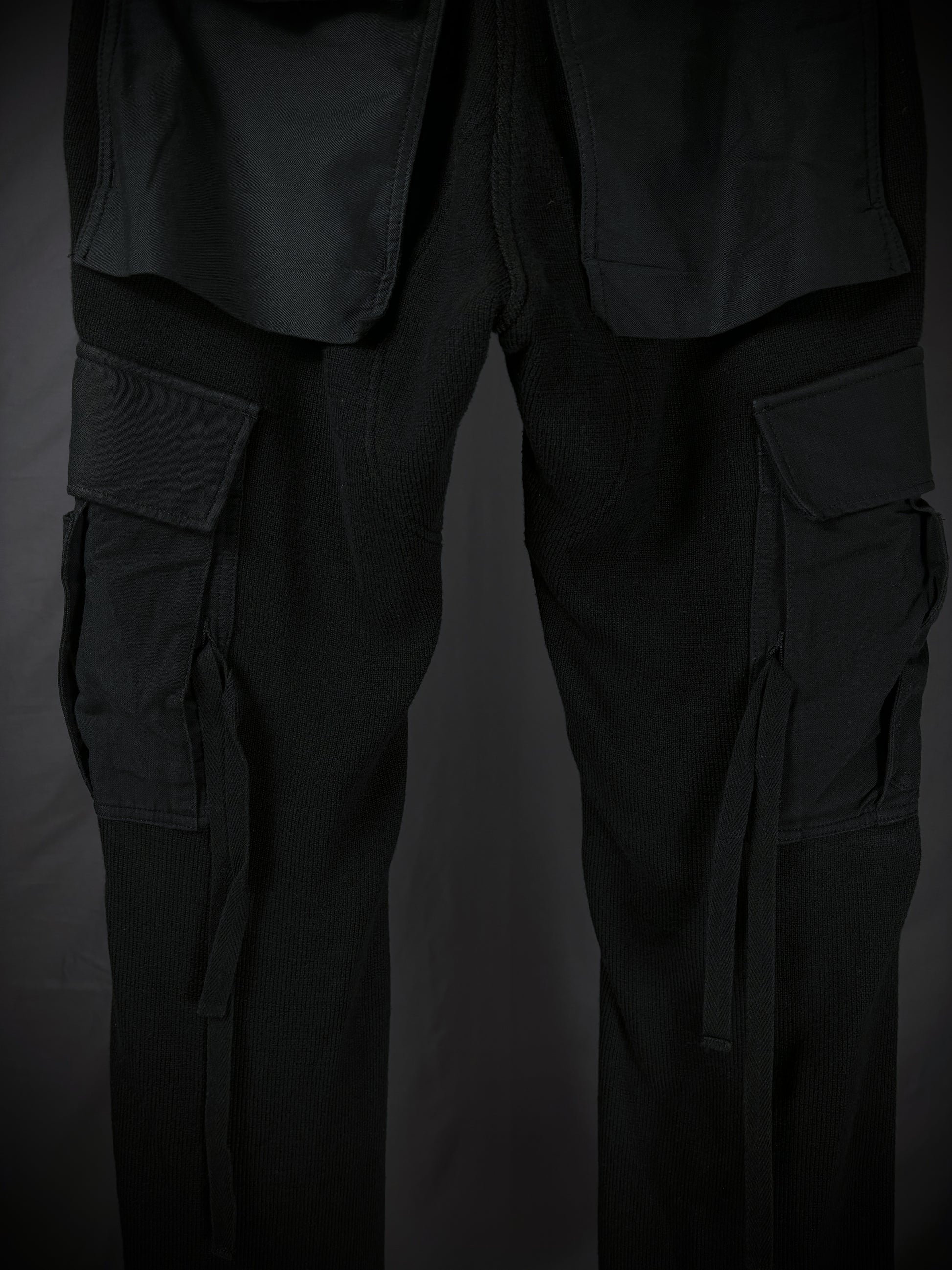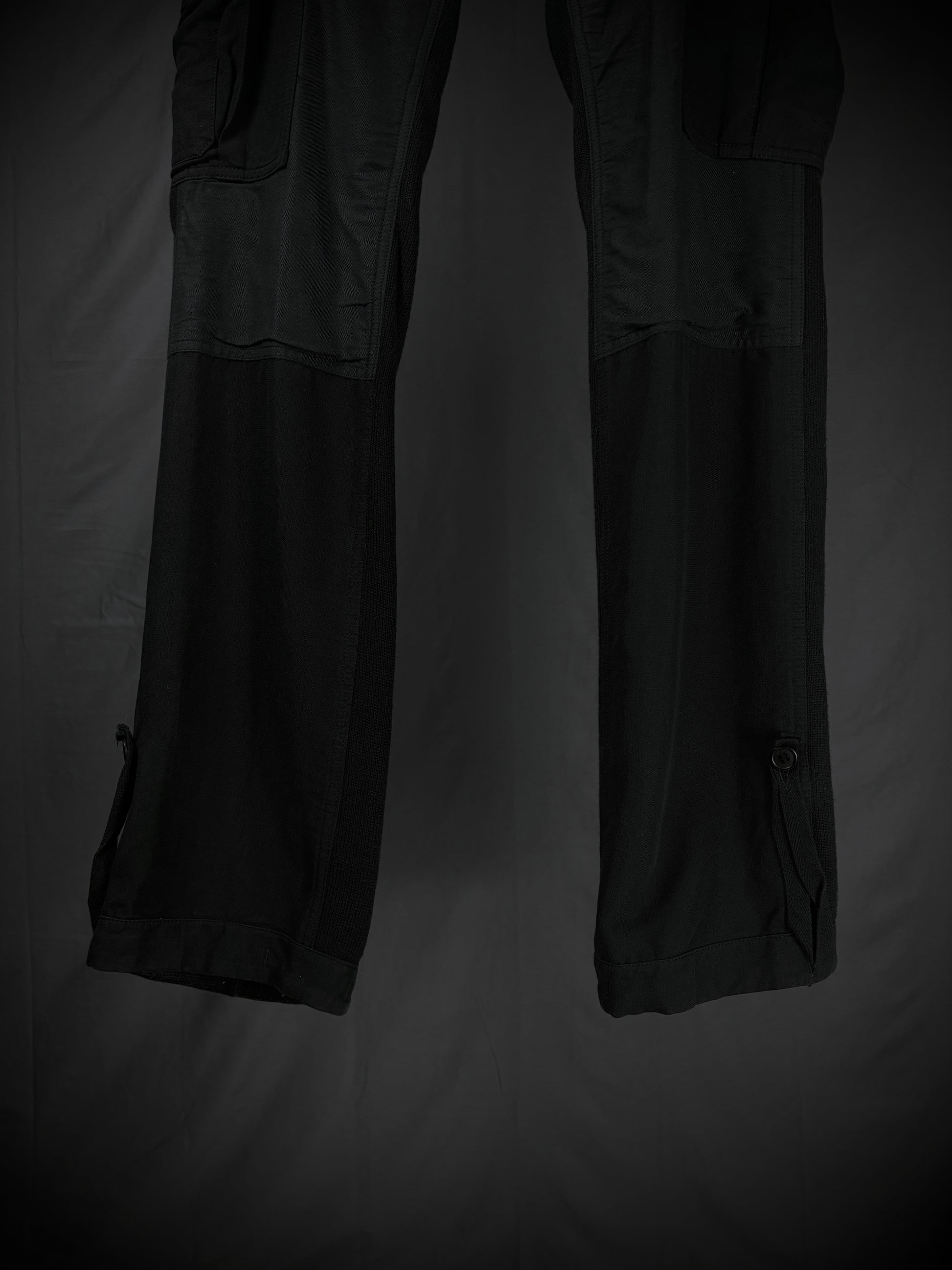 These Miharayasuhiro hybrid cargo pants from the early 2000s masterfully fuse tactical utility with an avant-garde twist. Constructed on a base of high-quality black ribbed wool-blend knit, the design features a striking contrast of structured grey panels in 100% cotton and cotton-rayon. The silhouette is defined by an array of 3D external pockets, including cargo pockets with draped straps. Finished with adjustable metal cinch buckles, these pants transform traditional utility gear into a high-texture, sculptural statement piece.