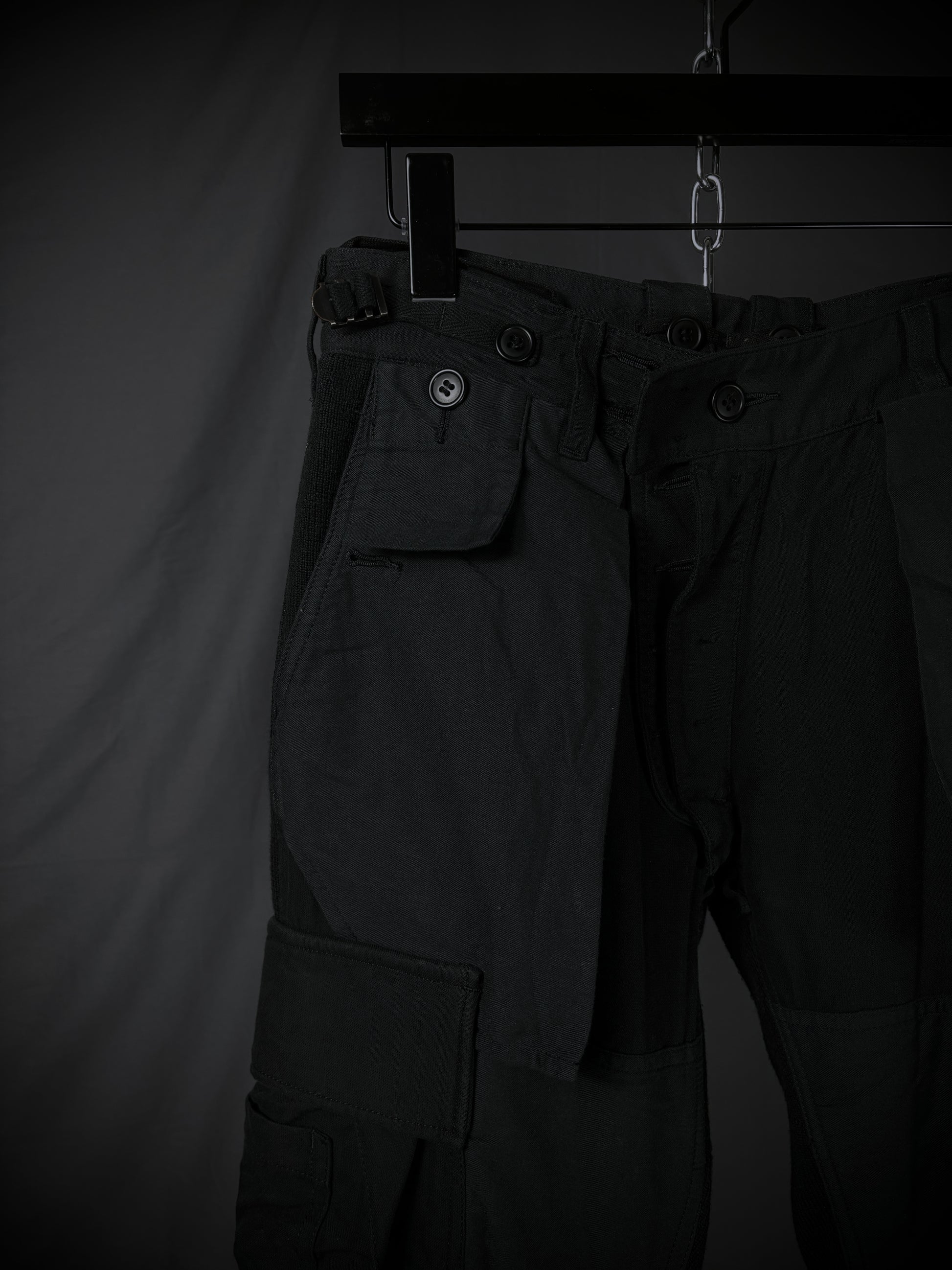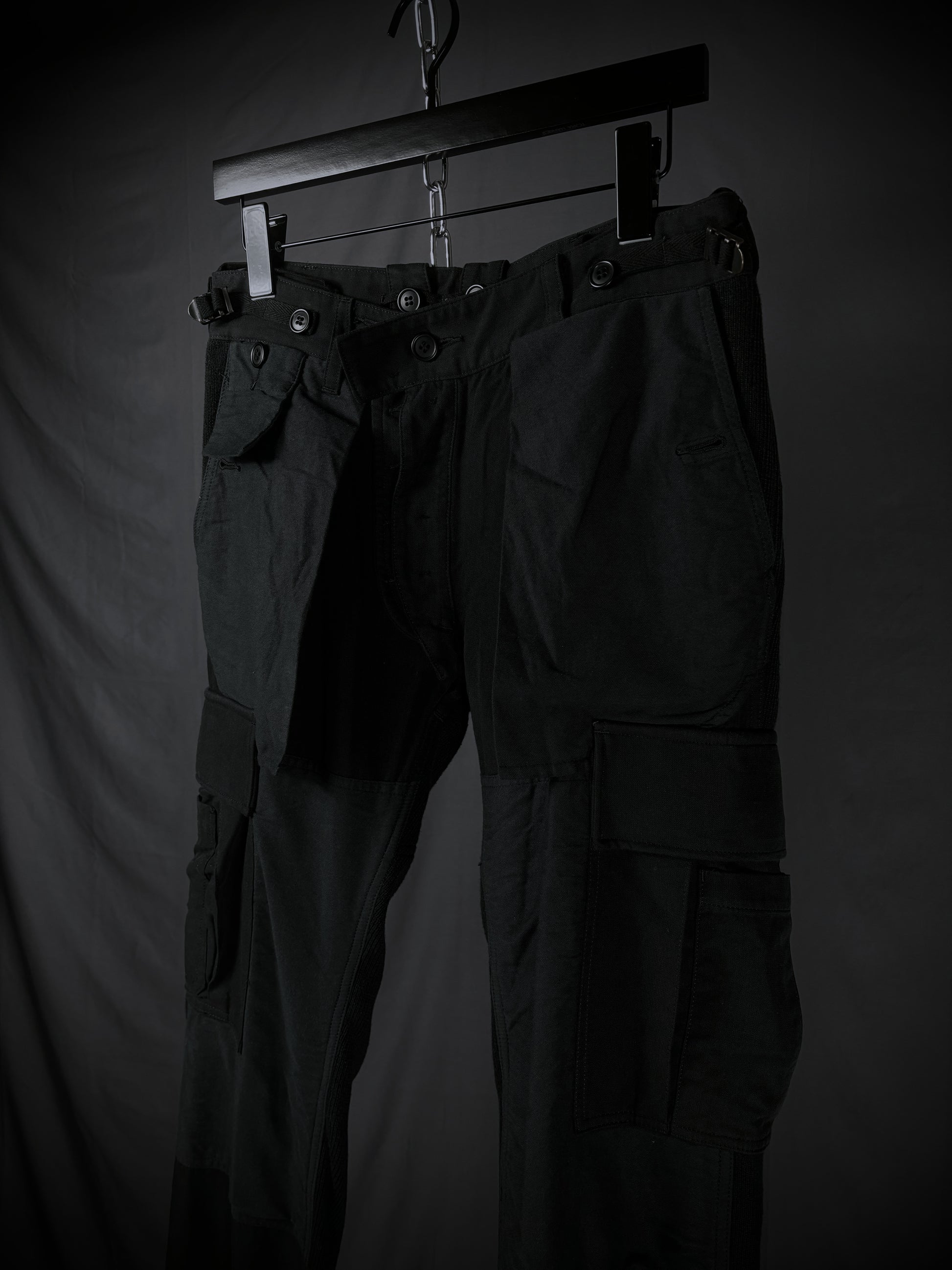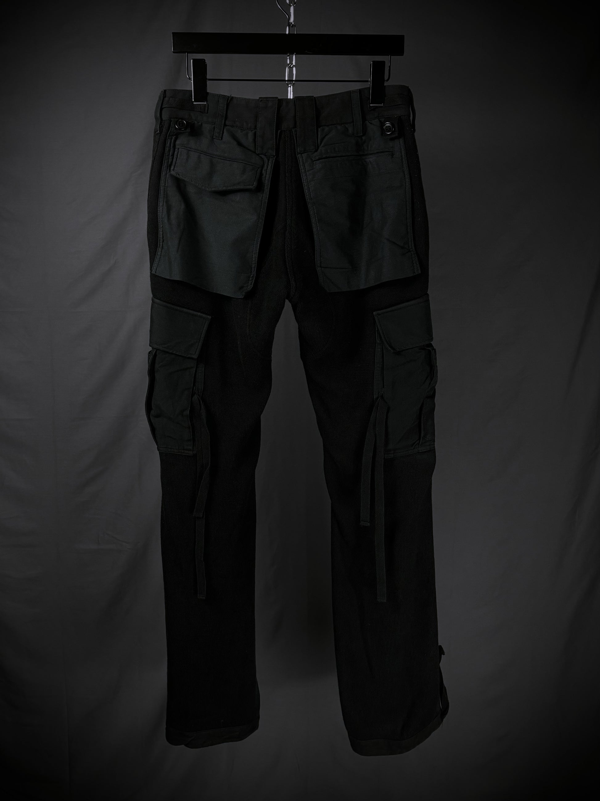 These Miharayasuhiro hybrid cargo pants from the early 2000s masterfully fuse tactical utility with an avant-garde twist. Constructed on a base of high-quality black ribbed wool-blend knit, the design features a striking contrast of structured grey panels in 100% cotton and cotton-rayon. The silhouette is defined by an array of 3D external pockets, including cargo pockets with draped straps. Finished with adjustable metal cinch buckles, these pants transform traditional utility gear into a high-texture, sculptural statement piece.
