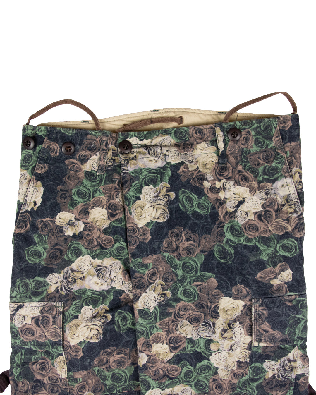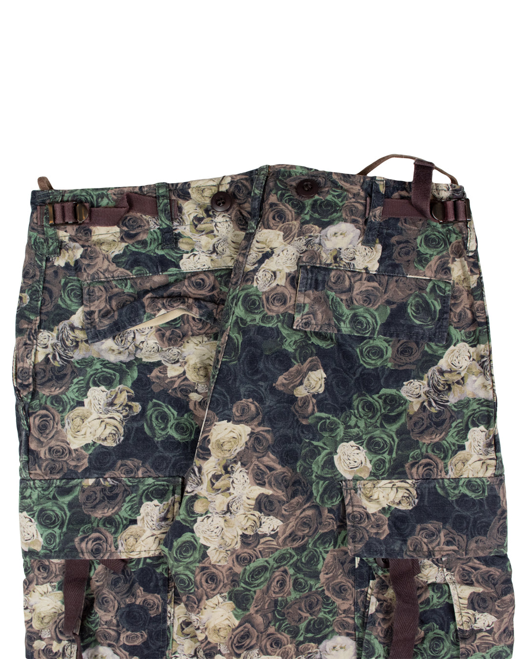 Here we have one of Miharayasuhiro’s highly sought-after parachute bondage cargo pants. This piece from Miharayasuhiro’s Spring/Summer 2011 collection features various eye-catching militaristic elements such as its parachute trouser design complimented by various cargo-style pockets, adjustable waist, and hints of bondage which can alter the fit of the garment. What makes this piece so special is its floral rose camo print that incorporates an array of traditional militaristic colors which makes the garment unique and stand out!