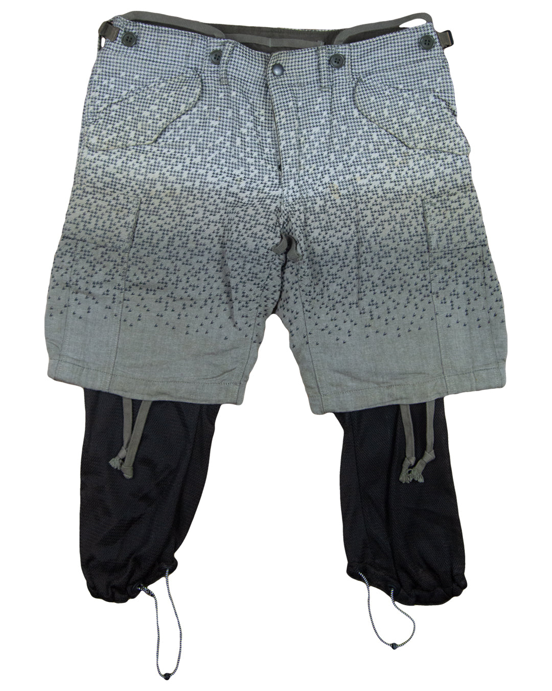 Here we have an eye-catching pair of shorts from Miharayasuhiro. This pair of six-pocket cargo shorts feature a mesmerizing Digi-like design woven into a gray garment that has gradient characteristics starting with a light gray at the top and gradually changing into a darker gray towards the leg openings. This piece also includes button clasp pockets, multiple instances of adjustable parachute-style drawstrings, and a unique removable mesh netting within the interior of theย garment.
