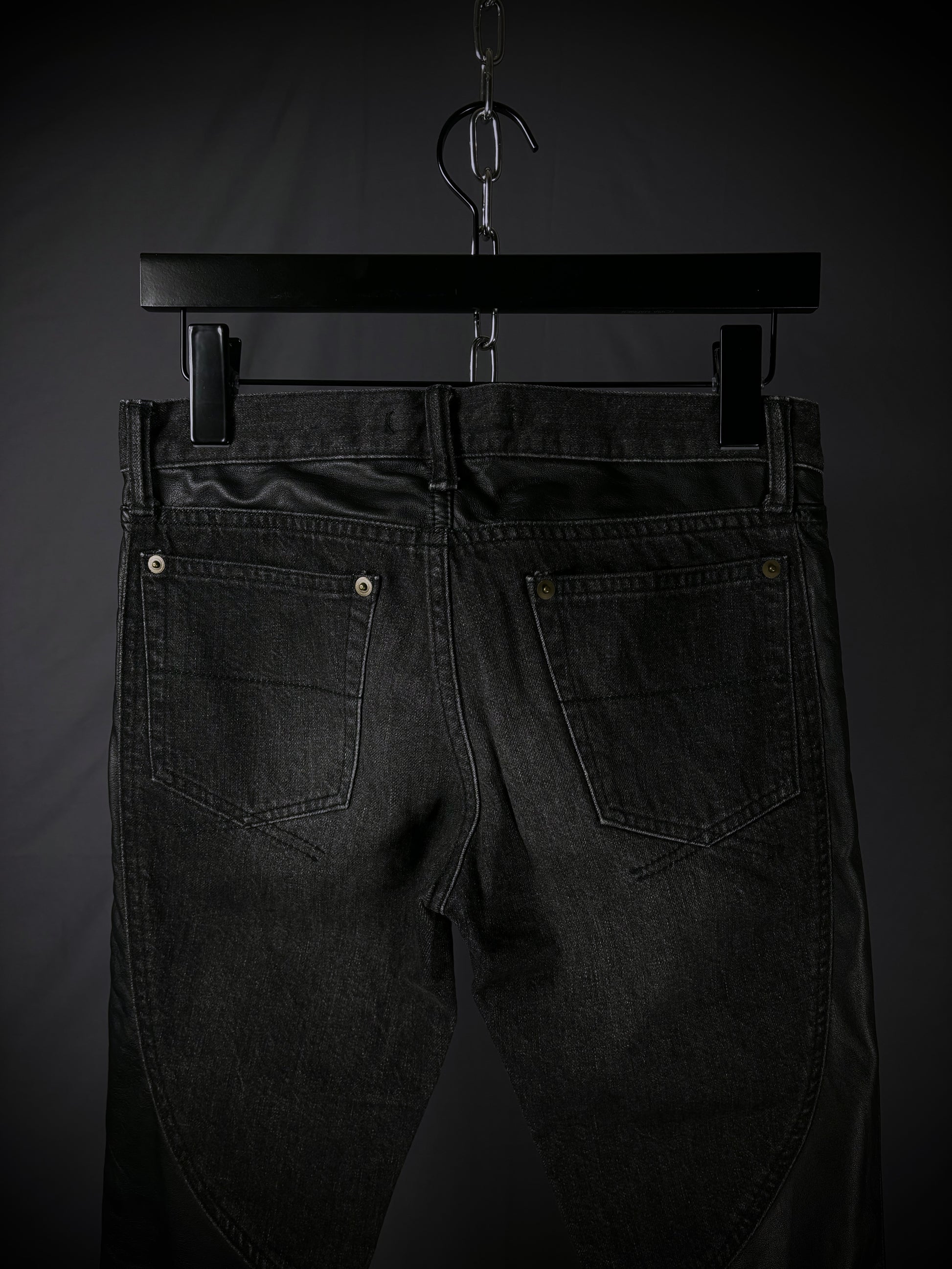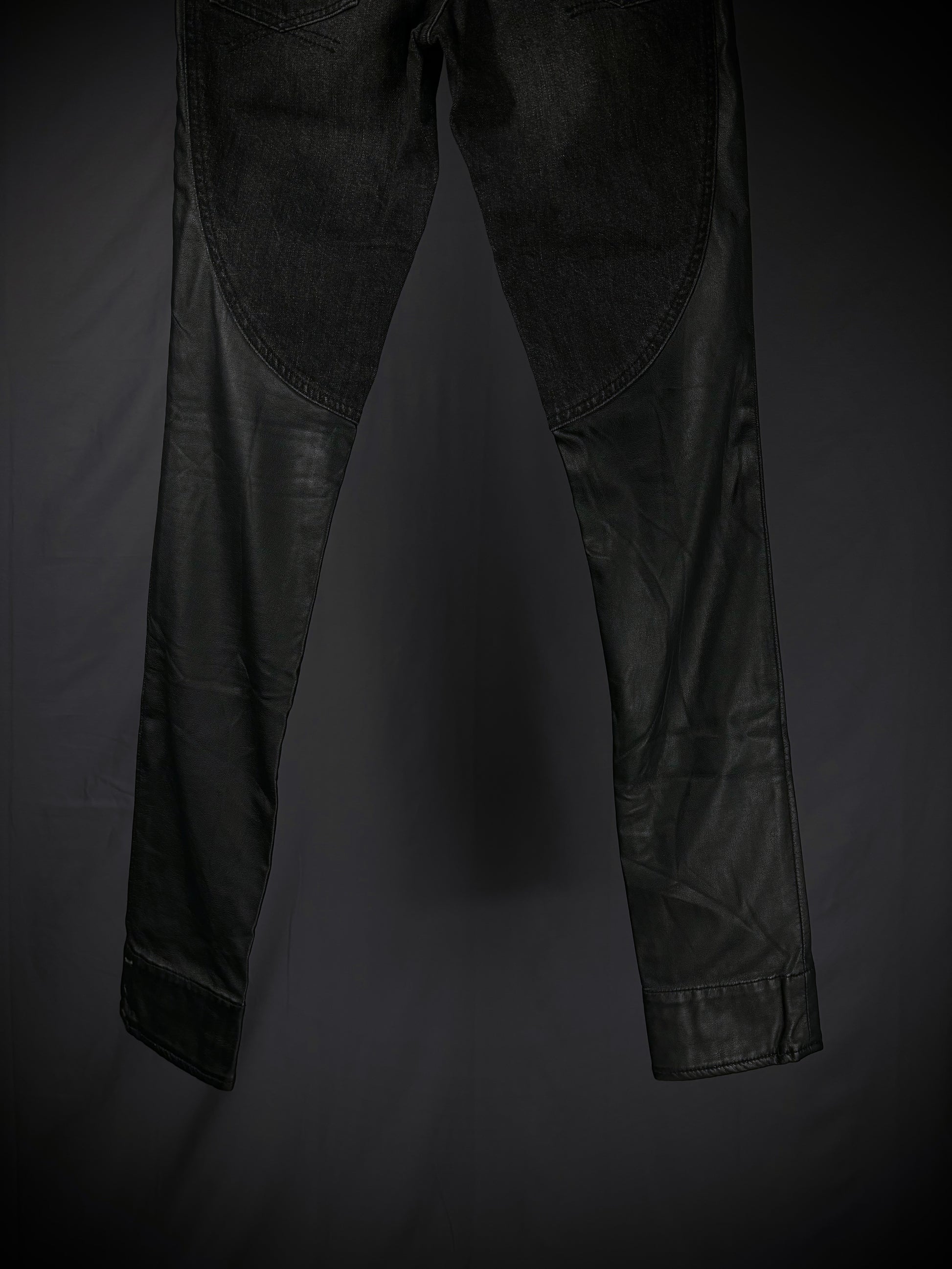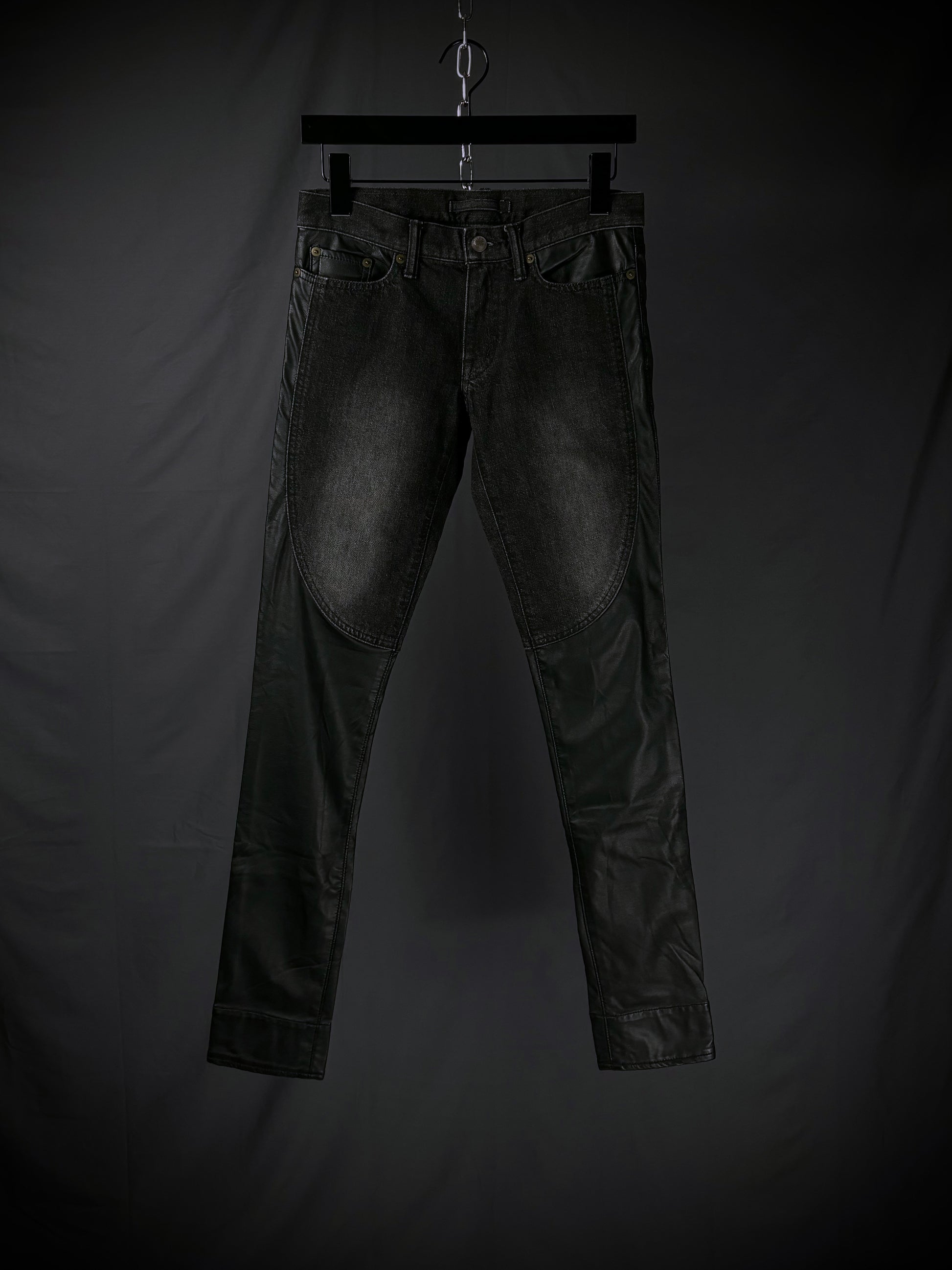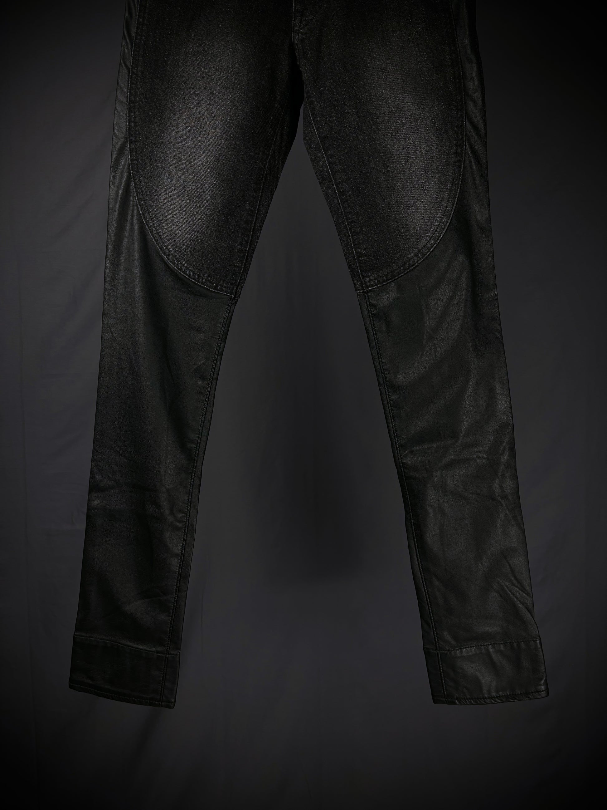 This pair of jeans from the Japanese brand Miharayasuhiro is crafted from a hybrid construction of 100% black cotton denim, faded to a dark grey tone, contrasted with faux leather paneling. The garment features a flattering skinny silhouette and is finished with a classic five-pocket design, button closure, and reinforced seam detailing.