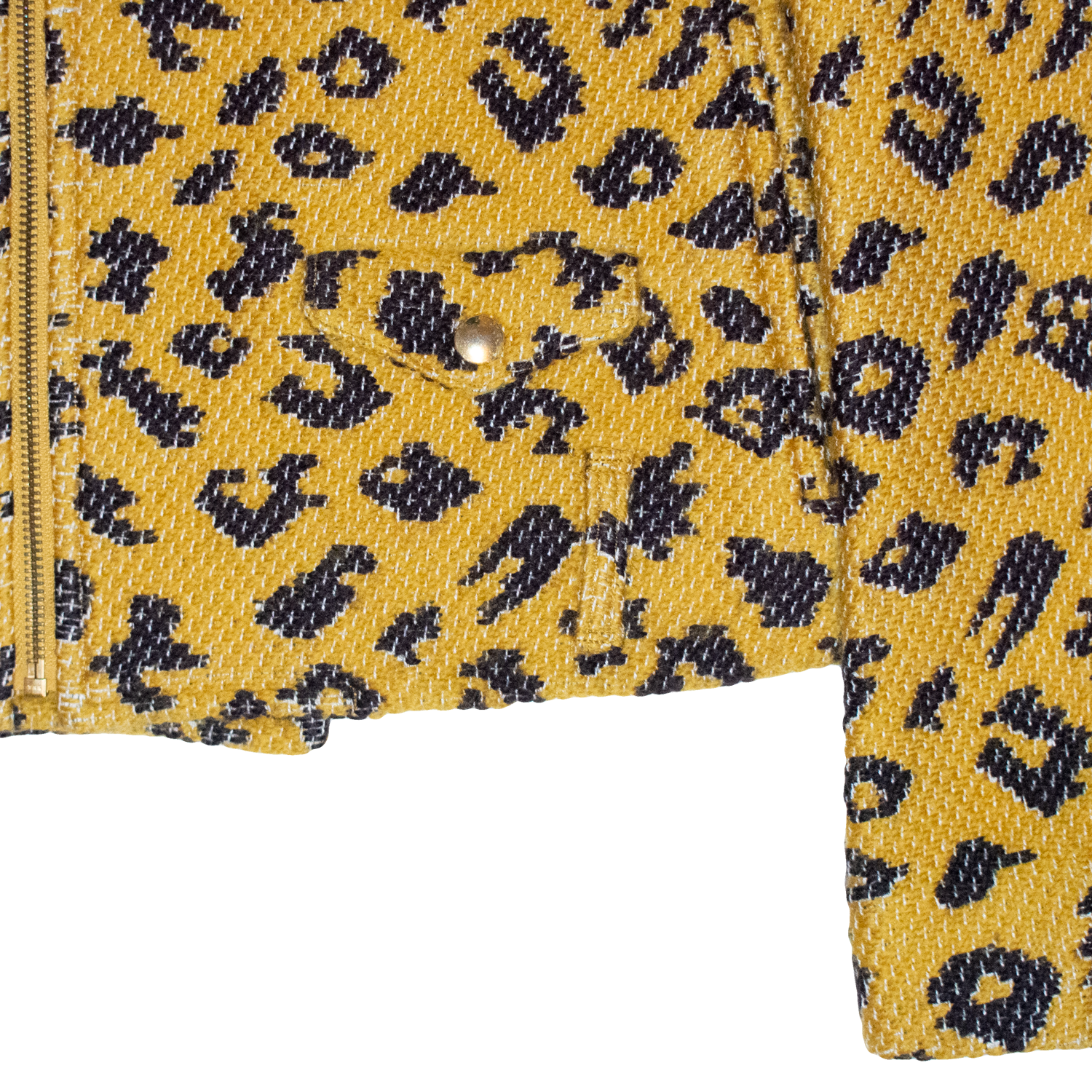 Here we have a stunning riders jacket from the Japanese brand Né-Net. This piece features an encapsulating leopard print in an all-over print fashion, complemented by high-quality yellow/black thick woven wool. The garment boasts a timeless riders jacket silhouette that includes asymmetric YKK zippers, functional pockets, folded snap-down collar, and a somewhat cropped fit. With its many unorthodox flares, this piece by Né-Net is a unique take on the “classic” motorcycle jacket.