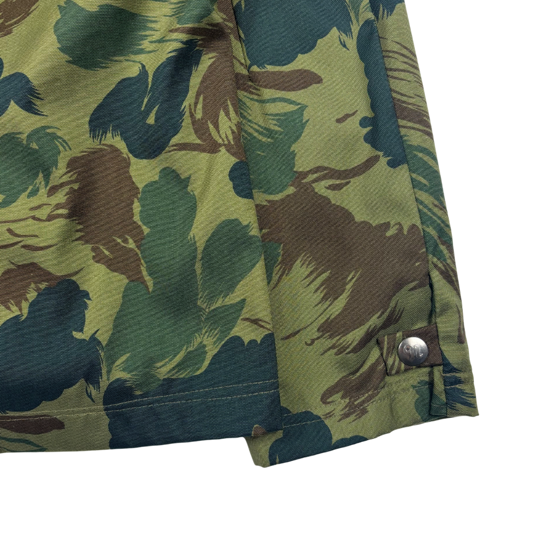 This rare women's (red tag) jacket by Number (N)ine from 1998 fuses military/hunting aesthetics from its painterly camouflage with high-concept tailoring. It features a packable hood that stows into the collar, a single front pocket, RiRi zipper’s, adjustable snap cuffs with branded hardware, and subtle seam detailing that gives it a softly tailored, almost blazer-like silhouette.