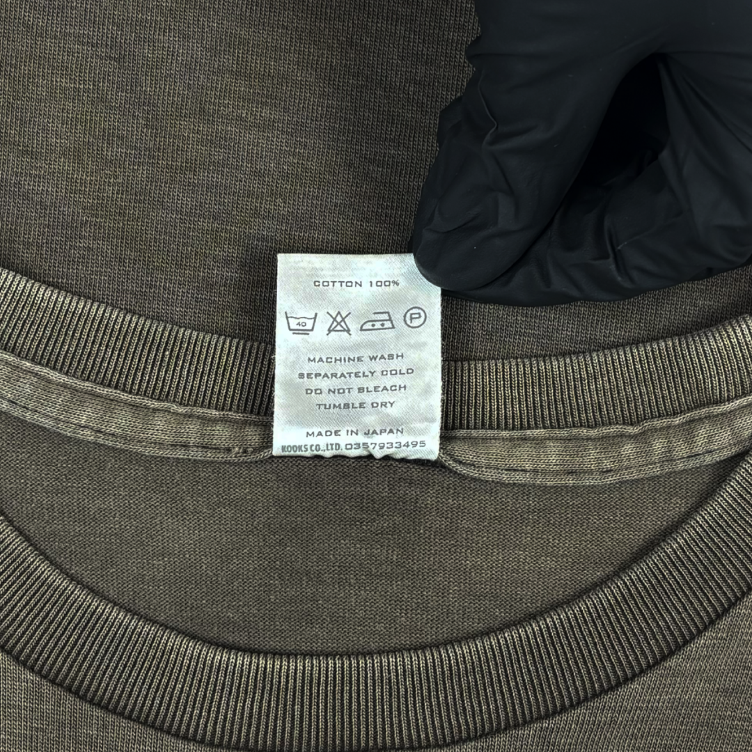This t-shirt from Number (N)ine’s Spring/Summer 2001 ‘Time Migration’ collection features a front pocket with “Cigarettes!” screen-printed atop an elegantly faded high-quality 100% Japanese cotton t-shirt made in Japan. This piece also features the brand’s notable bullet hole/burn distressing motif on both the front and back of the garment.