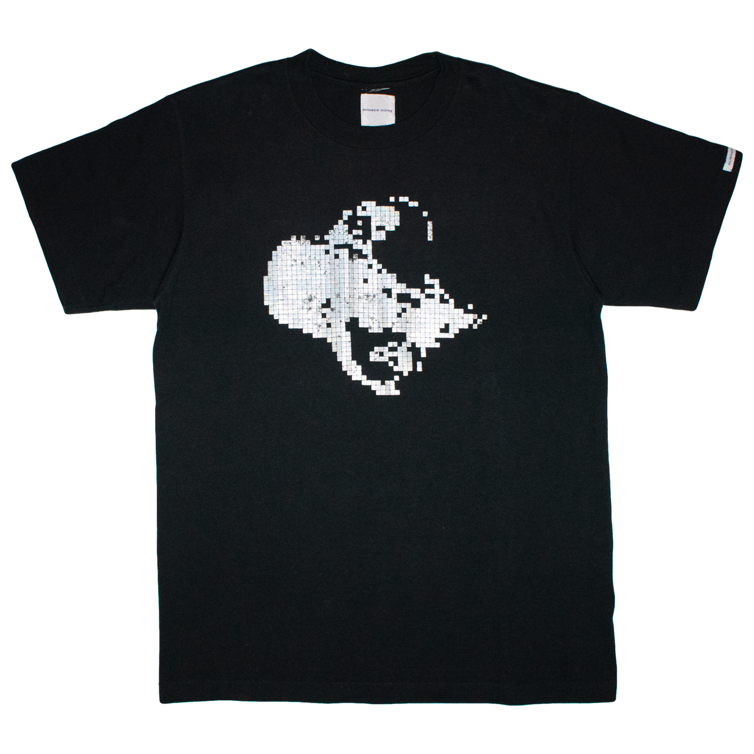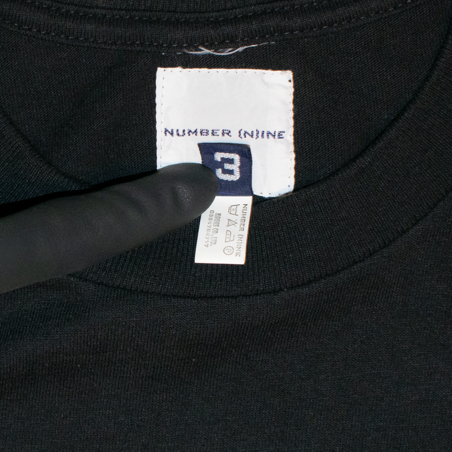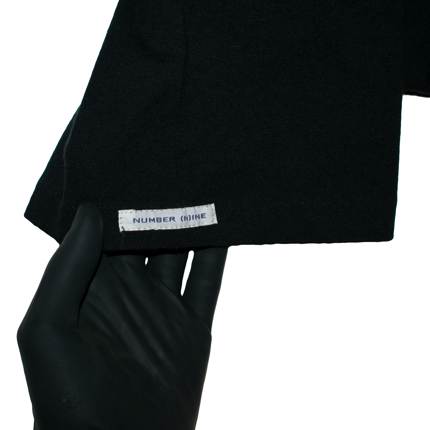 Here we have a rare t-shirt from Number (N)ine’s Fall/Winter 1999 “Rock” collection. This piece features a unique digi-cowboy graphic screen-print with a foil-like color that makes the image really pop. What makes this graphic so interesting is its two-way ambigram-like properties – If you flip the graphic upside-down, some say you can see a silhouette of a man wearing a cowboy hat in a nodding motion. This is a reference to a popular 1964 interview with Paul McCartney and The Beatles on a local Dallas, TX news channel. While this is totally speculative, the reference pic is on my story so let me know what you think!